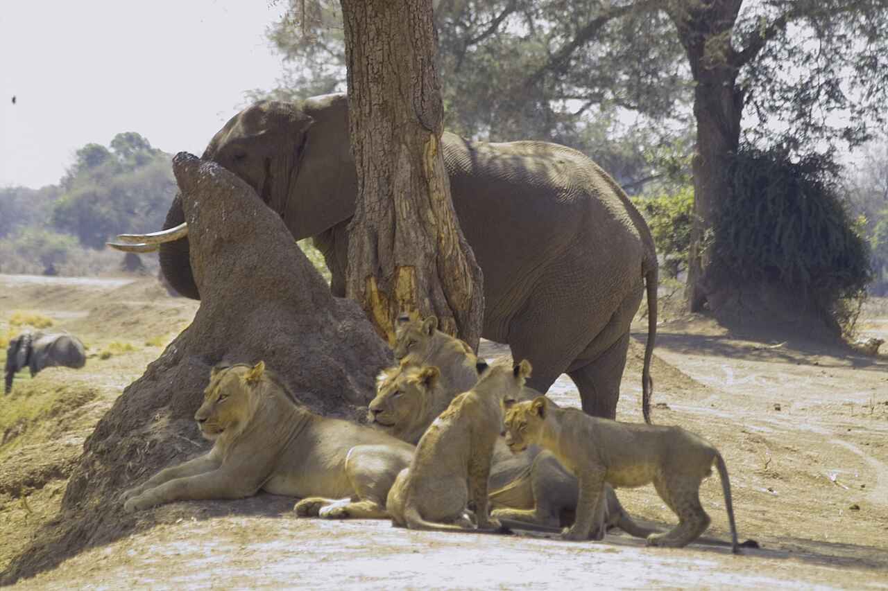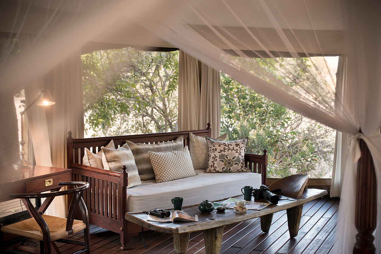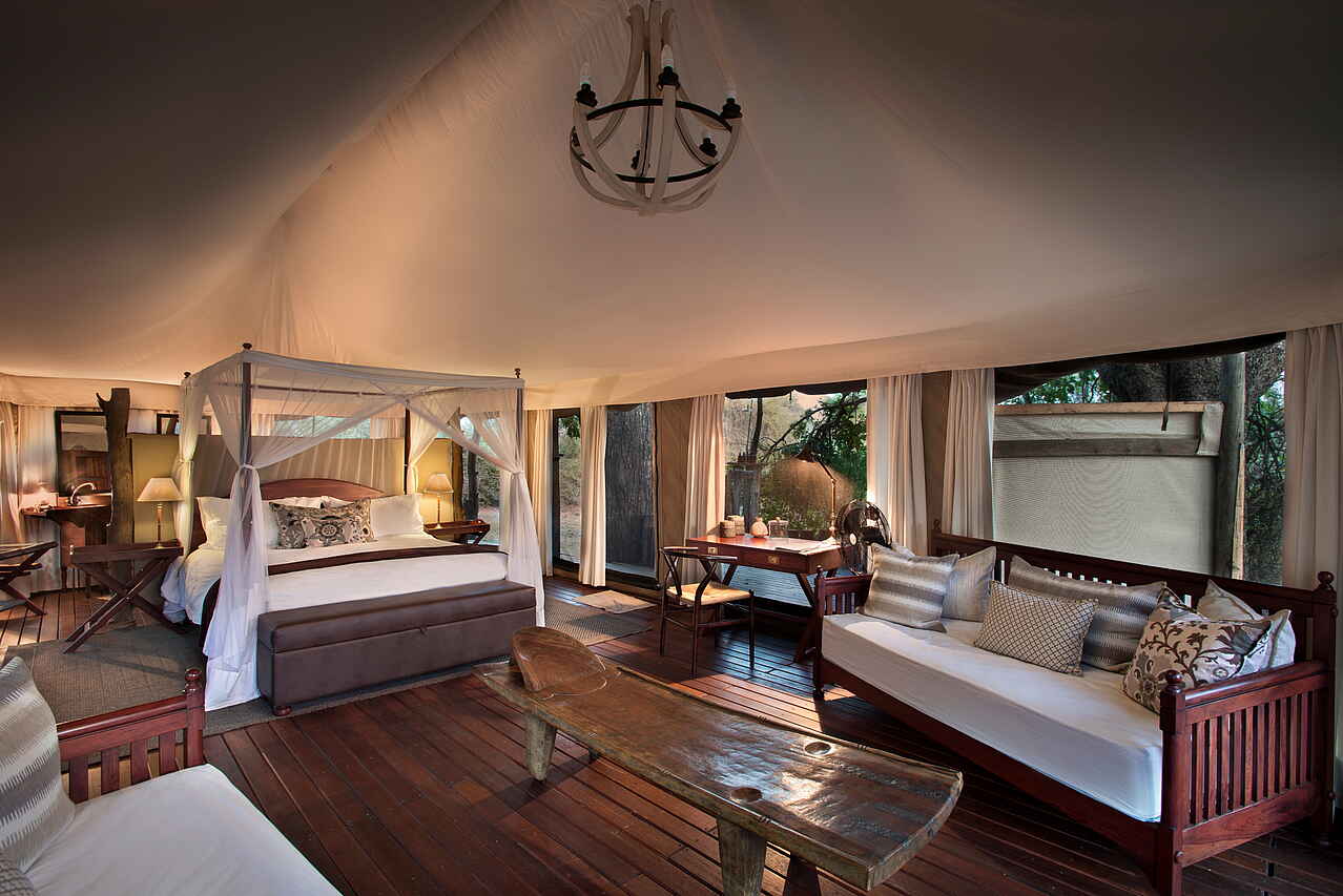 Mitten im Mana Pools National Park in Simbabwe, 15 Kilometer vom Sambesi entfernt und in unmittelbarer Nähe zum meist trockenen Flussbett des Ruckomechi River und der Chitake Springs.