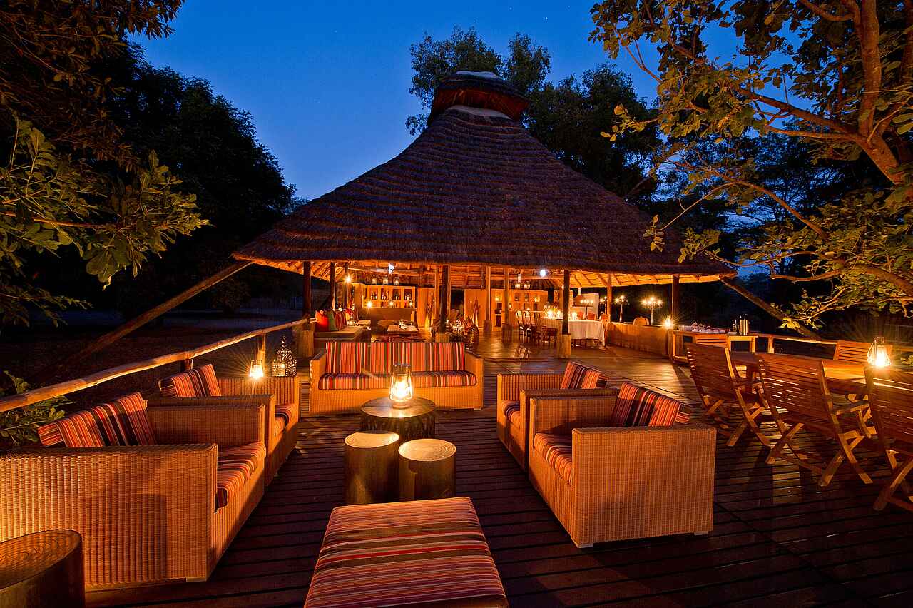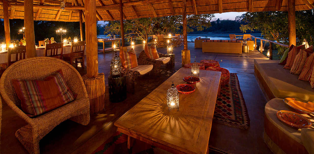 Zentraler Bereich Stein auf Stein gebaut, zum Fluss offen gestaltet, große weitläufige Terrasse zum Fluss gerichtet, Tafel und Lounge unter freiem Himmel, ebenso Tafel und Launge im mit Reet-gedeckten zentralen Bereich, Hocker und Bänke bieten außerdem Sitzgelegenheit, voll ausgestattete Bar, Bücherboard mit Literatur, begrenzt Wäscheservice, geöffnet von April bis Januar.