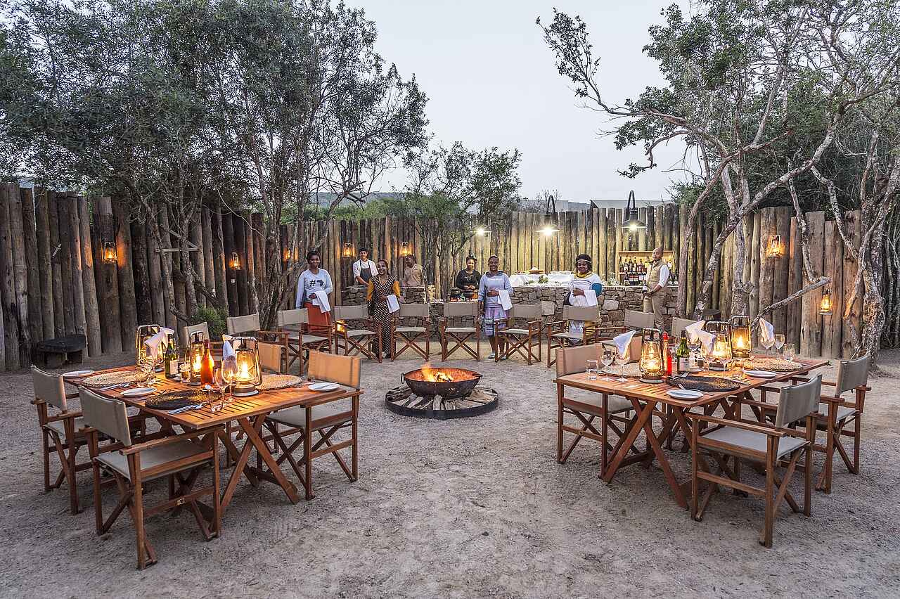 Alle Mahlzeiten und Getränke sind in der Kariega Settlers Drift Tented Lodge inkludiert; Mahlzeiten werden entweder gemeinsam im Speisezimmer eingenommen, an Tischen rund um die Boma oder bei Picknicks in der Wildnis.
