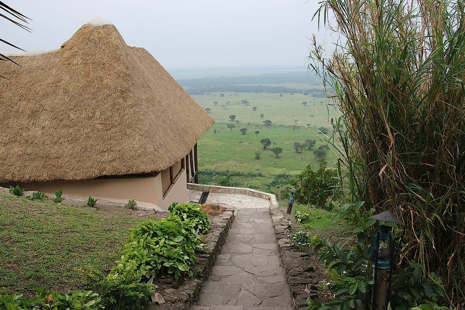 Schöne Anlage mit weitläufigen Blick auf die Savanne und den Edward-See. Beobachtung zahlreicher Tierarten in unmittelbarer Nähe zur Lodge. Über 600 unterschiedliche Vogelarten und ca. 100 Säugetierarten. Fluss-Safari zwischen Lake Edward und Lake George.