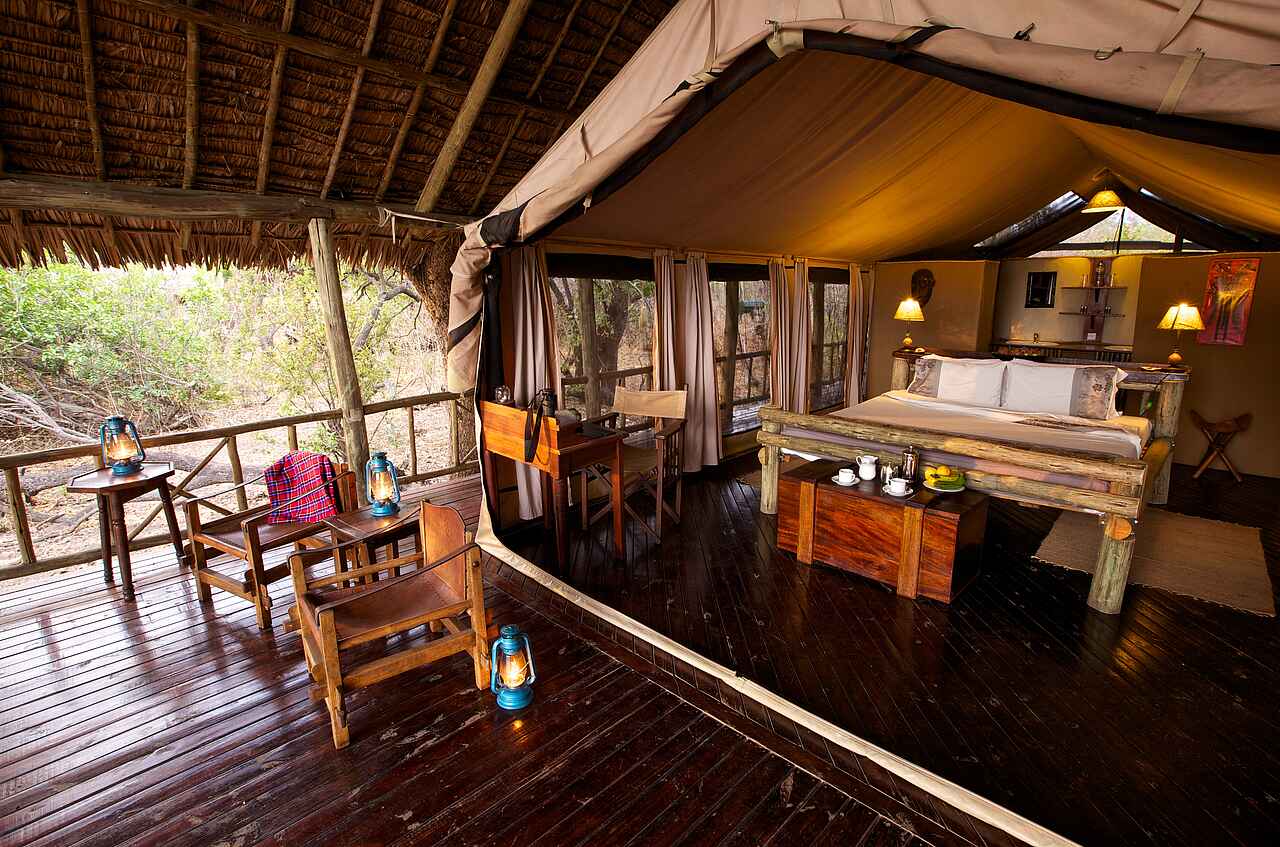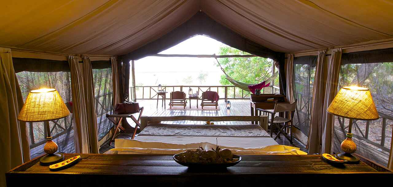 Insgesamt gibt es 8 Gästezelte mit Kingsize-Betten aus Holz auf Plattformen (ca. 1/2m über dem Boden) unter reetgedeckten Dächern. Darin enthalten sind 5 Doppelzimmer und 3 Twin-Zimmer. Zu jedem Zelt gehört ein eigenes Bad mit Doppelwaschbecken, Toilette und Warmwasser-Dusche sowie eine private Veranda mit Hängematte und Stühlen. Ein elektronischer Safe ist ebenfalls vorhanden. In jedem Zelt gibt es einen kleinen Schreibtisch und eine Gepäckablage. Durch die Lage am Waldrand, garantieren die Zelte beste Möglichkeiten, um getarnt Wildtiere beobachten zu können. Fenster befinden sich vorne und an der Seite eines Zimmers und sind mit Moskito-Netzen bedeckt. Wäsche kann gewaschen werden.