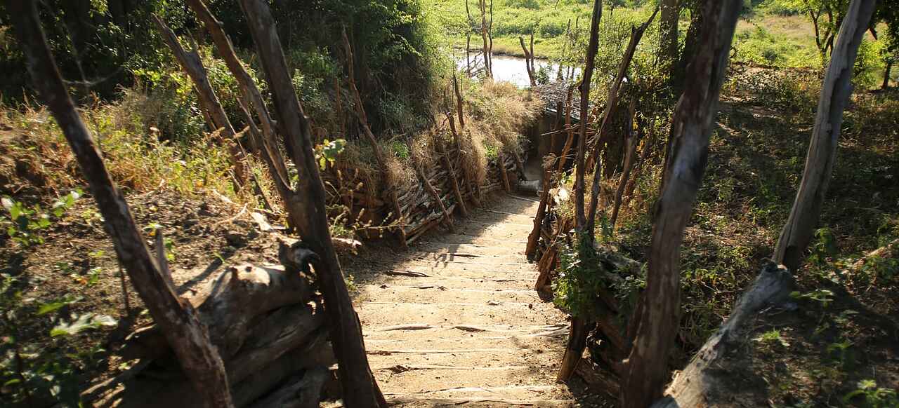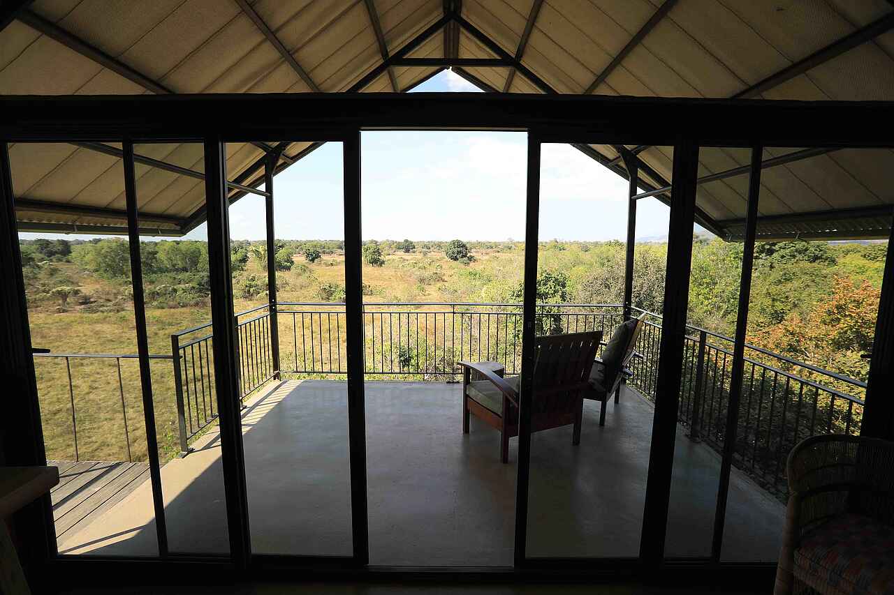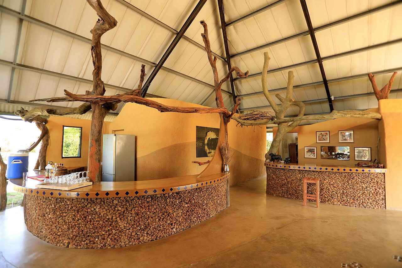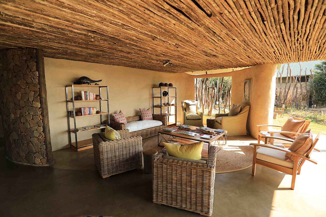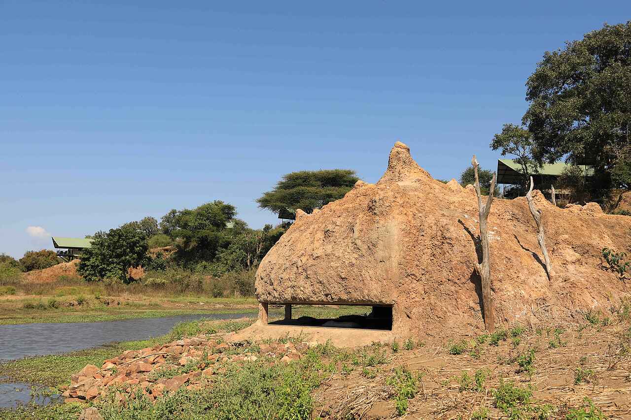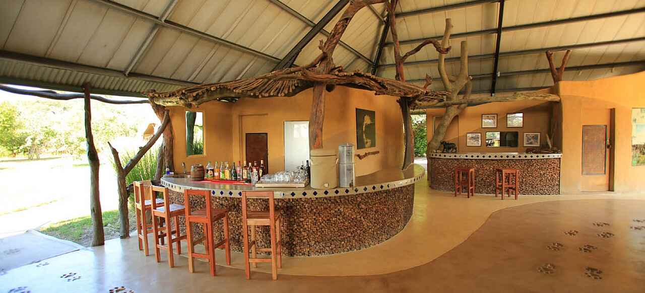 Das Hauptgebäude steht an der Böschung zu einer flachen Pfanne am Rande des Ruckomechi River. Das Gebäude hat zwei Etagen. Die obere Etage dient mit ihrem Blick primär der Entspannung. Auf der unteren, ebenerdigen Etage gibt es eine Bar, einen Empfangsbereich, eine weitere Veranda, eine kleine Lounge, sowie einen Speisebereich mit ein paar Tischen. Der Boden ist zementiert, "Löwenspuren" wurden vor der Härtung in den frischen Zement gedrückt. Die Wäde sind hellgelb gestrichen. Stützen und Blenden sind teilweise in unverfugtem Naturstein gehalten. Eine Steintreppe führt hinauf zur oberen Etage. Insgesamt mutet die Einrichtung zwar warm und freundlich aber auch etwas spartanisch an. Beobachtungsunterstand am Ufer des Ruckomechi River.