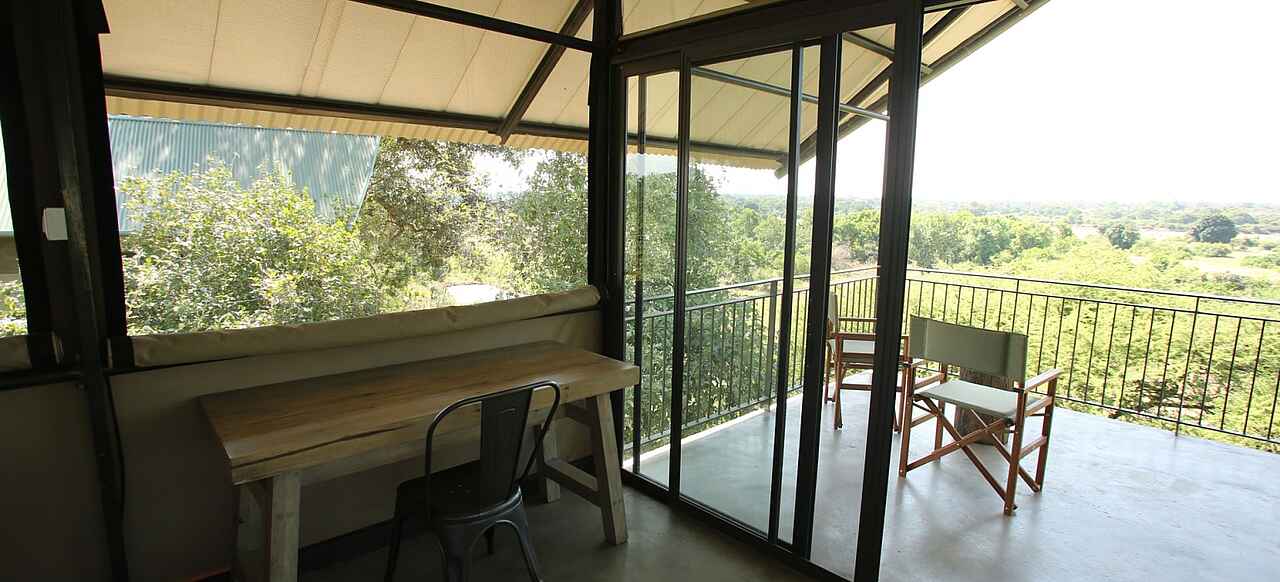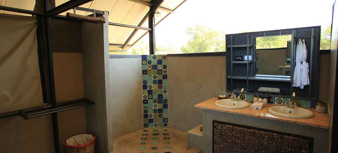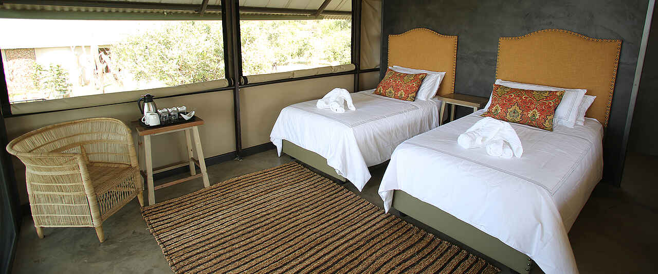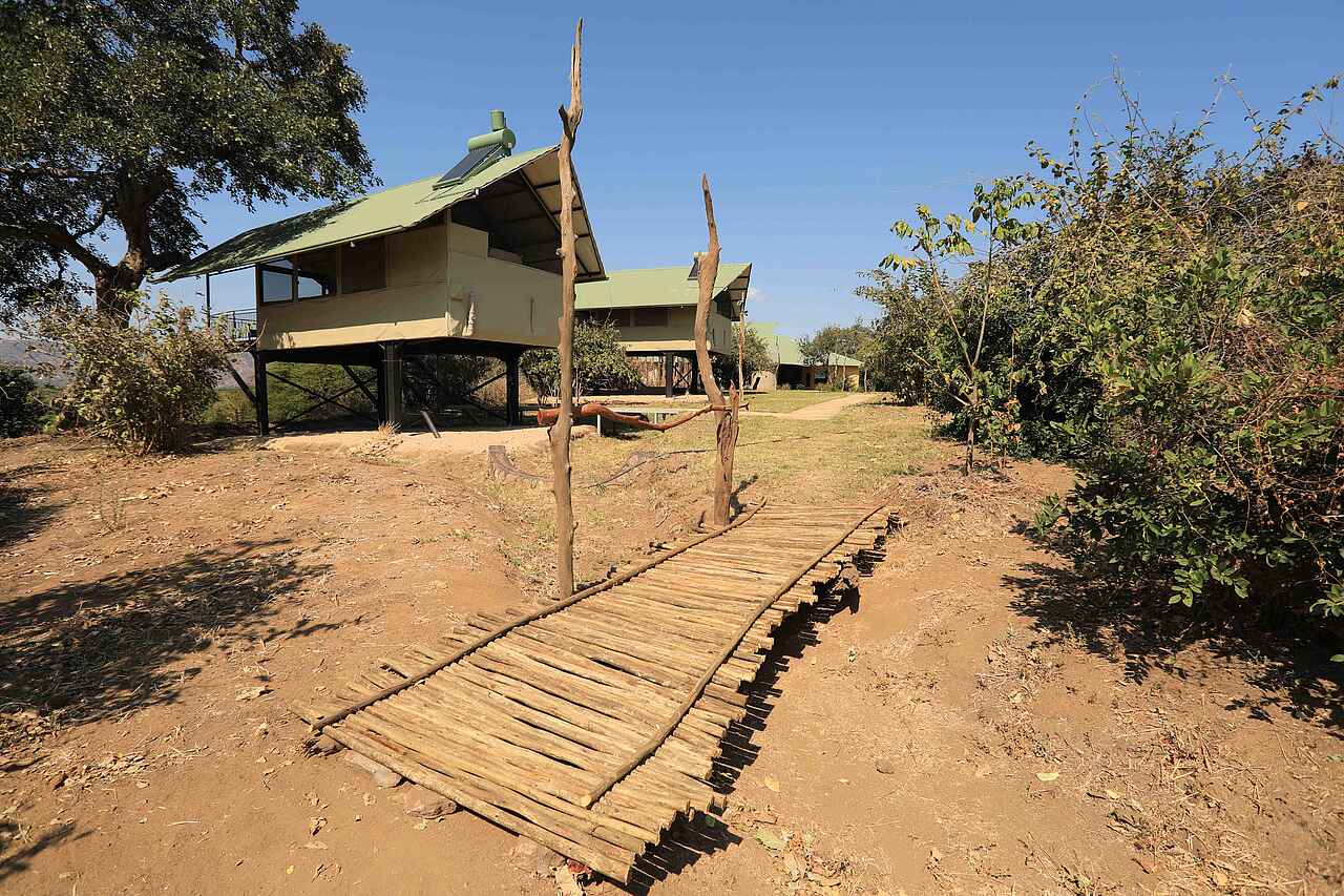 Die 7 Zelte für bis zu 14 Gäste - 3 nördlich und 4 südlich vom Hauptgebäude - stehen entlang der Böschung oberhalb der Pfanne auf ca 1m hohen Stahlgerüstplattformen und sind nach Osten orientiert, so dass man den Sonnenaufgang über dem Sambesital sehen kann. 7-8 Stufen führen zu den Zelten hinauf. Betten sind als Einzel oder Doppel konfigurierbar. Sie stehen unter Moskitonetzen. Das gesamte Zelt ist mit Gitternetzen nach außen vor Insekten geschützt. Eine Schiebetür führt hinaus auf die Veranda mit Blick auf das Ruckomechi Flussbett und das weite Sambesital. Zwei Regiesessel stehen bereit. Alle Gästezelte verfügen über private Bäder mit Doppelwaschtisch, dekorativ gefliester Dusche und fließend Kalt- und Warmwasser. Der Abstand zwischen den Zelten beträgt zirka 15m. Wäscheservice für kleine Mengen. Steckdosen im Zelt, um Kameras zu laden.