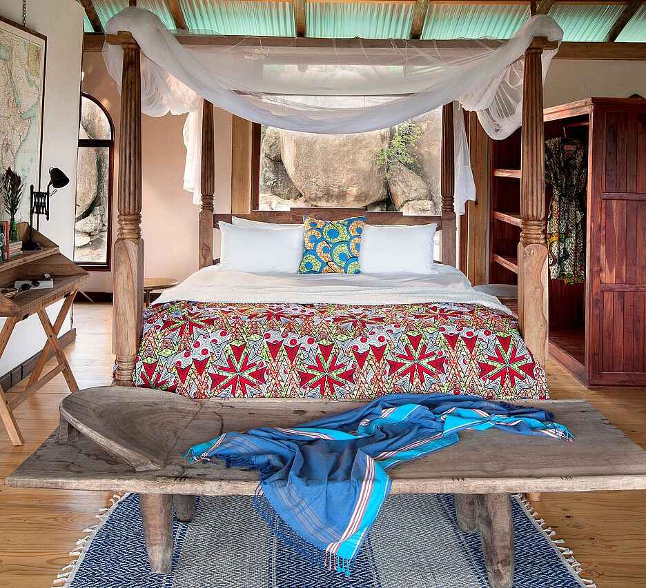 Jedes der vier Zimmer bietet fantastische Aussichten und ist komfortabel ausgestattet. Ein Himmelbett mit Moskitonetz-Baldachin, liebevolle Deko, eine private Veranda zum Relaxen sowie eine freistehende Badewanne sorgen für ein Wohlfühlgefühl. Außerdem Bad mit WC, Dusche und Waschtisch mit zwei Waschbecken. Ladestationen für elektronische Geräte gibt es ebenso wie einen Ventilator.