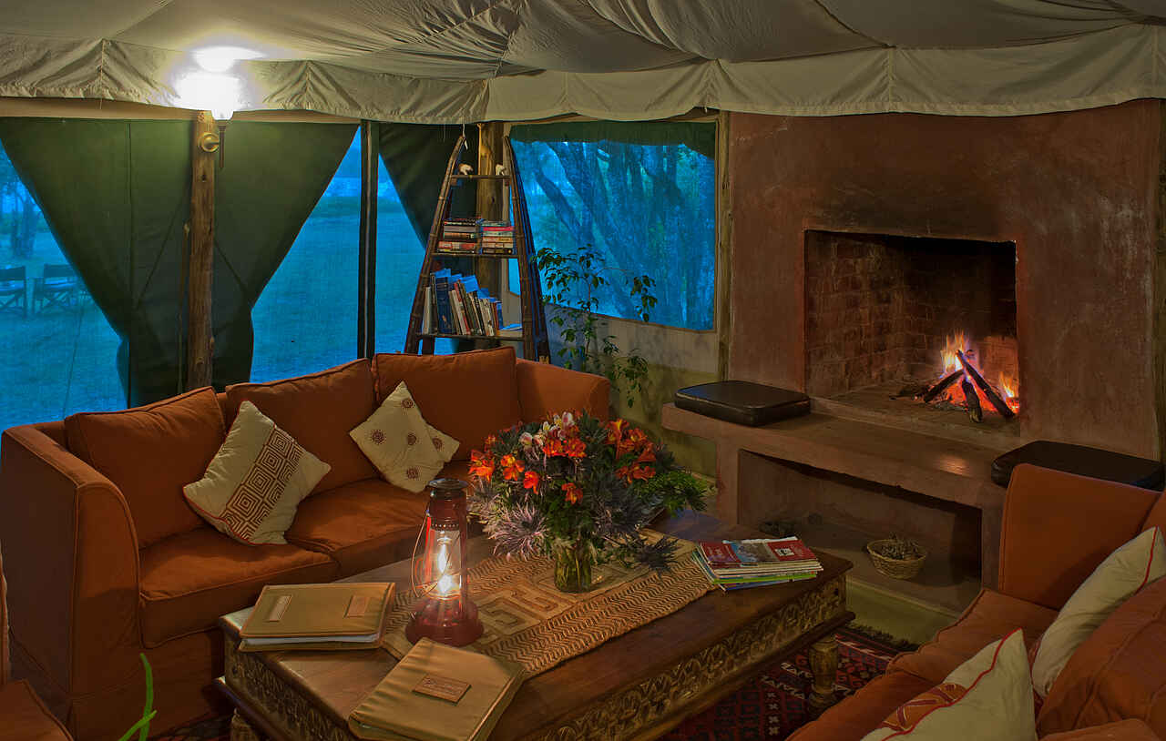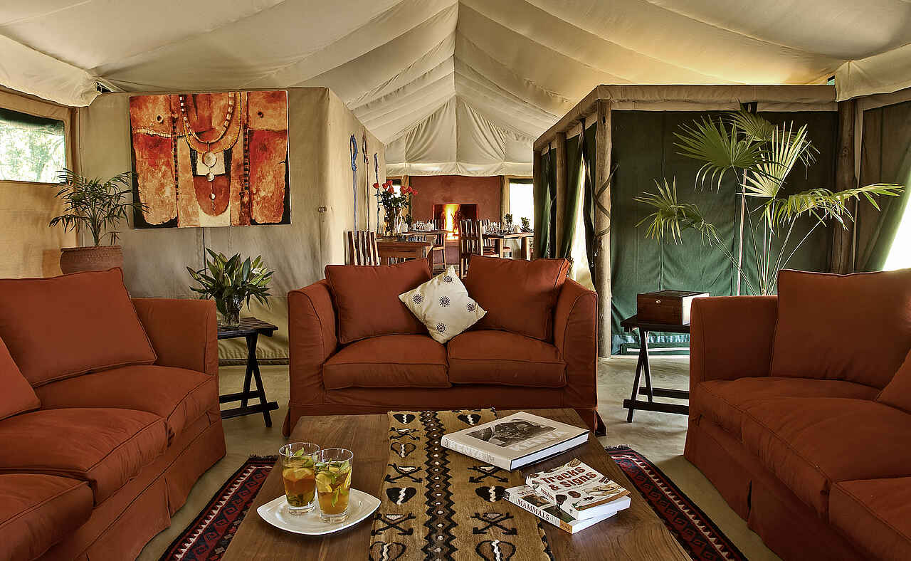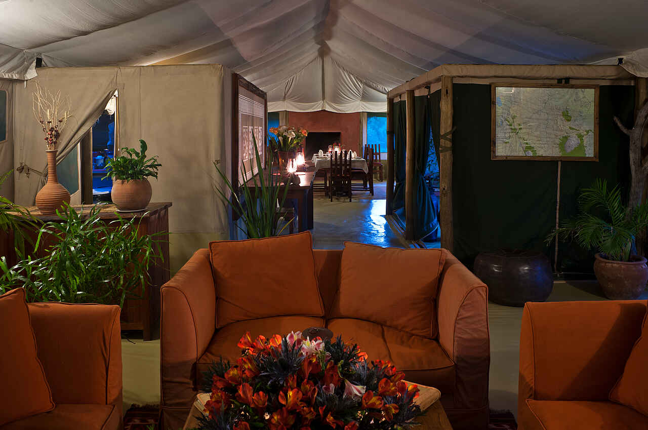Das Camp bietet zwei miteinander verbundene Hauptzelte: die Lounge und das Speisezelt mit einer Bar und einer Feuerstelle, die auf einer leicht erhöhten Holzplattform errichtet wurden. Hier können elektrische Geräte aufgeladen und E-Mails gecheckt werden. Es herrscht teilweise Handyempfang, wobei die Benutzung von Mobiltelefonen im zentralen Aufenthaltsbereich nicht erwünscht ist. Die Zelte sind jeweils mit einem Kamin ausgestattet und mit dunklen Holz- und hellen Polstermöbeln ausgestattet. Im Speisezelt oder unter freiem Himmel können Einzel- oder Gruppentische aufgestellt werden. In der Lounge stehen Bildbände und Bücher zur Verfügung. Außerdem gibt es eine kleine Boutique mit einer Auswahl an Souvenirs.
