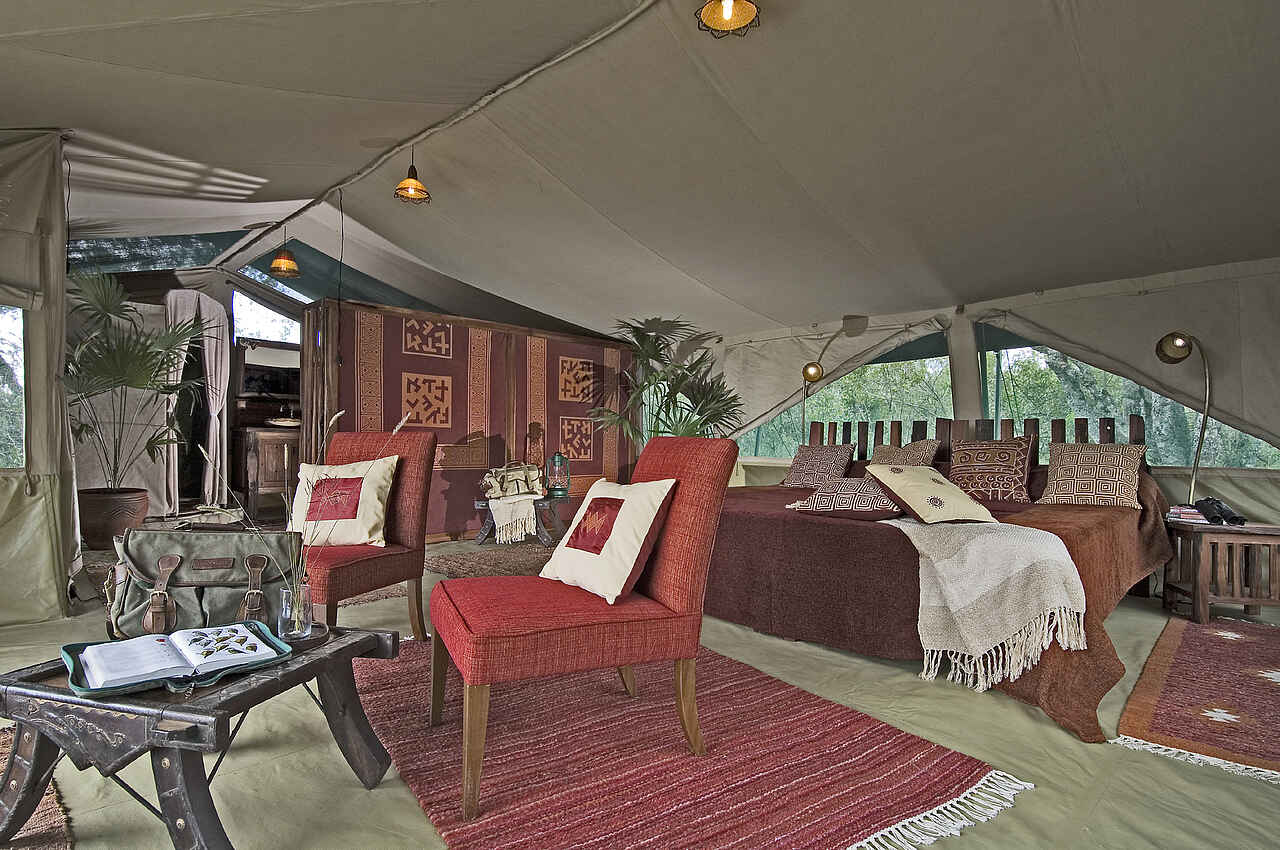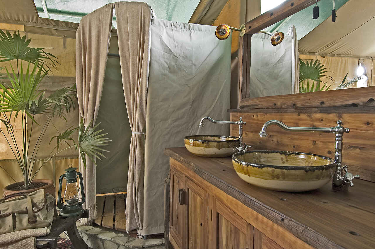 In den sechs, ebenfalls auf Holzplattformen errichteten Gästezelten wurden Doppelbetten, Beistelltische und zwei Sessel aus dunklem Holz aufgestellt. Die Terrasse wartet mit zwei Regiestühlen und einem Klapptisch ebenfalls aus Holz auf. Das en-suite Bad umfasst eine Spültoilette, einen Waschtisch und eine Dusche mit fließendem Warmwasser. Die großen Fenster und Türen der Segeltuchzelte können mit Moskitonetzen und Segeltuchbahnen verschlossen werden. Ein täglicher Wäscheservice ist im Preis enthalten.