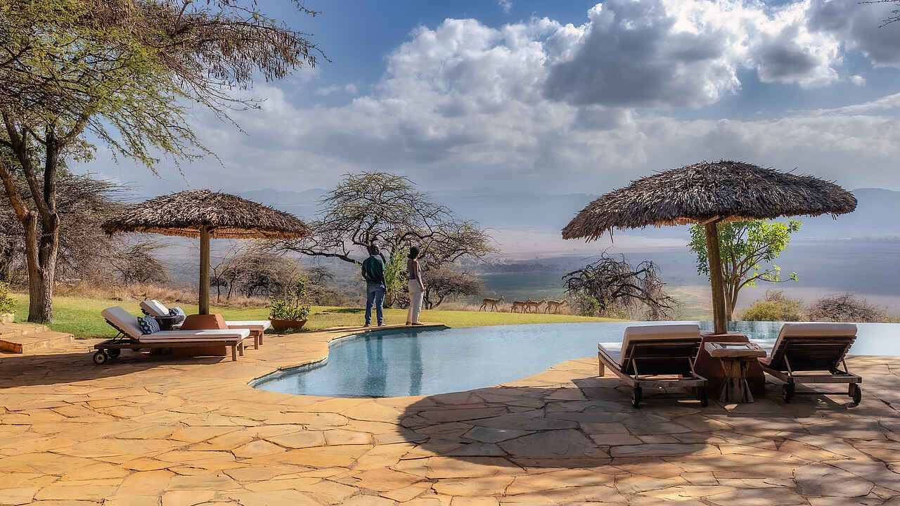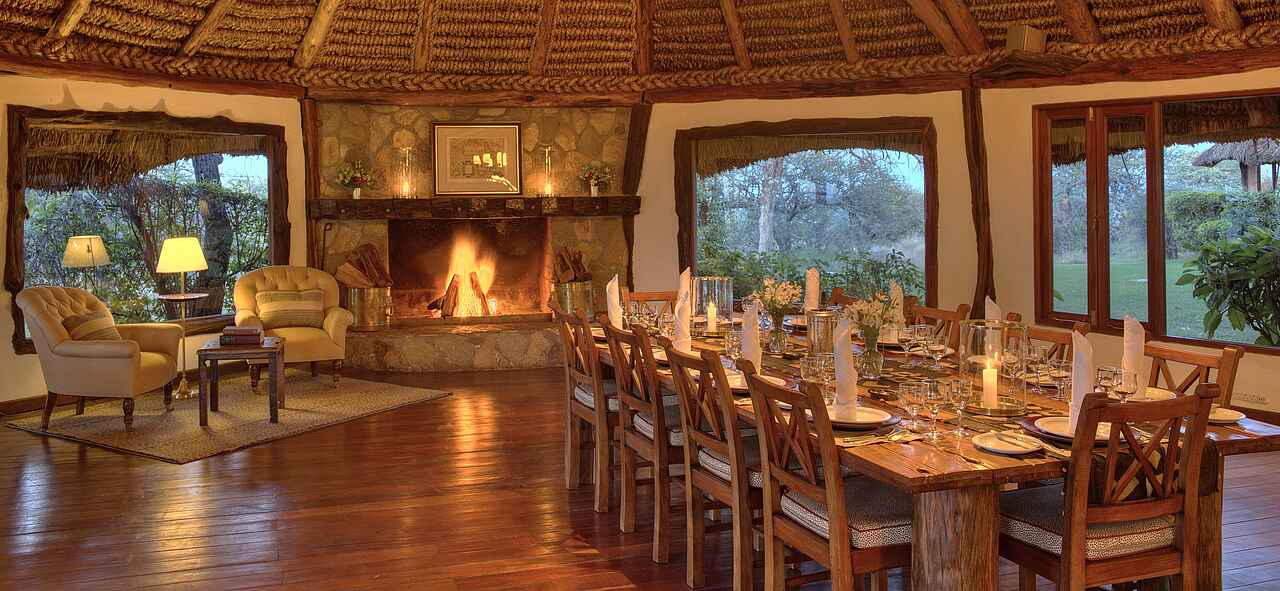 Kifaru House beeindruckt mit stilvollen Gemeinschaftsbereichen, darunter eine Lounge mit komfortablen Sitzgelegenheiten und eleganten Möbeln im traditionellen Safari-Stil. Dieser zentrale Bereich öffnet sich zu einer weitläufigen Terrasse mit atemberaubendem Blick auf die umliegende Landschaft und einem Wasserloch, das von Wildtieren frequentiert wird - ideal für Sonnenuntergänge, Sternbeobachtungen und Tierbeobachtungen beim Frühstück. Eine ausgezeichnete Bibliothek sowie Kaminfeuer in Lounge und Speisebereich sorgen für behagliche Abende in gemütlicher Atmosphäre. Ein großer Swimmingpool mit Liegen und schattigen Plätzen lädt zur Erholung ein. Zusätzlich stehen eine gut bestückte Bar und verschiedene Rückzugsorte zum Entspannen und Genießen der Umgebung zur Verfügung.