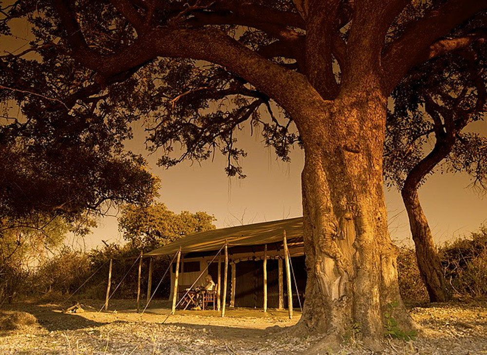 6 Gästezelte mit privaten Bädern, Bucket Shower unter freiem Himmel, aber sichtgeschützt (Warmwasser auf Bestellung), Waschbecken mit Krügen für warmes und für kaltes Wasser, WC. Die Gästezelte stehen ebenerdig. Die Erde ist von Zeltfolie bedeckt, auf denen wiederum Teppiche liegen. Die Zeltwände können komplett und allseitig mit Reißverschlüssen geöffnet werden. Die Innenseite sind jeweils insektenfeste Netze. Besondere Moskitonetze gibt es nicht. Unter einem Zeltvordach stehen jeweils zwei Stühle und ein Tisch. Für den bestmöglichen Schutz gegen hohe Mittagstemperaturen haben die Zelte ein doppeltes Dach. Zwei große Einzelbetten lassen sich zu ebenfalls sehr großen Doppelbetten zusammenschieben.