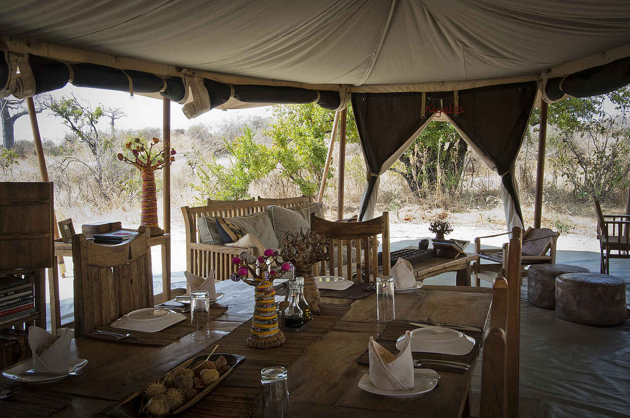 Das Hauptgebäude ist tatsächlich einfach ein großes Zelt und steht ebenerdig etwa mittig zwischen den sechs Gästezelten aber etwas zurückgesetzt vom Ufer des Ifuguro River. Es gibt einen großen Esstisch, sowie eine Sitzgruppe. Das Zelt ist rundherum offen. Der Boden ist mit Teppichen ausgelegt. Die Möbel sind rustikal aus hellem Holz geschreinert.