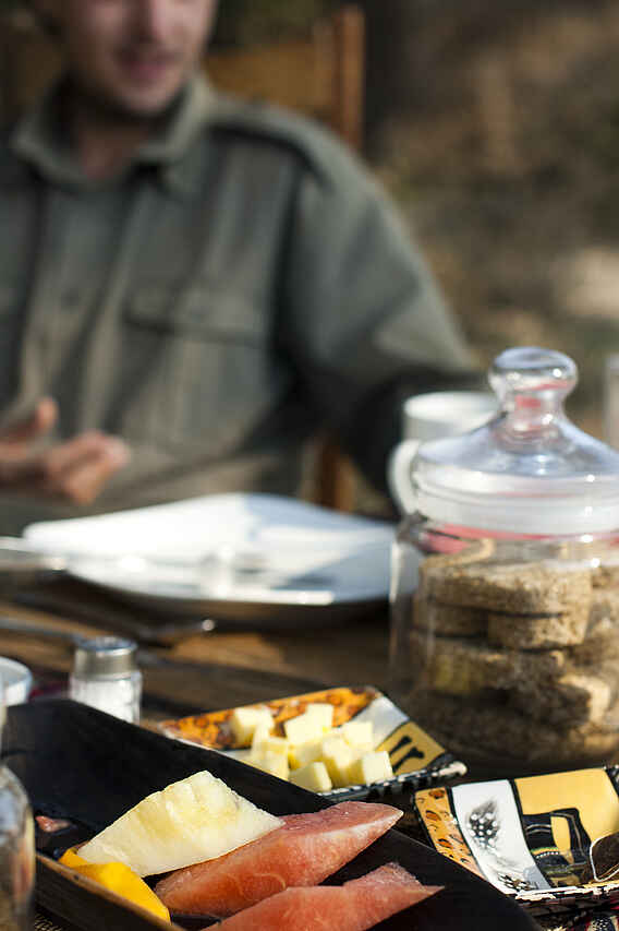 Im Kigelia Camp werden drei Mahlzeiten pro Tag angeboten: Frühstück - manchmal am Feuer beim Camp, aber meist draußen im Busch, Lunch mit herzhaften und pikanten Speisen, sowie ein 3-Gänge-Dinnermenü. Die Mahlzeiten sind einfach, aber schmackhaft und bekömmlich. Je nach Aktivität gibt es am Lagerfeuer oder im Busch einen Sundowner.
