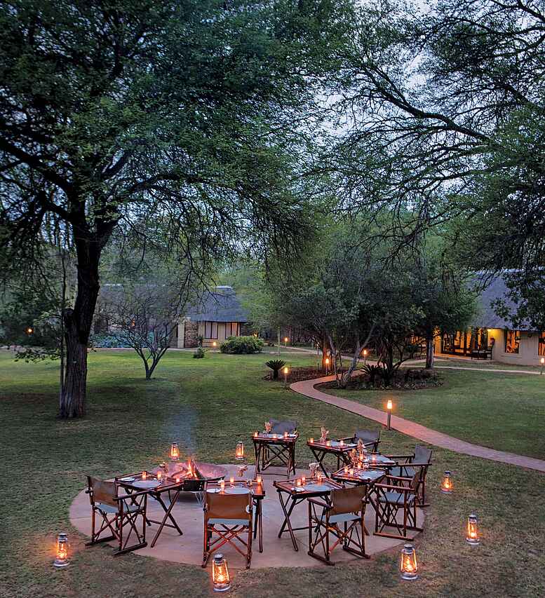Frühstück, Mittagessen und Abendessen, serviert am Tisch im Restaurant oder auf der Terrasse. Regelmäßige Boma mit Braai, Morgensnack und Coffeestop auf Pirschfahrt, High Tea vor der Pirschfahrt und Sundowner. Das Waterbuck Private Camp mit gemeinsamen Essenstisch, privater Küche und Chef. Lokale und internationale Küche, alle Diäten werden berücksichtigt, bitte anmelden. Alle Mahlzeiten und Getränke inklusive, auch alkoholische Getränke, außer Premiummarken wie spezielle Weine, spezieller Whiskey oder Champagner.