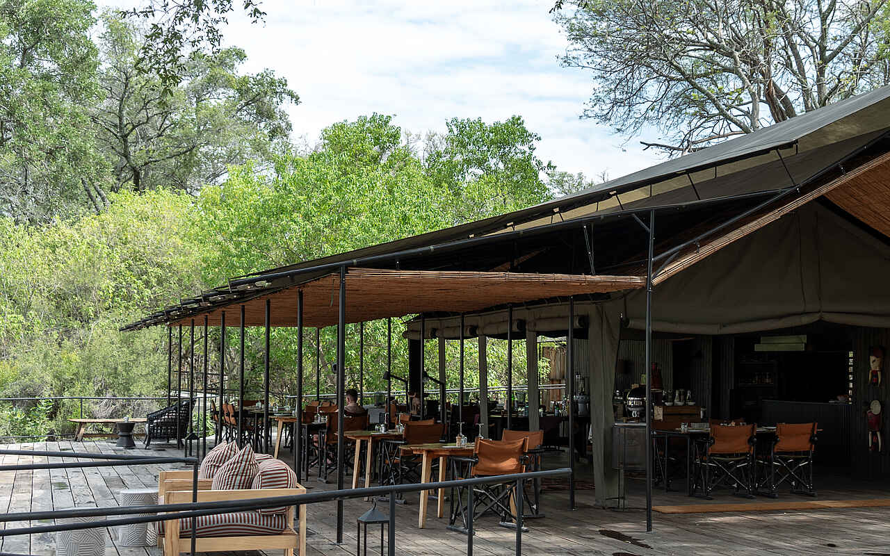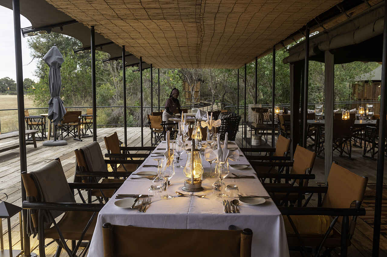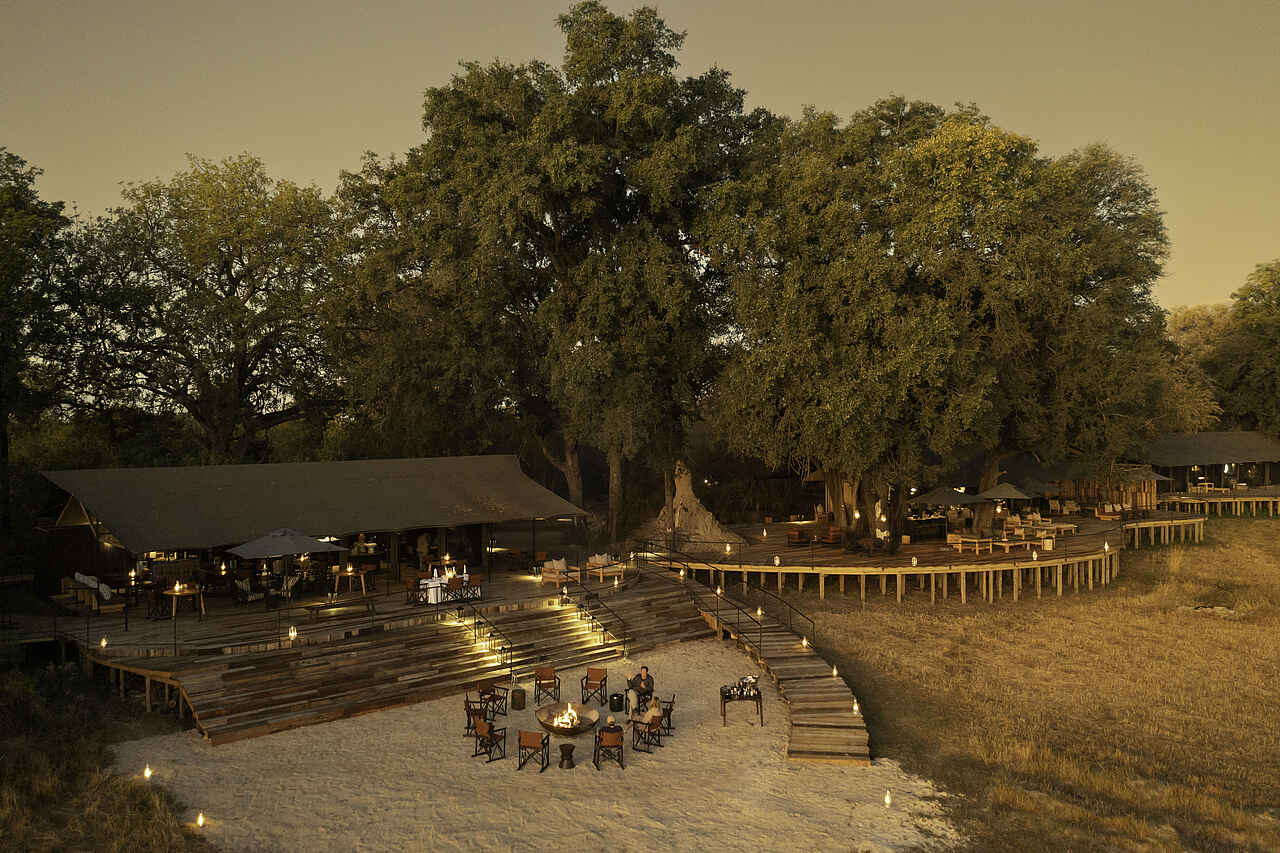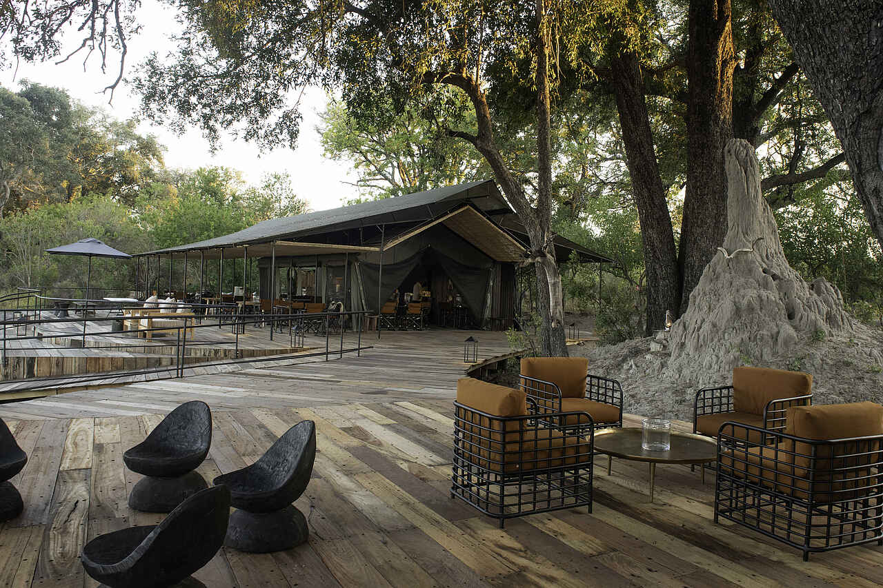 Der zentrale Bereich des Kiri Camps ist offen gestaltet und auf die umliegenden Wasserflächen ausgerichtet. Lounge und Essbereich gehen fließend ineinander über und bilden den kommunikativen Mittelpunkt des Camps. Bequeme Sitzgruppen, Naturmaterialien und dezente Farben schaffen einen entspannten Rahmen zwischen den Aktivitäten. Eine Bar mit einer guten Auswahl an Getränken ist ganztägig zugänglich. Die großzügige Terrasse dient als Treffpunkt für Mahlzeiten, Sundowner und Gespräche nach den Safaris. Ein Swimmingpool sorgt für Abkühlung während der heißen Tageszeiten. Abends wird häufig in der Boma gegessen, wo der Tag am Feuer ausklingt.