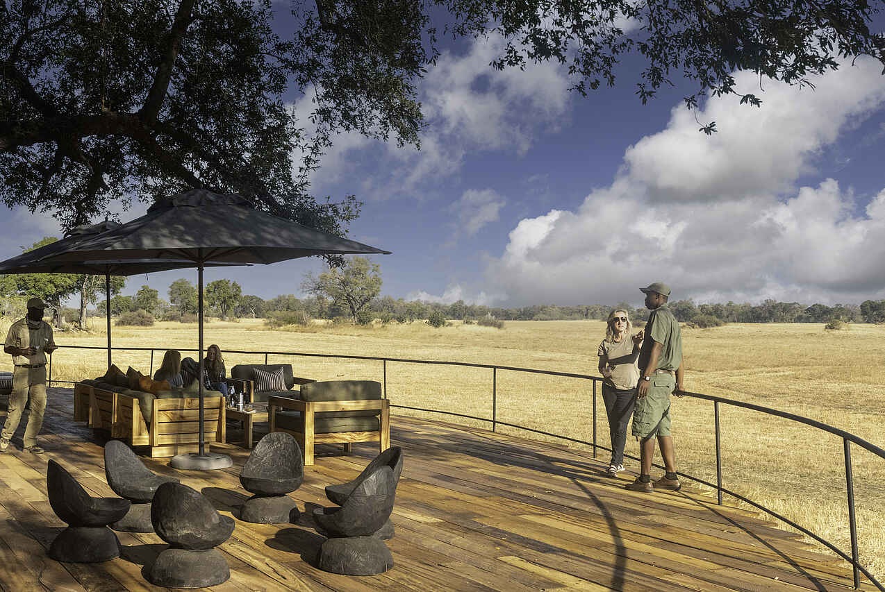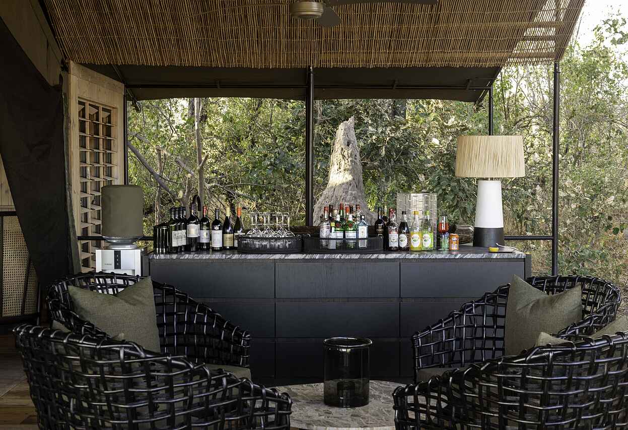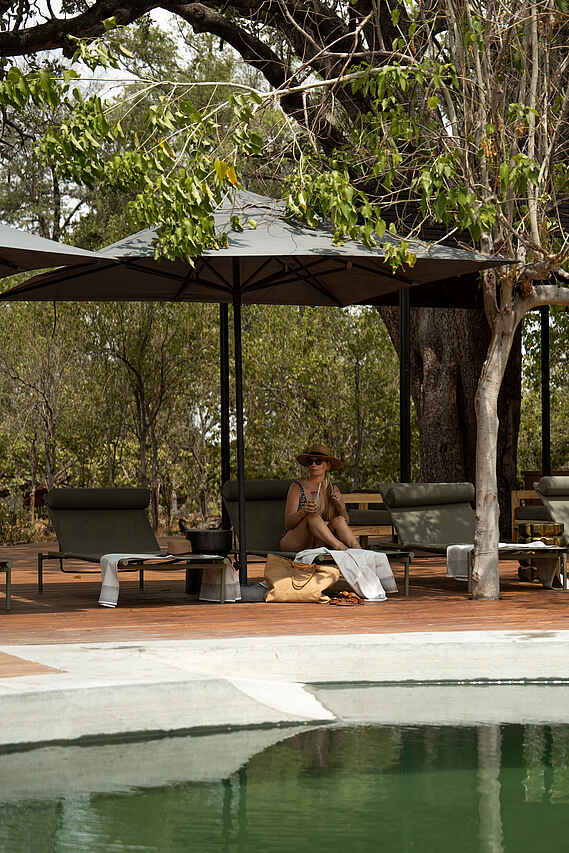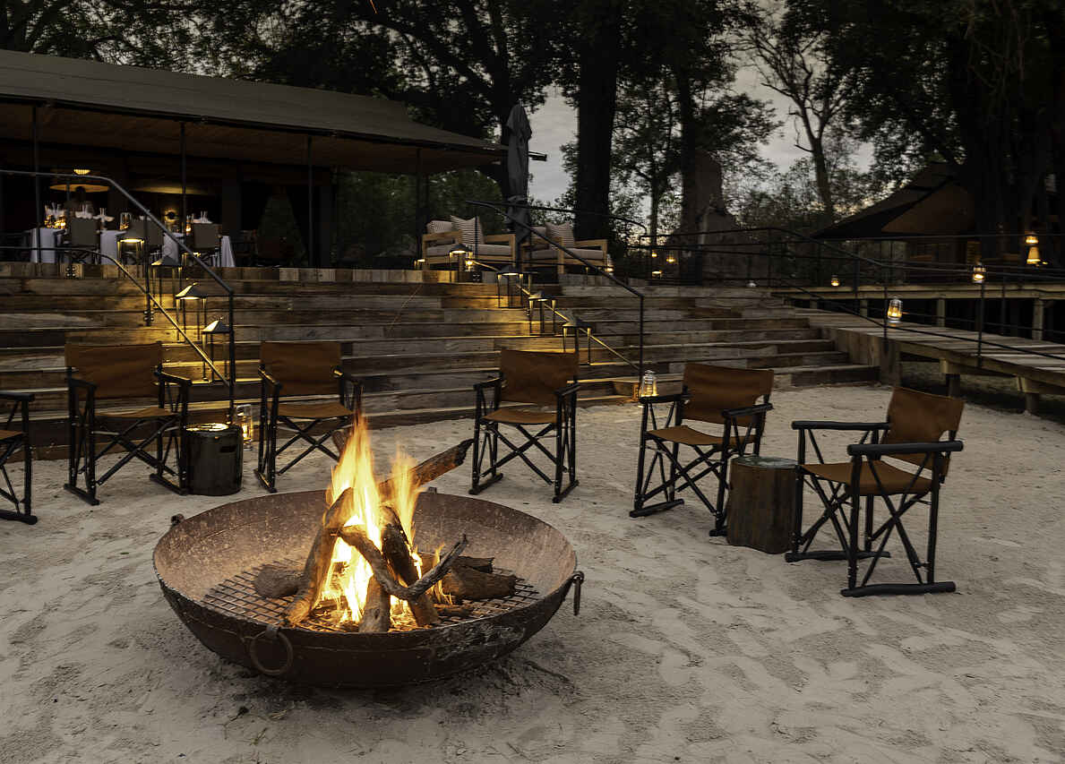 Der zentrale Bereich des Kiri Camps ist offen gestaltet und auf die umliegenden Wasserflächen ausgerichtet. Lounge und Essbereich gehen fließend ineinander über und bilden den kommunikativen Mittelpunkt des Camps. Bequeme Sitzgruppen, Naturmaterialien und dezente Farben schaffen einen entspannten Rahmen zwischen den Aktivitäten. Eine Bar mit einer guten Auswahl an Getränken ist ganztägig zugänglich. Die großzügige Terrasse dient als Treffpunkt für Mahlzeiten, Sundowner und Gespräche nach den Safaris. Ein Swimmingpool sorgt für Abkühlung während der heißen Tageszeiten. Abends wird häufig in der Boma gegessen, wo der Tag am Feuer ausklingt.