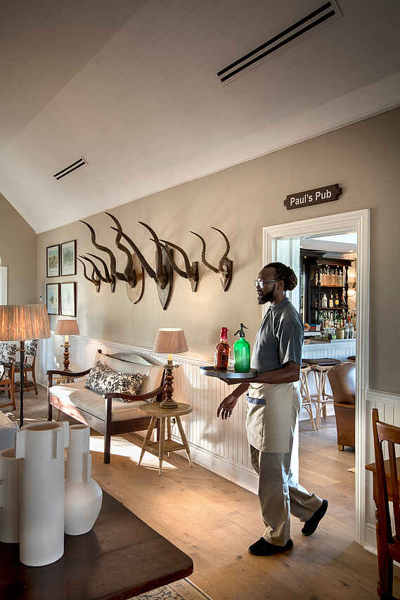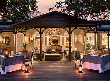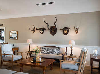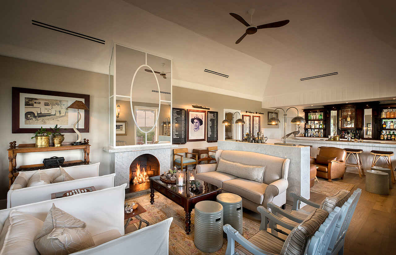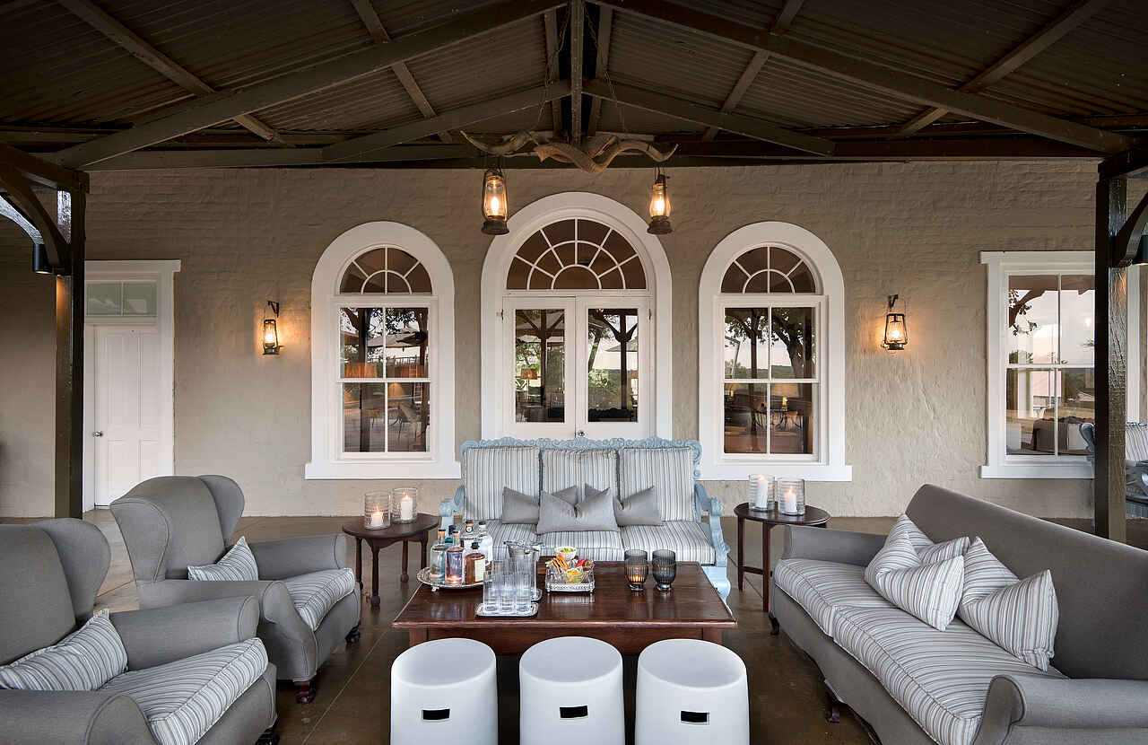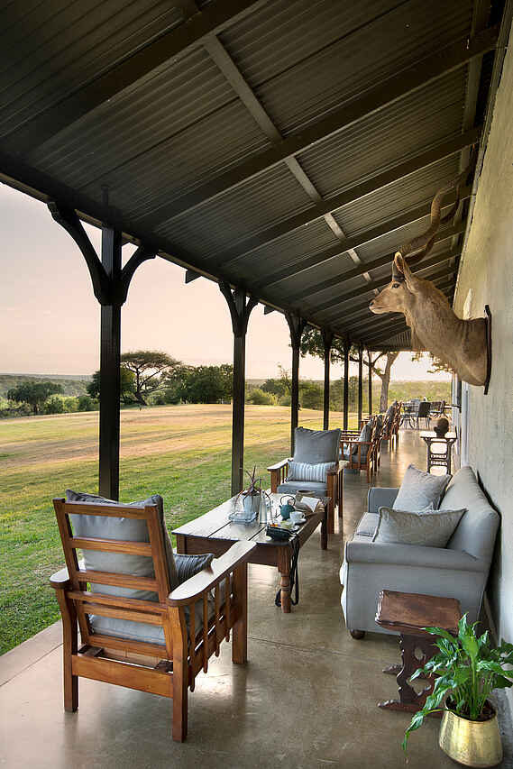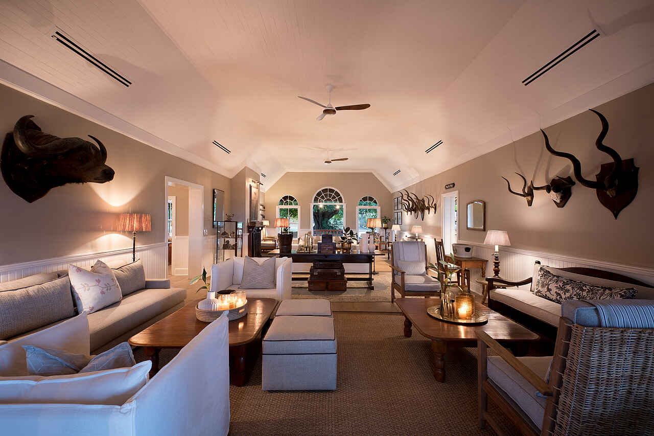 Der zentrale Bereich der Kirkman’s Kamp Lodge befindet sich im historischen Haupthaus mit großer Veranda und weitem Blick über das Tal des Sand River. Die offene Lounge ist mit bequemen Sofas, Sesseln und ausgewählten Antiquitäten eingerichtet und greift den Stil der 1920er Jahre auf. Mehrere Sitzbereiche sowie eine kleine Bibliothek schaffen Rückzugsorte zwischen den Pirschfahrten.