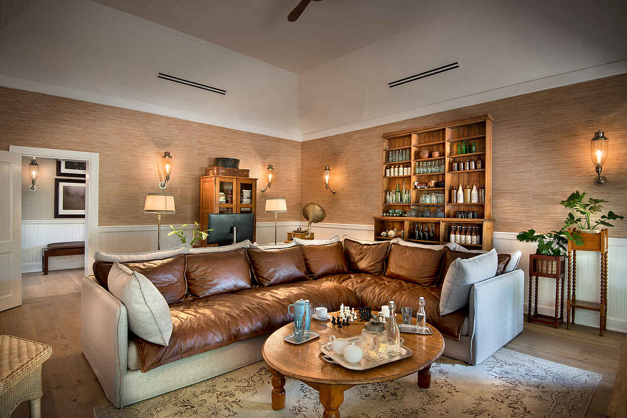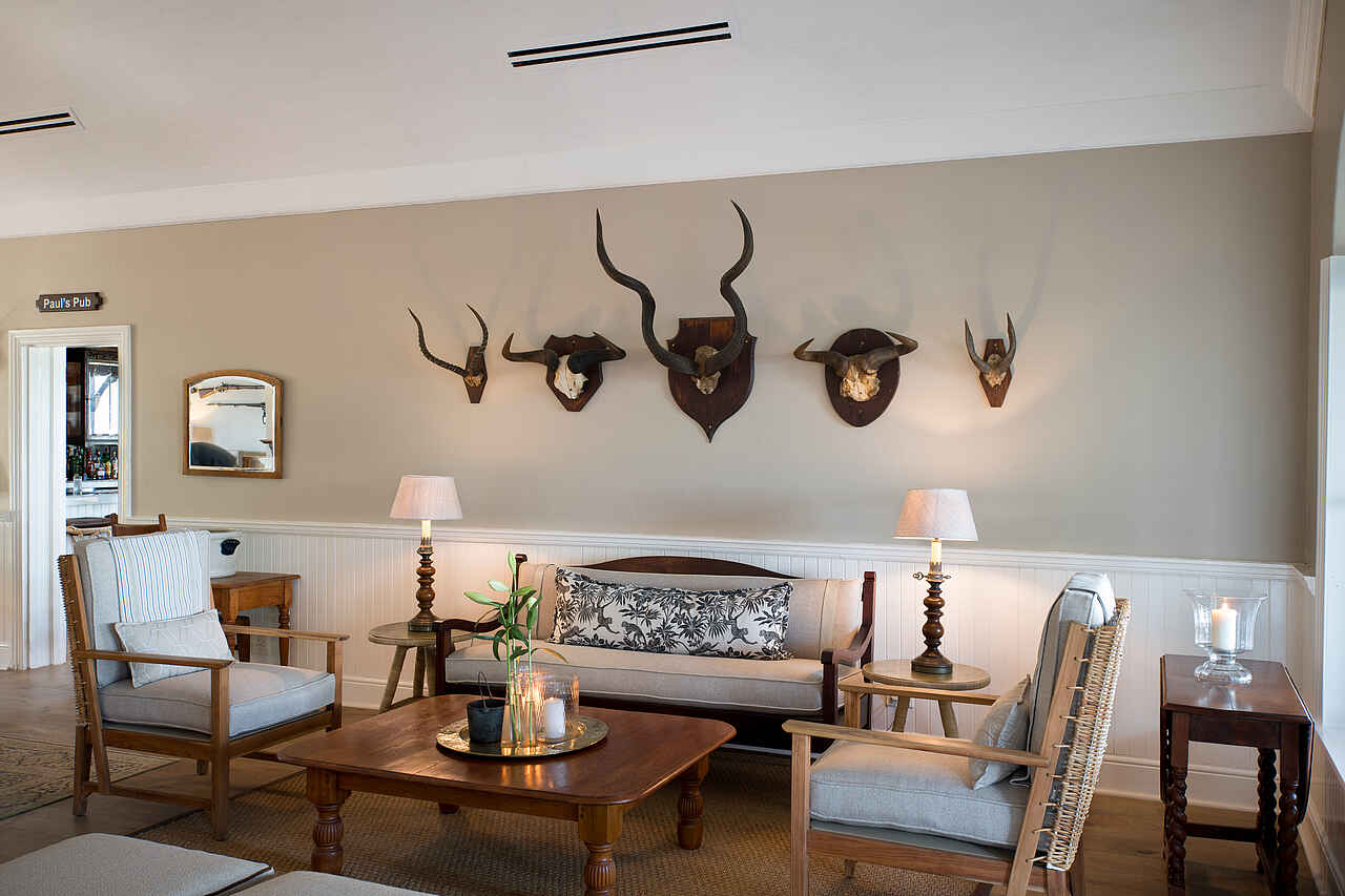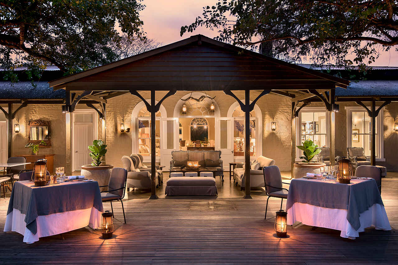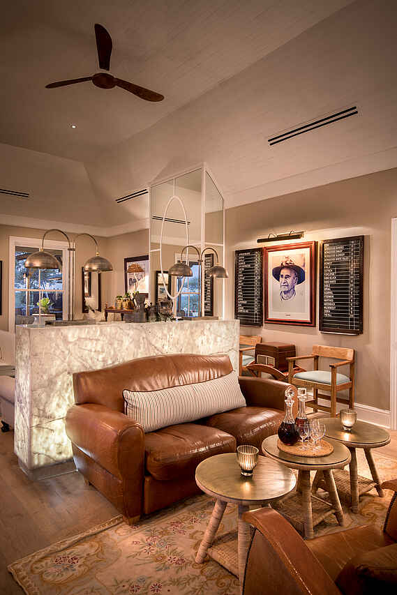 Der zentrale Bereich der Kirkman’s Kamp Lodge befindet sich im historischen Haupthaus mit großer Veranda und weitem Blick über das Tal des Sand River. Die offene Lounge ist mit bequemen Sofas, Sesseln und ausgewählten Antiquitäten eingerichtet und greift den Stil der 1920er Jahre auf. Mehrere Sitzbereiche sowie eine kleine Bibliothek schaffen Rückzugsorte zwischen den Pirschfahrten.