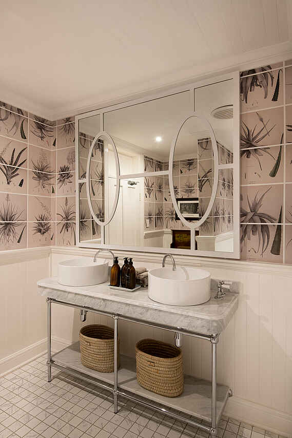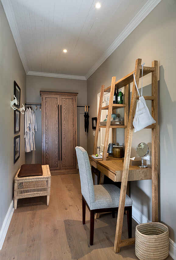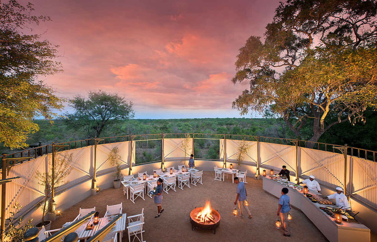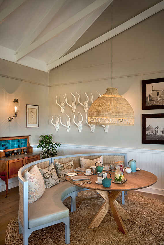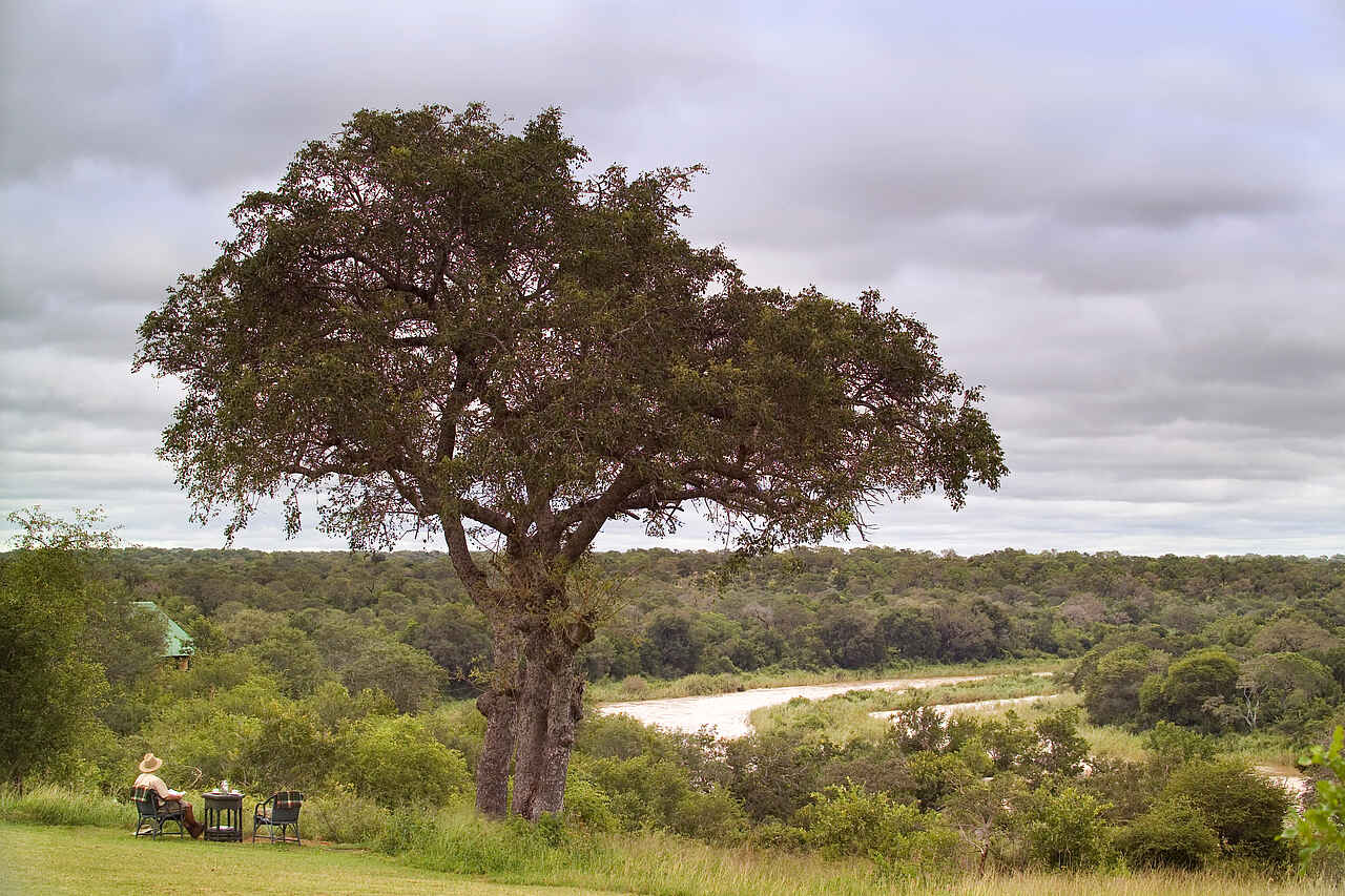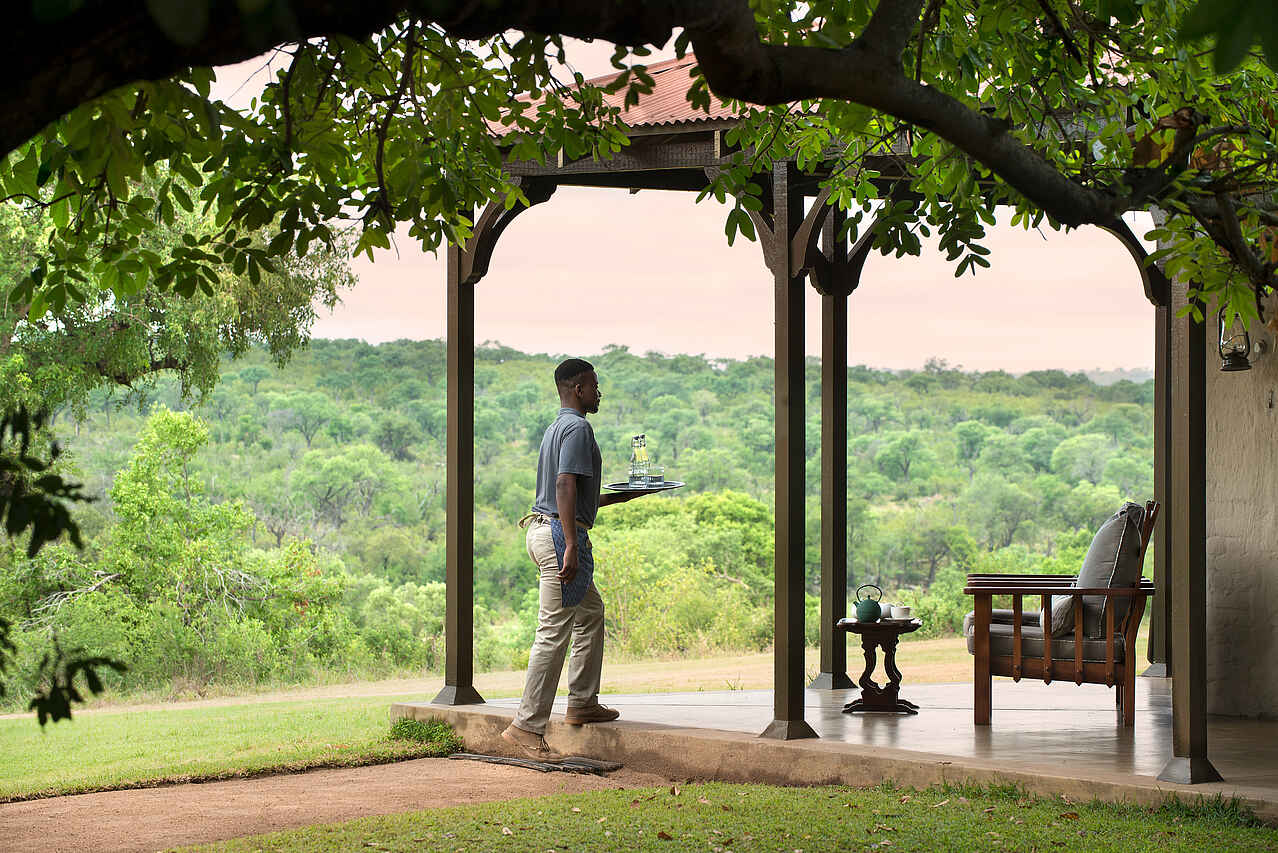 Der zentrale Bereich der Kirkman’s Kamp Lodge befindet sich im historischen Haupthaus mit großer Veranda und weitem Blick über das Tal des Sand River. Die offene Lounge ist mit bequemen Sofas, Sesseln und ausgewählten Antiquitäten eingerichtet und greift den Stil der 1920er Jahre auf. Mehrere Sitzbereiche sowie eine kleine Bibliothek schaffen Rückzugsorte zwischen den Pirschfahrten.
