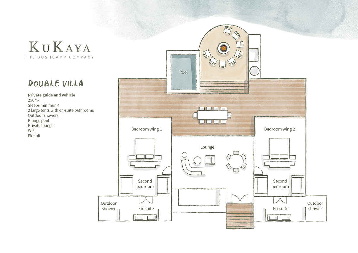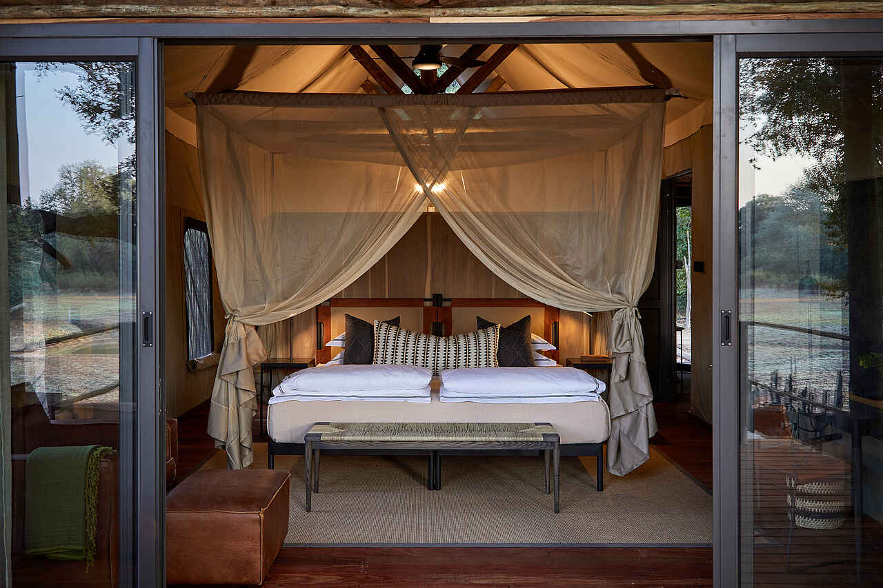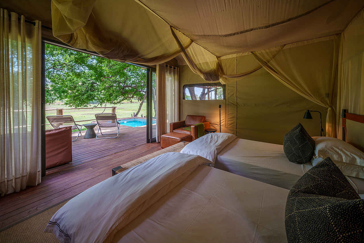 Die sechs großzügigen, mit Reet gedeckten Zeltsuiten verbinden eleganten Komfort mit natürlichem Charme. Jede Unterkunft bietet ein oder zwei Schlafzimmer, wahlweise mit Kingsize- oder zwei Queensize-Betten, die von schützenden Moskitonetzen umgeben sind. Ein stilvoller Wohn- und Essbereich sorgt für eine behagliche Atmosphäre. Für ein angenehmes Raumklima stehen eine Klimaanlage sowie Decken- und Standventilatoren zur Verfügung. Die En-suite-Badezimmer sind mit Doppelwaschbecken, Toilette und einer erfrischenden Außendusche ausgestattet, während Haartrockner und hochwertige Pflegeprodukte für zusätzlichen Komfort bereitstehen. Die private Terrasse lädt mit einem Plunge-Pool, einer Feuerstelle, einem Pizzaofen und einem Grillbereich dazu ein, entspannte Stunden inmitten der Natur zu genießen.