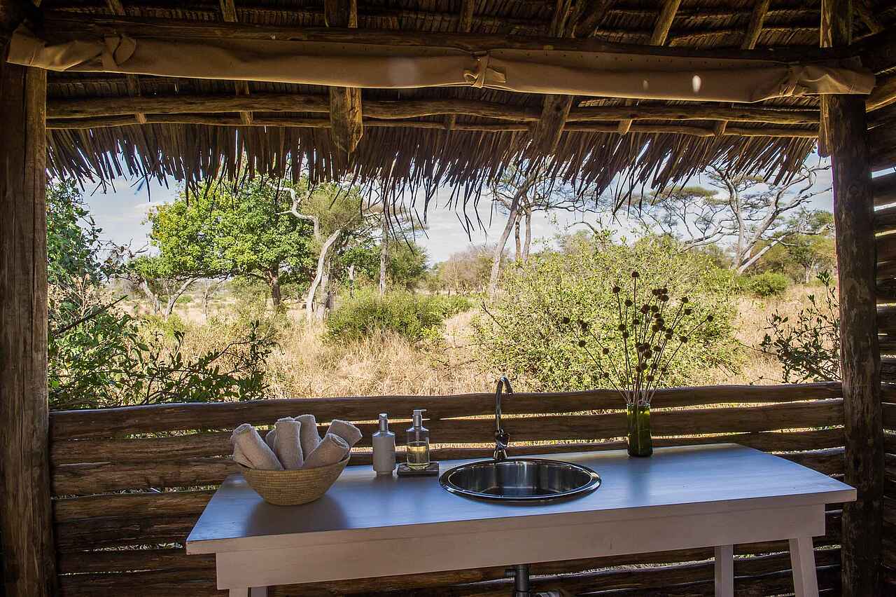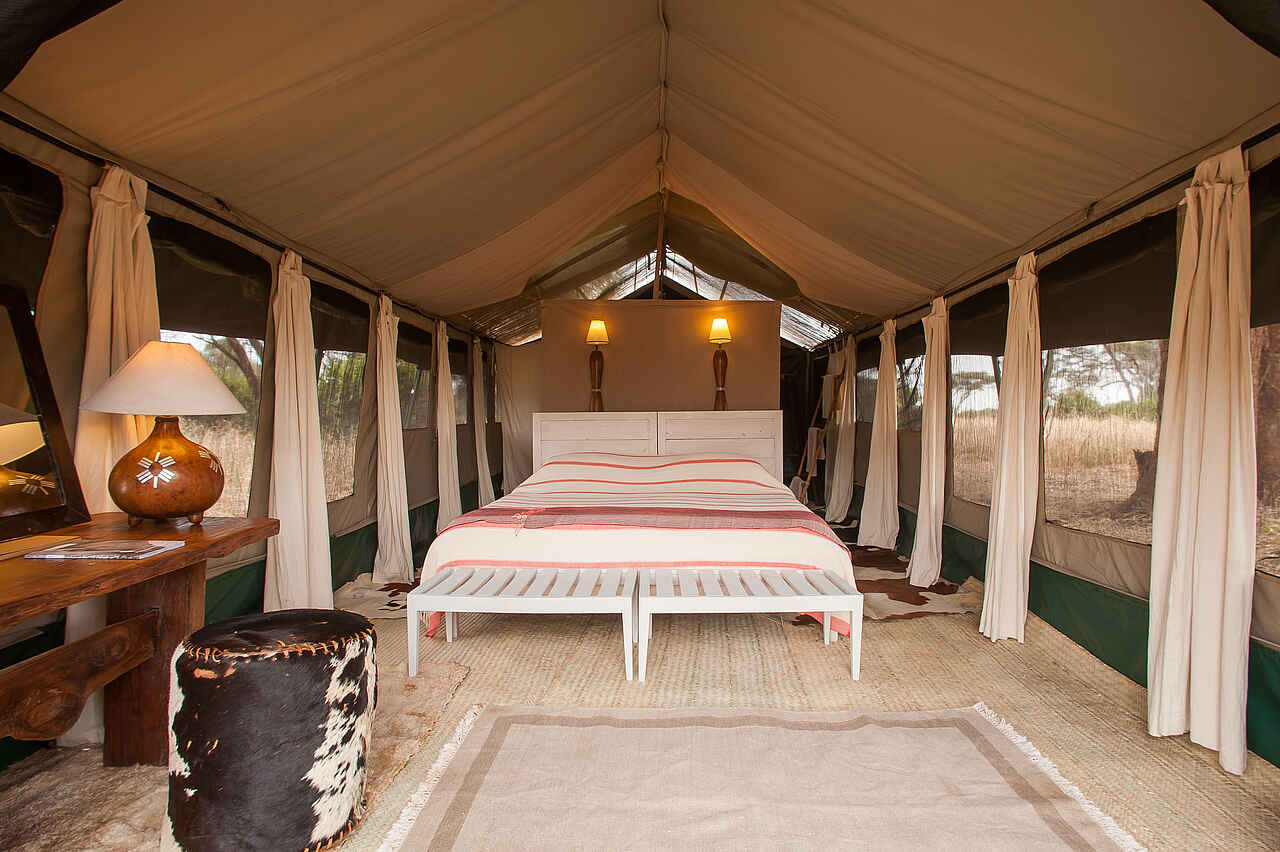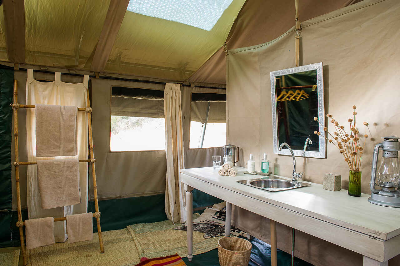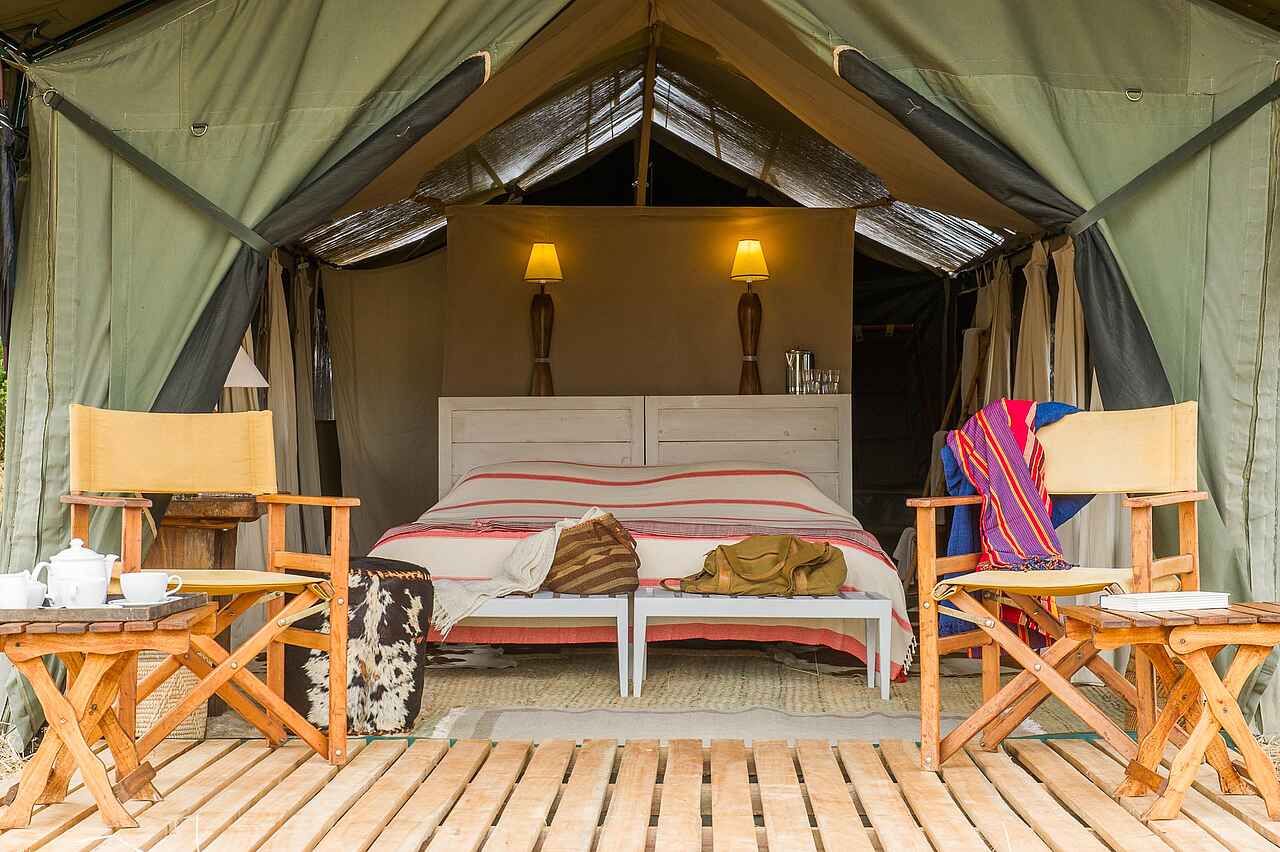 Gästen sehr überschaubar und bietet jenen, die Ruhe und Entspannung suchen, den passenden Ort. Die Einrichtung ist schlicht-modern. Die überwiegend hellen Möbel, Teppiche und Stoffe sorgen für eine frische Wohnatmosphäre. Nur wenige dunkle Holzmöbel und Accessoires erinnern an den klassischen Safaricamp-Charakter vergangener Zeiten. Alle Unterkünfte verfügen jeweils über ein großes Doppelbett, ein eigenes Badezimmer mit Waschtisch, Öko-WC und Eimerdusche. Pflegeprodukte stehen bereit. Heißes Wasser zum Duschen wird auf Anfrage in die Unterkunft gebracht. Viele große Netzfenster, die selbstverständlich auch blickdicht verhängt werden können, sorgen für einen Rundumblick auf das Gelände und eine frische Brise. Auf der privaten Veranda können es sich die Gäste auf Stühlen gemütlich machen und die Aussicht genießen. Ein Wäscheservice kann täglich in Anspruch genommen werden.