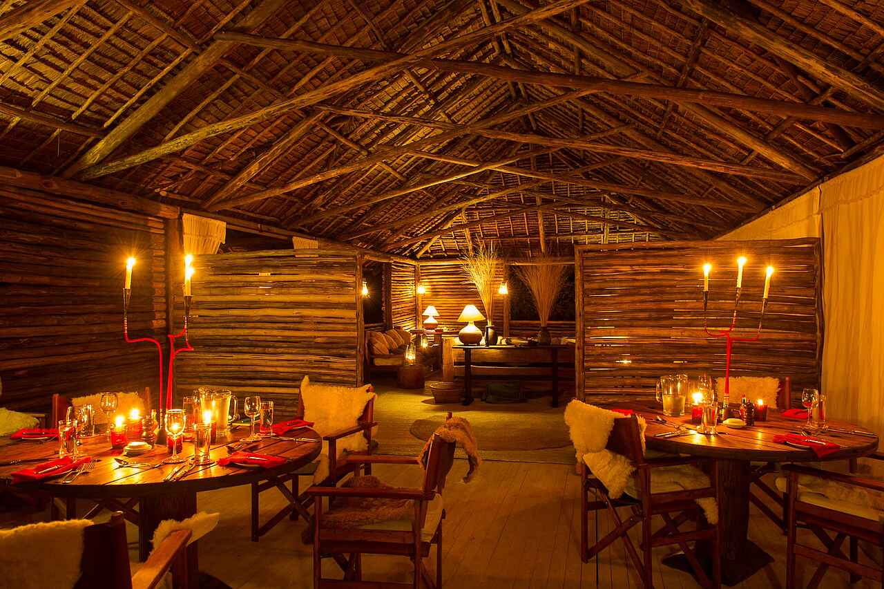 Ein einseitig geöffnetes Holzhaus mit Strohdach mit Speisebereich mit Einzeltischen und angrenzender Lounge. Die Lounge mit Bar bietet zahlreiche Polstermöbel. Das warme Licht der Beleuchtung schafft eine behagliche Stimmung. Tagsüber wird das Innere des lichtdurchlässigen Gebäudes durch die Strahlen der afrikanischen Sonne angenehm erhellt. Im Hauptzelt gibt es eine Ladestation für elektronische Geräte. Internetempfang besteht nicht, Mobilfunkempfang nur sporadisch. Geöffnet vom 1.6. bis 15.11.