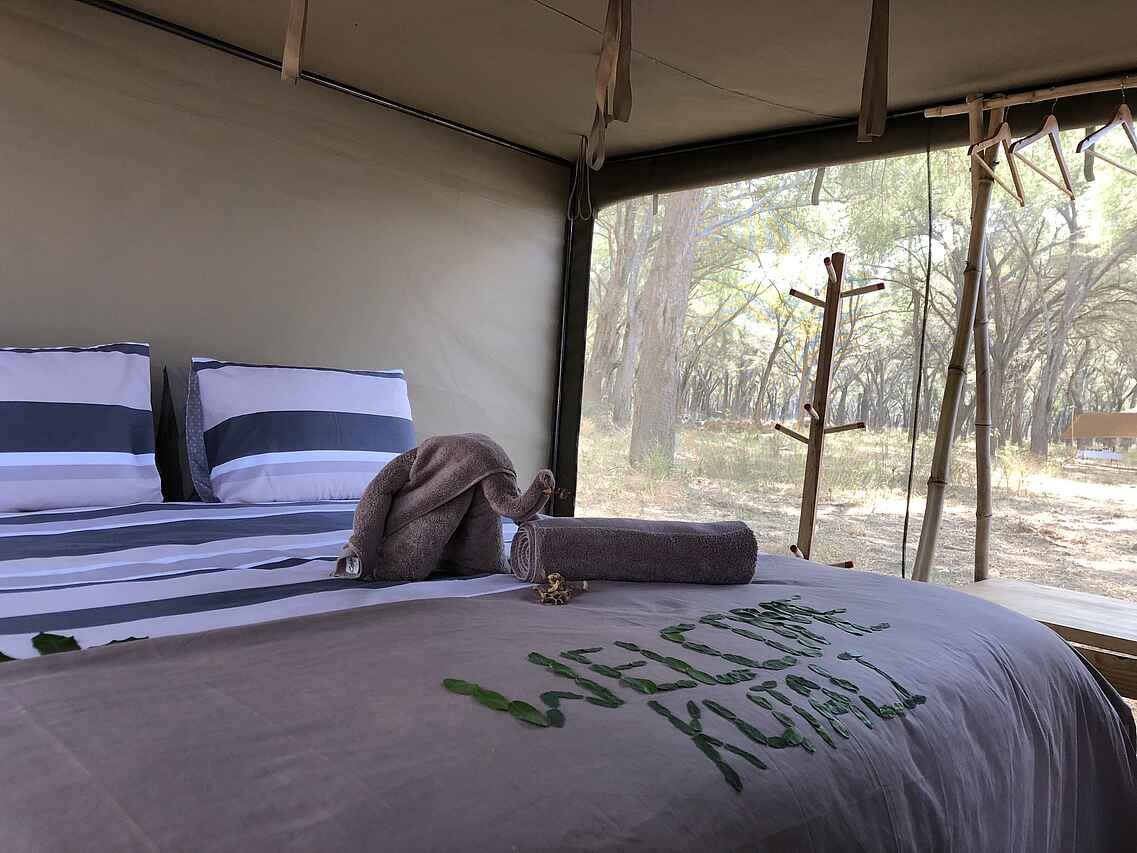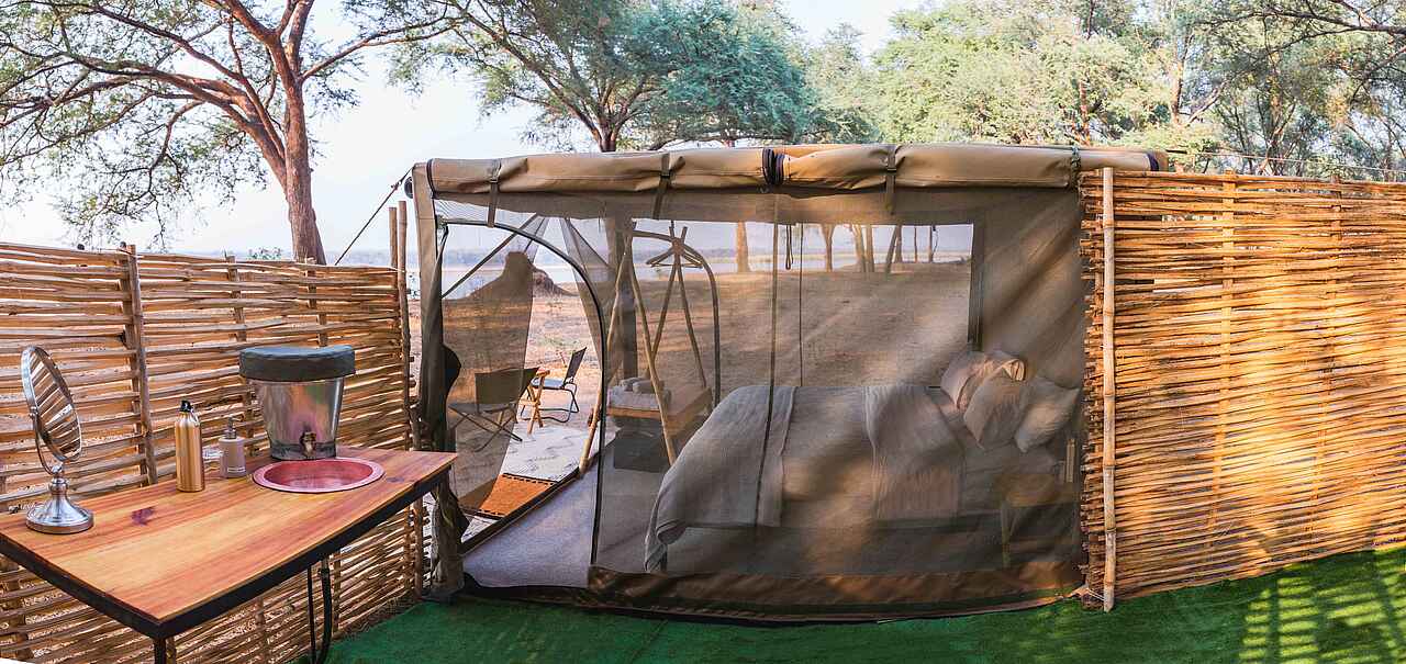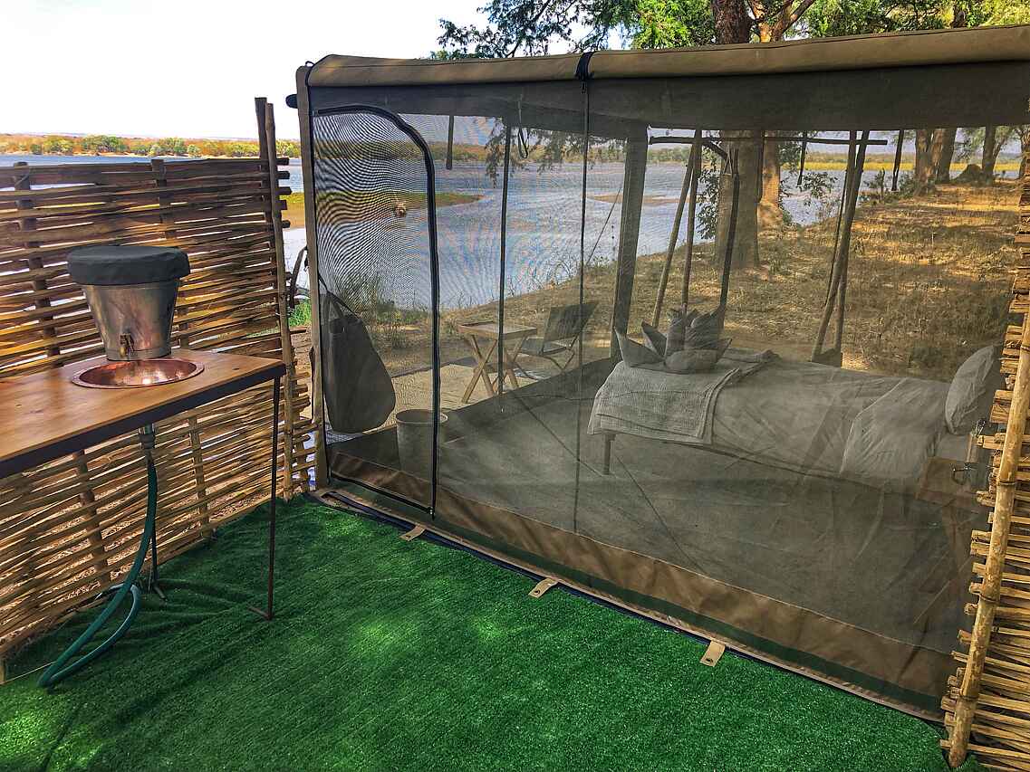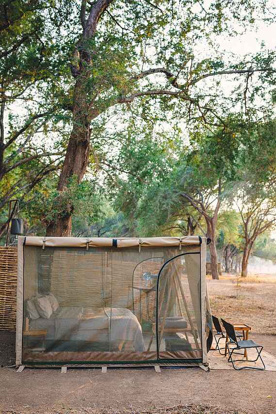 Die rechteckigen Zelte haben Wände aus Vollmaschen-Paneelen, sodass sich die umliegende Tier- und Pflanzenwelt vom Bett aus beobachten lässt. An kühleren Abenden dienen Leinwand-Rollläden zum Schließen. Teppiche säumen den Boden, Solarleuchten hängen in der Mitte und jedes Zelt hat entweder zwei Einzelbetten oder ein Doppelbett mit kleinen Nachttischen und Leselampen und einer Gepäckablage. Bereit liegen auch eine Taschenlampe, ein Funkgerät, ein Moskitospray sowie eine isolierte Wasserflasche und Gläser. Vor dem Zelt gibt es ein paar Campingstühle. Jedes Zelt verfügt über ein eigenes Bad im Freien, eine separate Eimerdusche und eine Toilette, die von Wänden aus Bambus und Schilf umgeben sind. Es gibt Eimerduschen mit heißem Wasser auf Anfrage, flauschige Handtücher und einen Handtuchhalter. Von dem kleinen Tisch mit einem Waschbecken aus Kupfer, einem Spiegel und Pflegeprodukten hat man einen herrlichen Blick auf den umliegenden Busch. Ein Feuereimer steht vor jedem Zelt.