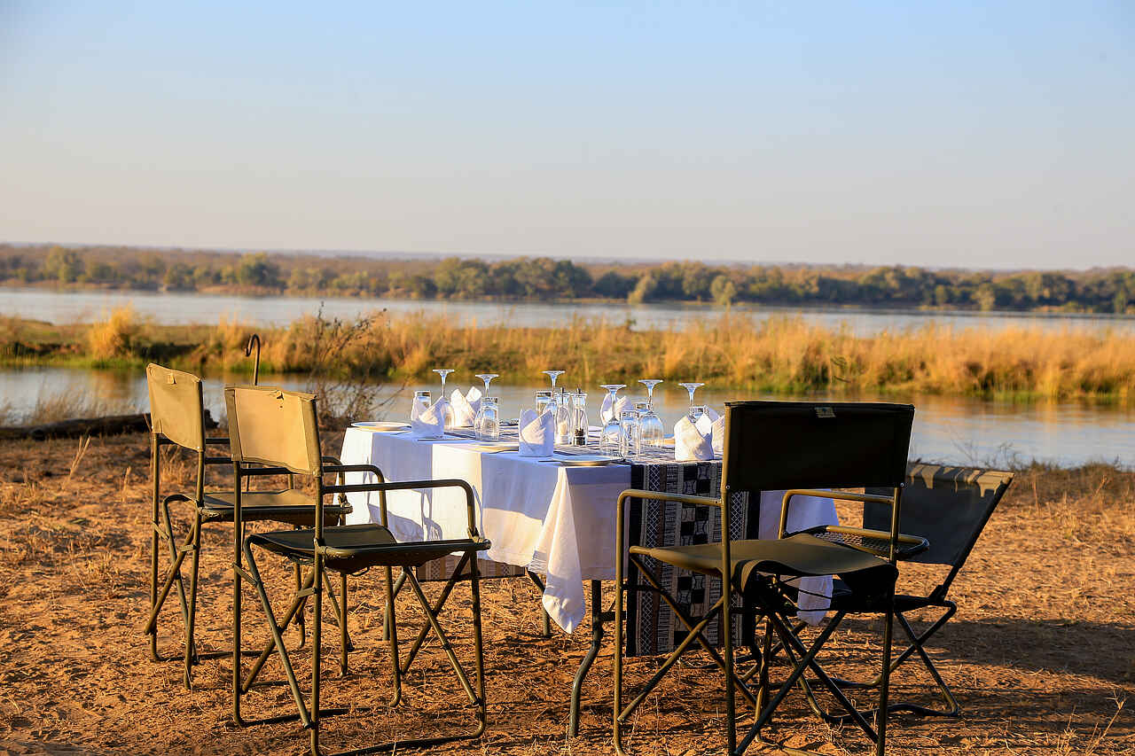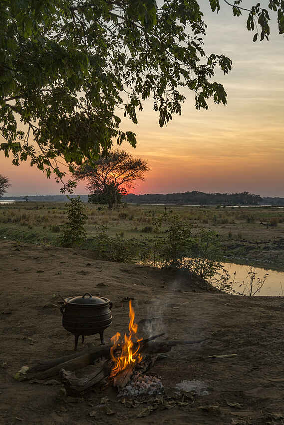 Alle Mahlzeiten sind inklusive und werden zusammen mit anderen Gästen eingenommen. Es wird einfache Küche mit schmackhaften und sättigenden Gerichten serviert. Nach vorheriger Ankündigung können Ernährungsbedürfnisse berücksichtigt werden. Morgens um 5.30 Uhr gibt es am Lagerfeuer ein Frühstücksbuffet mit Obst, Toast, Marmeladen. Auf Bestellung wird Brei über dem Feuer zubereitet. Tee, Kaffee und Saft werden dazu gereicht. Das Mittagessen ist flexibel und abhängig von den Aktivitäten. Gereicht wird beispielsweise Gemüse- und Nudelauflauf, Steaks, grüner Salat vom Buffet und frisches Obst. Das Abendessen wird als festes Menü und oft unter freiem Himmel serviert. Gefiltertes Trinkwasser wird bereitgestellt und alkoholfreie Getränke und lokale alkoholische Getränke sind inklusive. Premium-Weine und Spirituosen können im Voraus bestellt werden und sind kostenpflichtig.