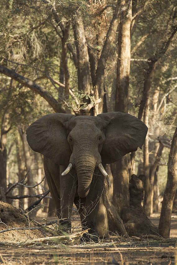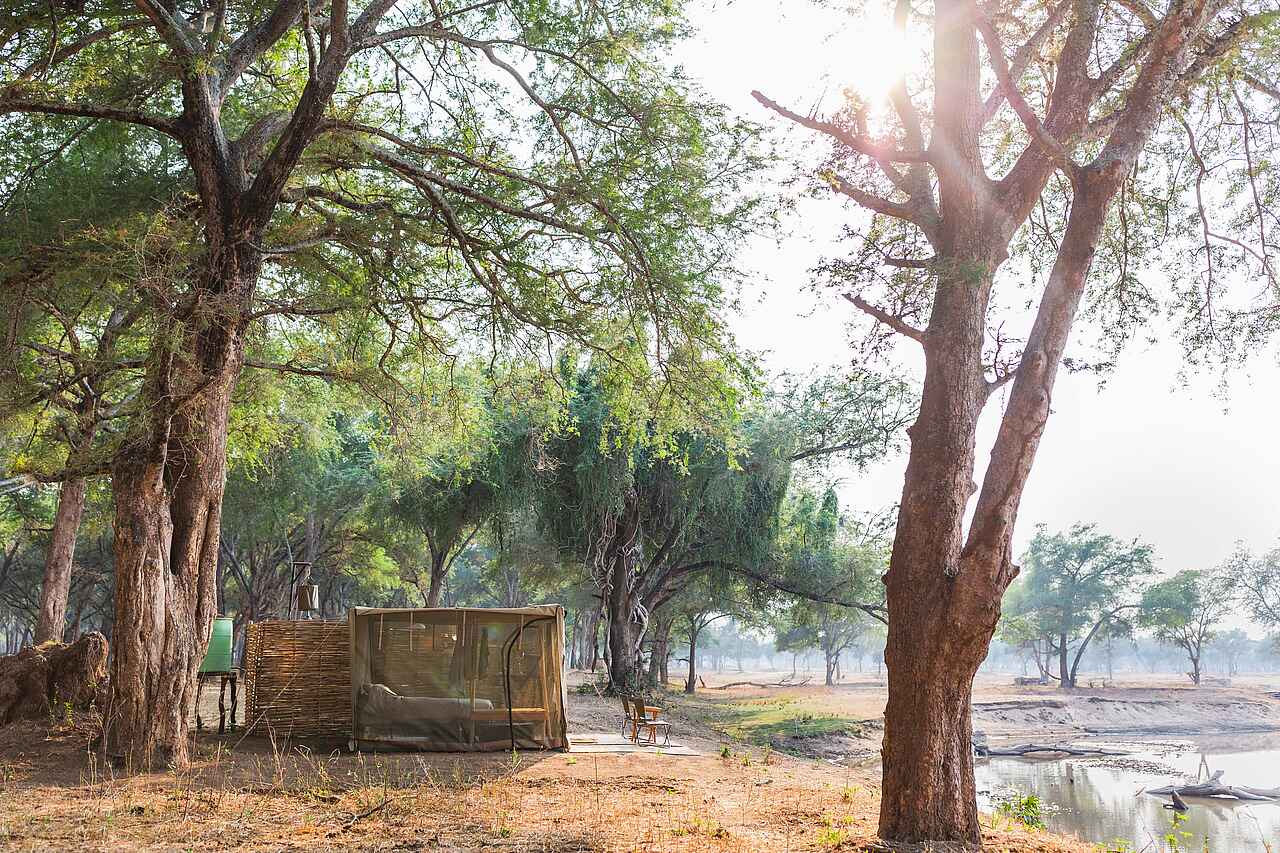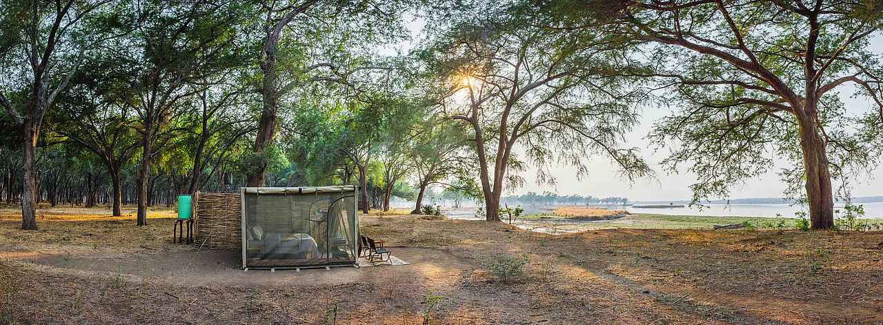 Das Kutali Flycamp befindet sich in wunderschöner Lage am Fluss Zambezi auf der Insel Kulefu tief im Lower Zambezi National Park in Sambia in einem der kühlsten Faidherbia- oder Winterdornwälder. Dies verleiht ihm eine ganz andere Atmosphäre als Chula Island Camp. Kutali ist eine wunderbare Ergänzung zum gegensätzlichen Schwestercamp Chula Island Flycamp.