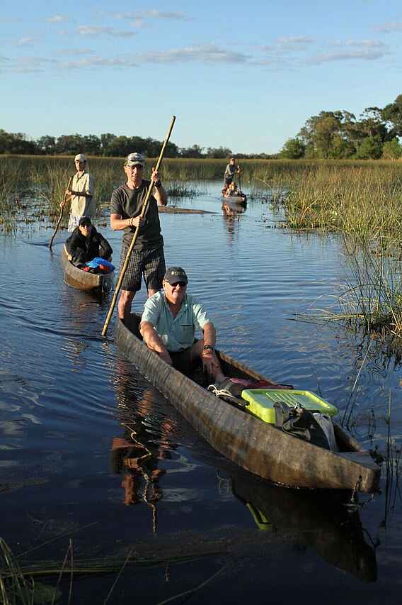 Das Kwapa Camp ist Bestandteil des Safari Guide Training Programms und bietet ein intensives, praxisnahes Naturerlebnis im südlichen Okavangodelta. Täglich stehen Pirschfahrten bei Tag und Nacht, Mokoro-Exkursionen und Buschwanderungen auf dem Programm - stets unter Anleitung erfahrener Ausbilder. Teilnehmende lernen, Spuren zu lesen, Tierverhalten zu deuten, Vogelarten zu bestimmen und ökologische Zusammenhänge zu verstehen. Ergänzend werden theoretische Inhalte wie Orientierung, Pflanzenkunde oder Sternenkunde vermittelt. Die Safaris im Kwapa Camp sind nicht nur erlebnisorientiert, sondern fördern ein tiefes Verständnis für das Ökosystem des Deltas. Sie richten sich an angehende Guides ebenso wie an naturinteressierte Reisende mit dem Wunsch nach fundierter Wissensvermittlung.