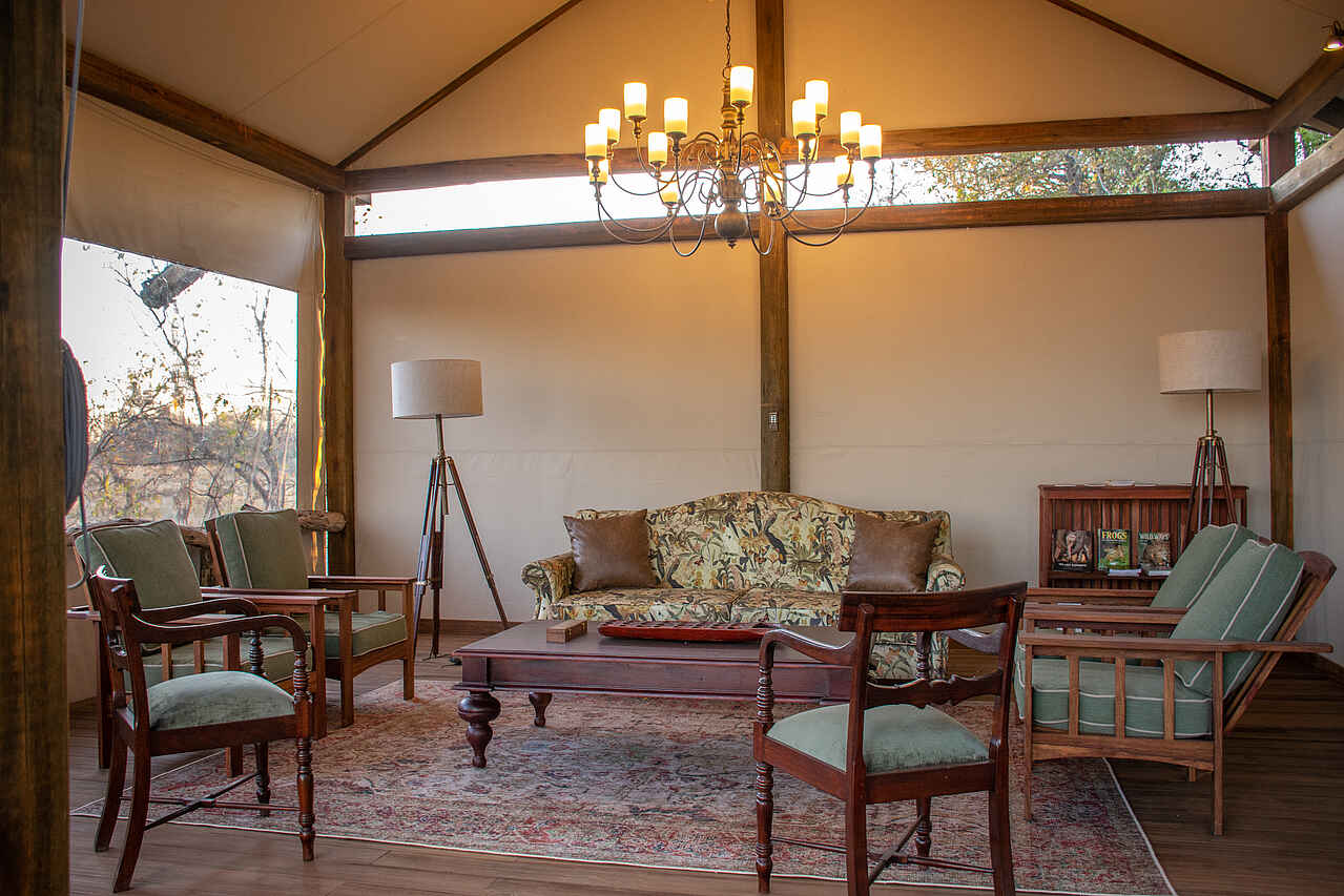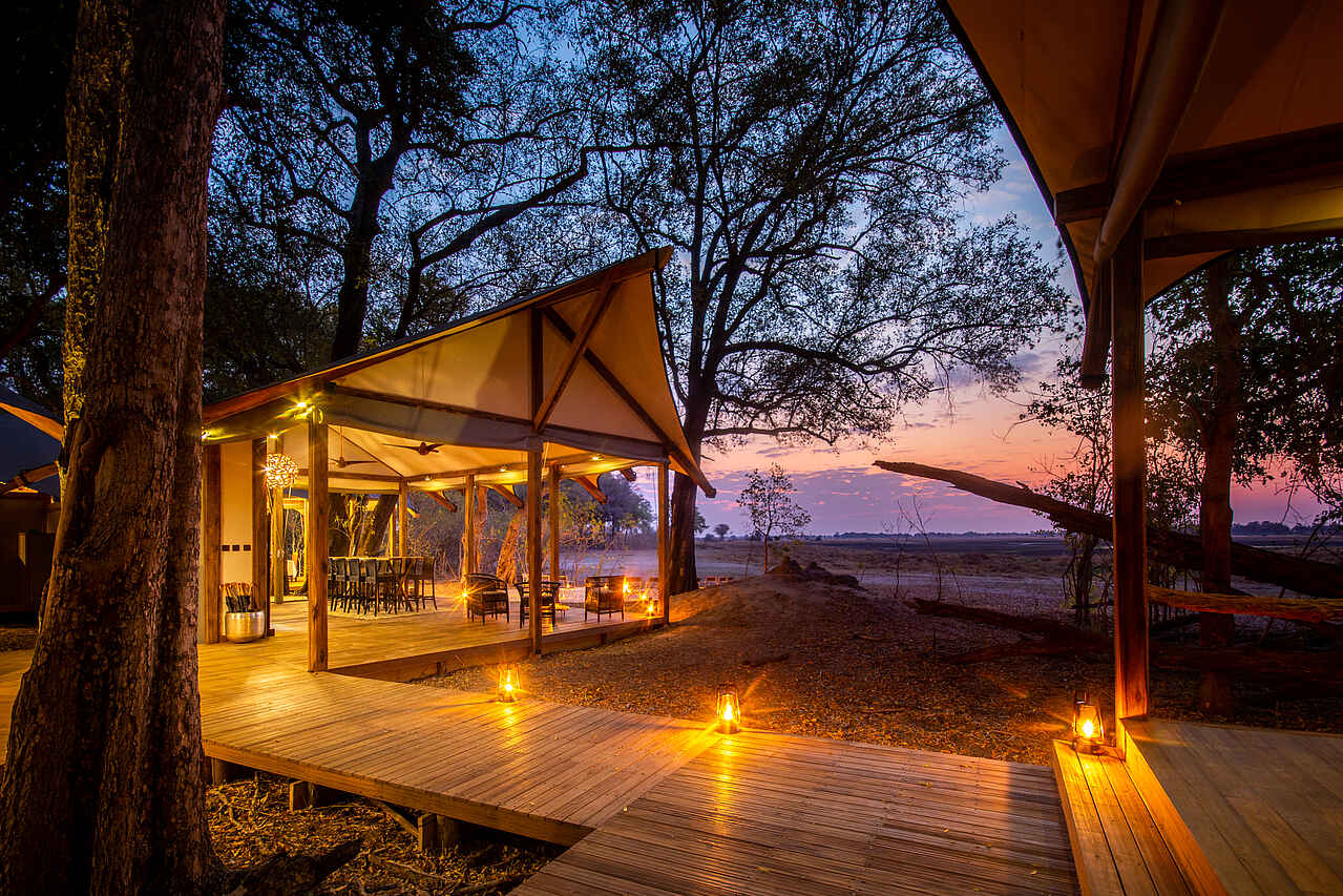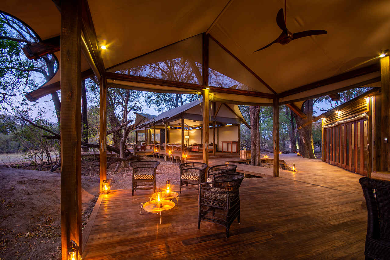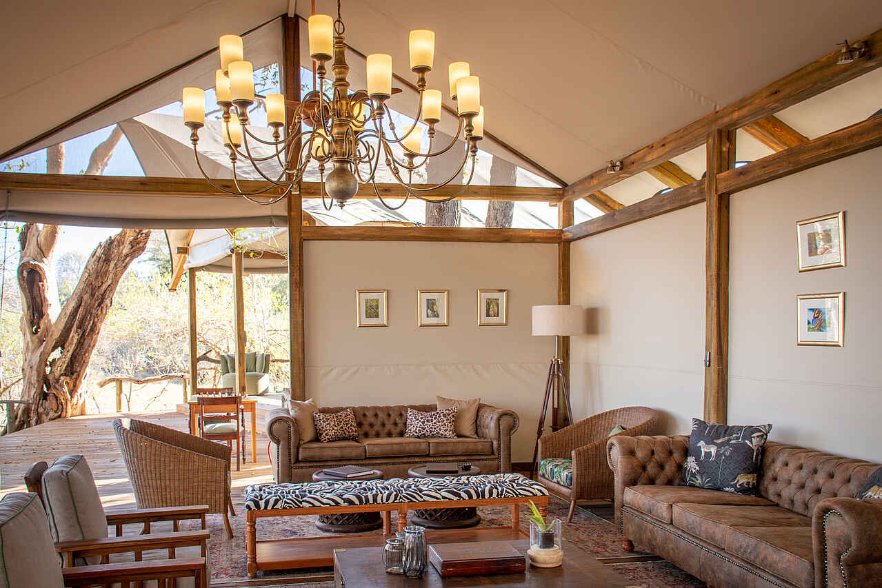 Im Hauptgebäude der Lodge findet sich eine kleine Lounge mit bequemen Sesseln und Blick auf die Lagune vor dem Camp. Gleich daneben die Bar, und dann das Restaurant, ebenfalls mit Blick auf die Lagune. Kleine Bibliothek und Souvenirshop. Boma mit Feuerstelle und Sitzgelegenheiten vor dem Hauptgebäude. Es gibt 2 Swimming Pools mit jeweils einem Sonnendeck mit Liegen und einer kleinen Bar. Um ein authentisches Safarierlebnis mit "digital detox" zu ermöglichen, gibt es kein WLAN in der Lodge.