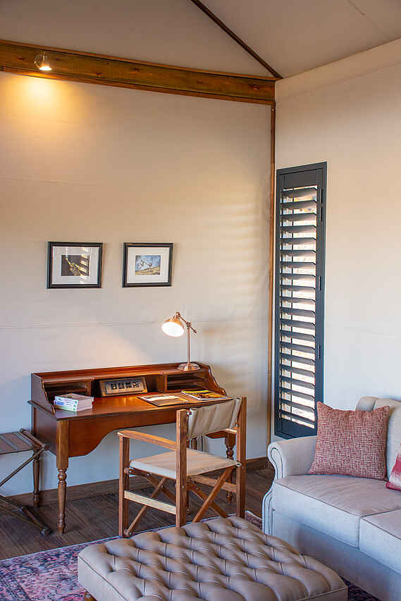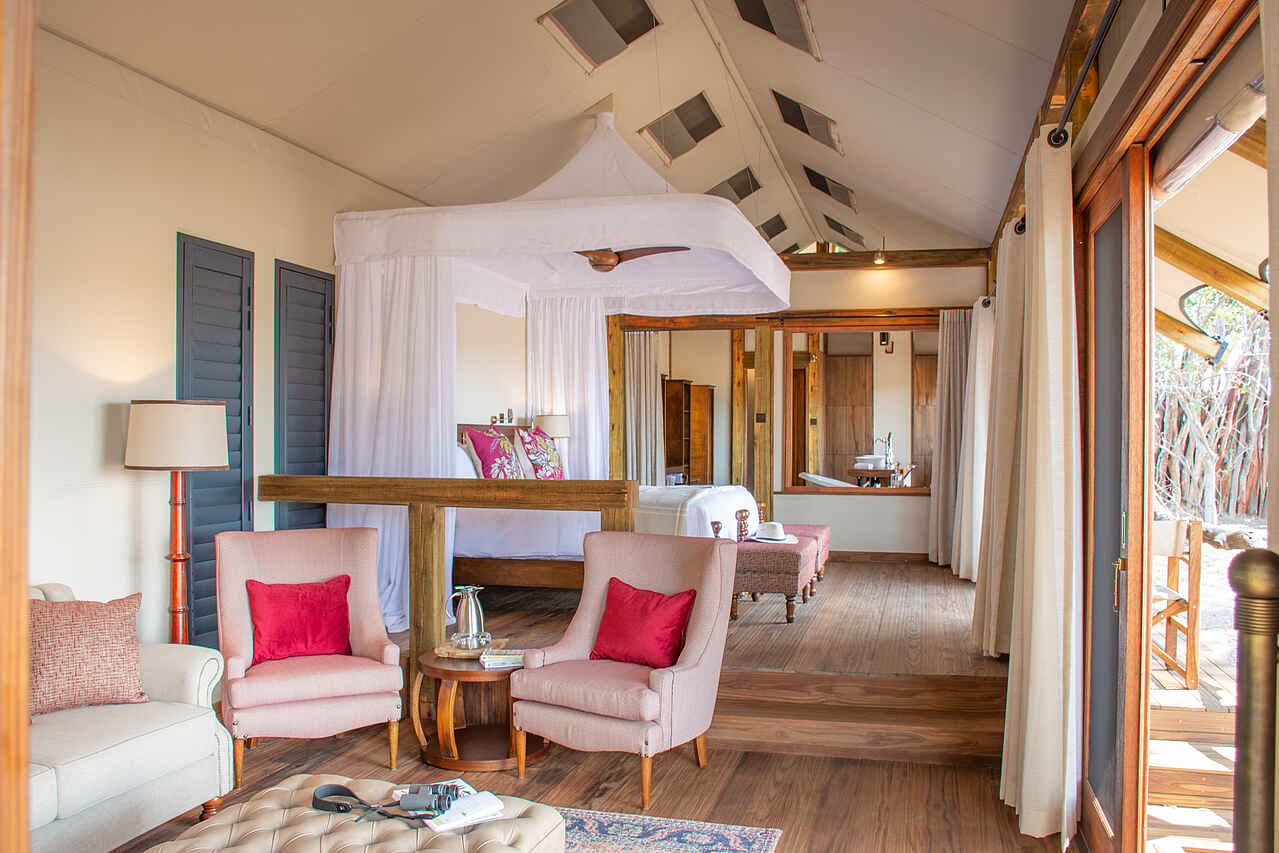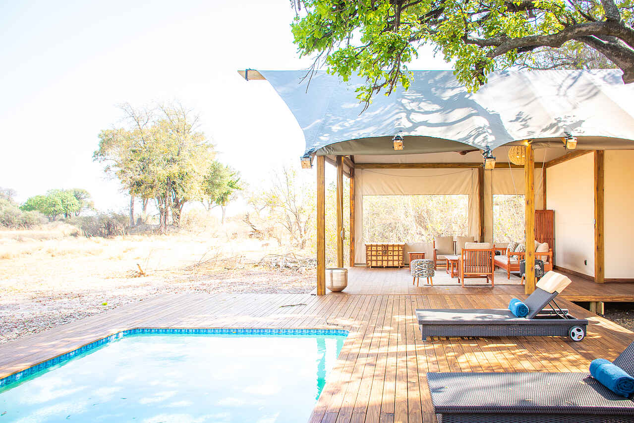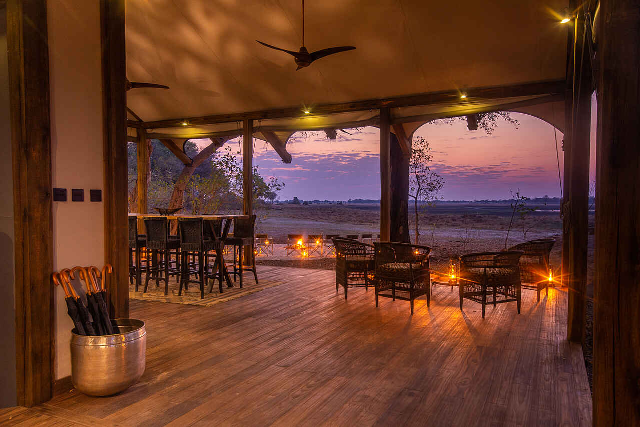 Im Hauptgebäude der Lodge findet sich eine kleine Lounge mit bequemen Sesseln und Blick auf die Lagune vor dem Camp. Gleich daneben die Bar, und dann das Restaurant, ebenfalls mit Blick auf die Lagune. Kleine Bibliothek und Souvenirshop. Boma mit Feuerstelle und Sitzgelegenheiten vor dem Hauptgebäude. Es gibt 2 Swimming Pools mit jeweils einem Sonnendeck mit Liegen und einer kleinen Bar. Um ein authentisches Safarierlebnis mit "digital detox" zu ermöglichen, gibt es kein WLAN in der Lodge.