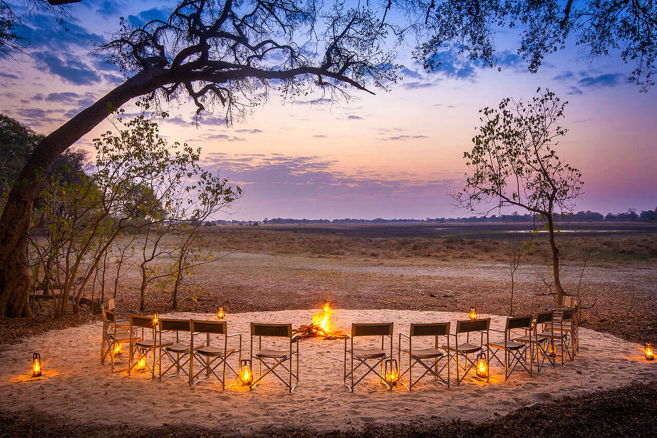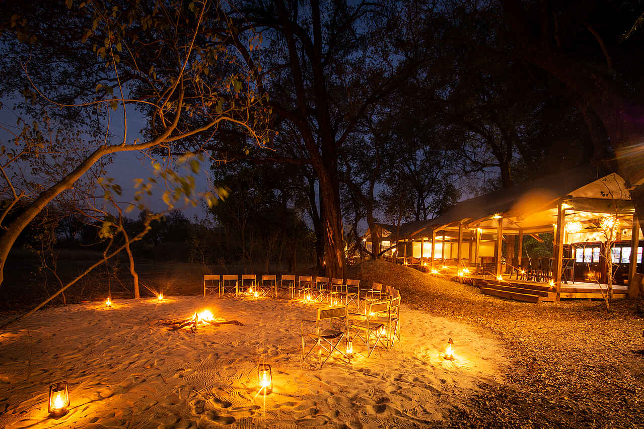 Das Camp liegt am Rande einer kleinen Lagune auf einer bewaldeten Insel unmittelbar an der Nordgrenze zum Moremi Game Reserve. Die Landschaft hier bietet eine breite Palette: Offenes Wasser, Lagunen, Galeriewälder, Papyrussumpf, Grasland, Busch. Der Moanachira fließt in etwa 1km Entfernung am Camp vorbei. In der privaten Kwara-Konzession (NG 20) sind Nachtfahrten erlaubt.