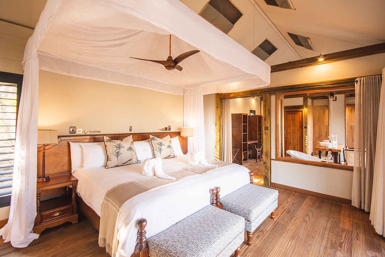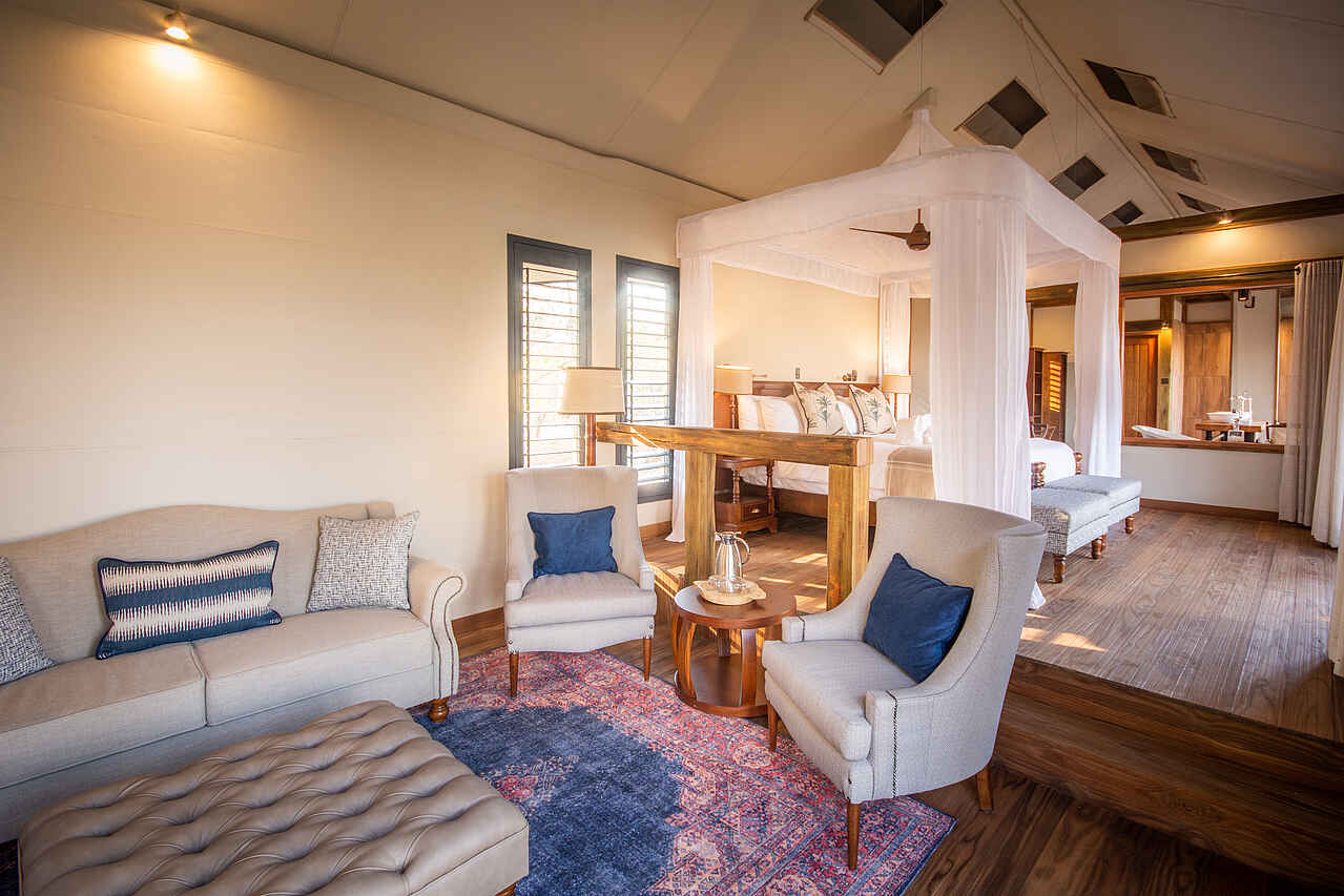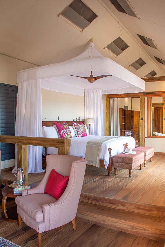 9 Leinwandzelte, jeweils mit Doppel- oder Twin-Betten. Netzfenster, private Veranda mit Blick auf die Lagune, Schiebetüren. Alle Zelte mit 2 Waschbecken, Innen-und Außendusche, WC, fließend Kalt- und Warmwasser.
