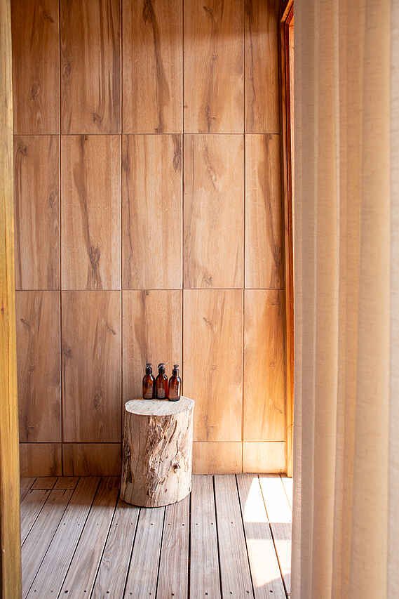 Gäste sind erst ab 18 Jahren erlaubt. Keine Umzäunung, keine erhöhten Stege zwischen den Zelten und dem Hauptgebäude.