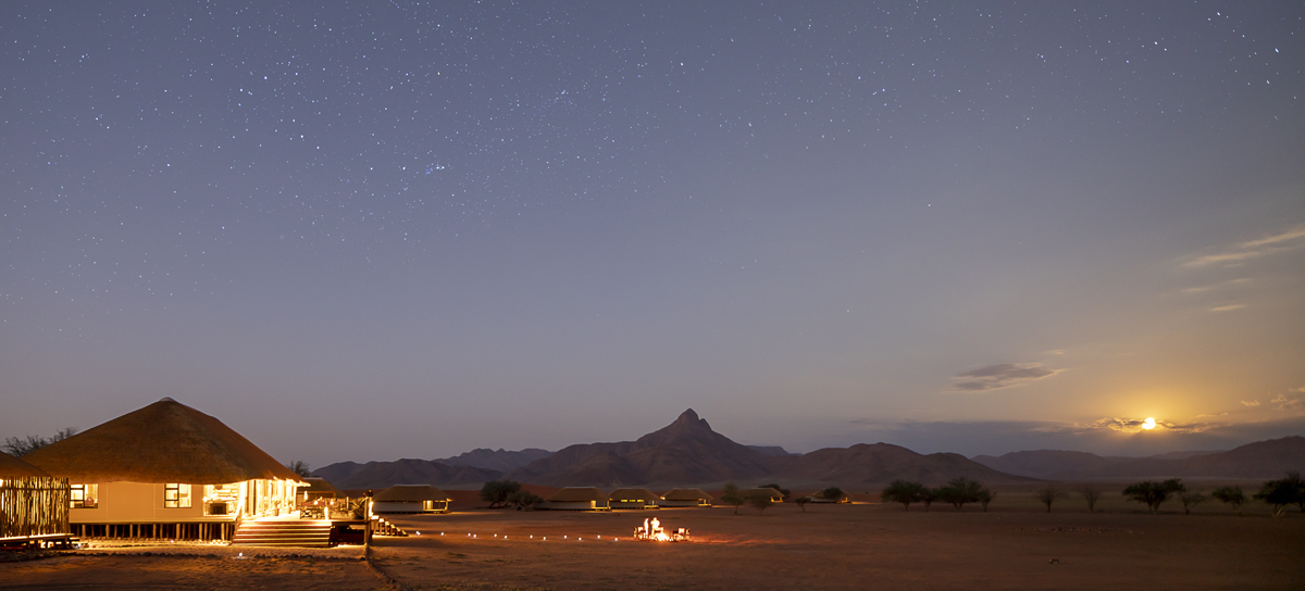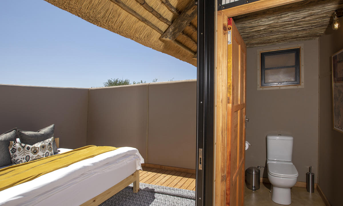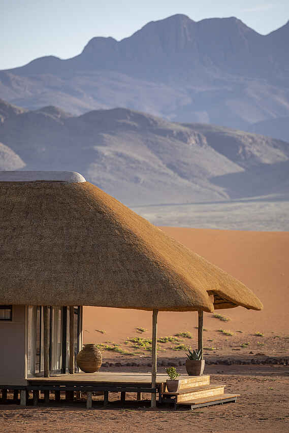 Die Lodge verfügt über zwölf Chalets, jeweils mit Schlafzimmer, Wohnbereich, En-suite-Badezimmer und Veranda. Farbgebung und Materialien orientieren sich an der Namib, alles ruhig, natürlich, stimmig. Eine Klimaanlage sorgt an heißen Tagen für angenehme Temperaturen. Die Badezimmer bieten Doppelwaschbecken, Spültoilette sowie Innen- und Außendusche. Jedes Chalet besitzt zusätzlich ein offenes Star-Gazer Zimmer für Nächte unter Sternen. Zur Ausstattung gehören bequeme Betten, komfortable Sitzmöbel, genügend Stauraum, Stromanschlüsse sowie Tee und Kaffee. Für Familien gibt es zwei großzügige Chalets mit zwei Schlafzimmern.
