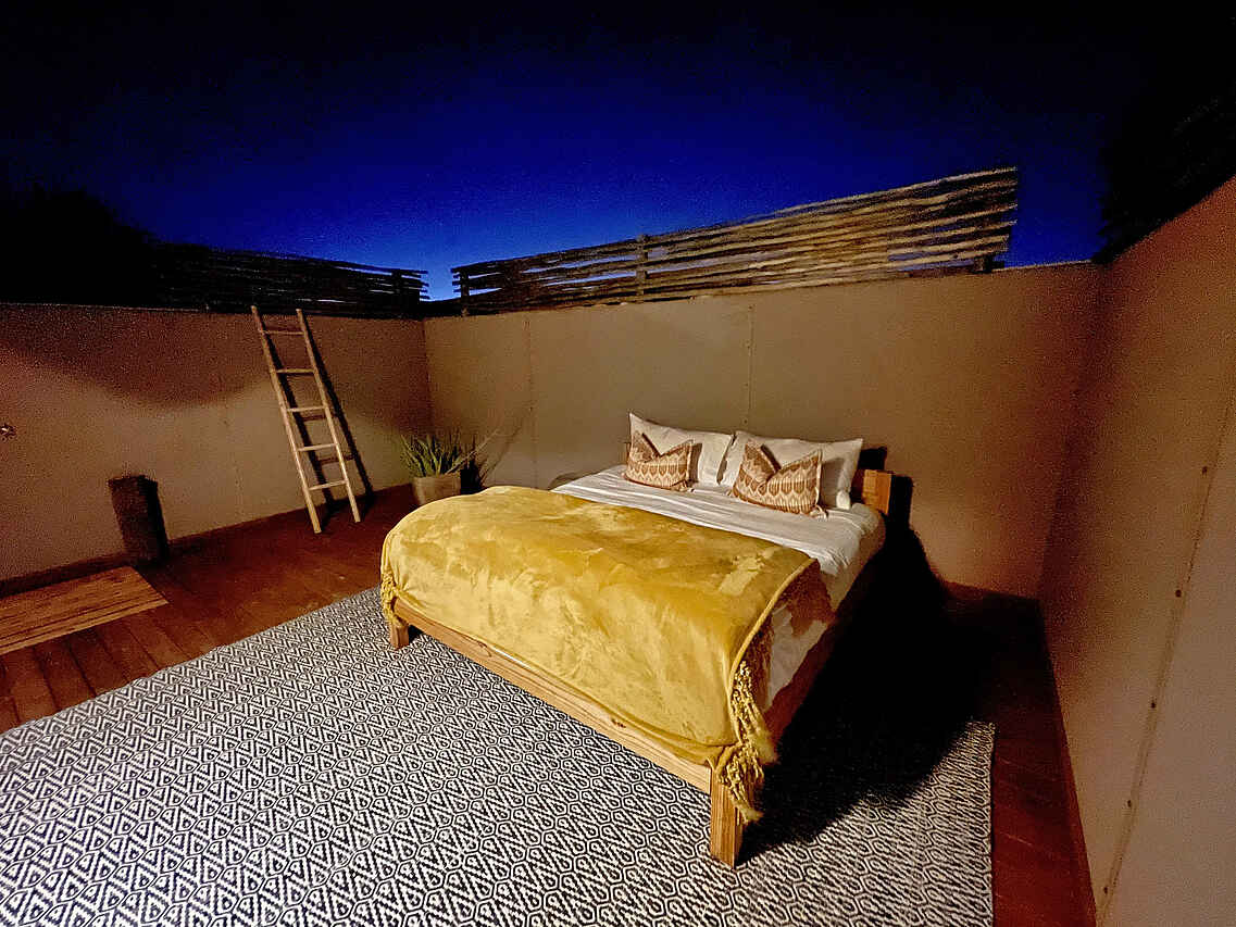 Das Herz der Lodge ist ein offener Hauptbereich mit Lounge, Bar und Restaurant, der den Blick auf die Dünen freilässt. Die Einrichtung ist warm, dezent und nicht überladen, Sitzgruppen stehen so, dass man das Panorama direkt vor Augen hat. Ein Pool lädt zwischen Aktivitäten zur Abkühlung ein, die Terrasse ist ideal für Sundowner und stille Wüstenabende. Nach Sonnenuntergang brennt im Outdoorbereich das Feuer, Gespräche werden leiser und der Himmel übernimmt. Alles ist klar strukturiert, kein Prunk, sondern stimmige Gestaltung mit Fokus auf Natur, Ruhe und Erlebniswert.