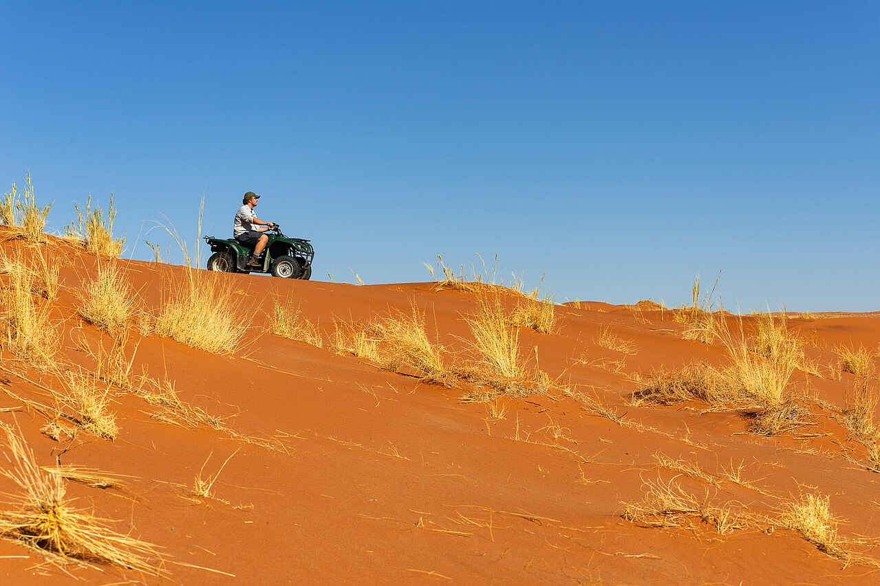 Kwessi Dunes steht für Wüstenerfahrung. Geführte Pirschfahrten erschließen die sandige Landschaft am Morgen und am späten Nachmittag. Die Guides kennen Tiere und Gelände und vermitteln, wie Leben in extremer Trockenheit funktioniert. Wanderungen eröffnen die Wüste im langsamen Tempo. Besonders gefragt sind Reitausflüge, denn zu Pferd wirkt die offene Fläche nochmals größer und unmittelbarer. Quad-Biking bietet Action, Ballonflüge öffnen die Perspektive nach oben und machen die Dünenlandschaft greifbar. Wer Sossusvlei besuchen möchte, erreicht die berühmten Dünen und das Deadvlei als Tagesausflug.