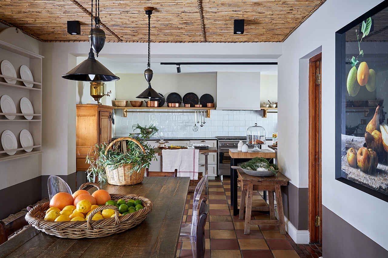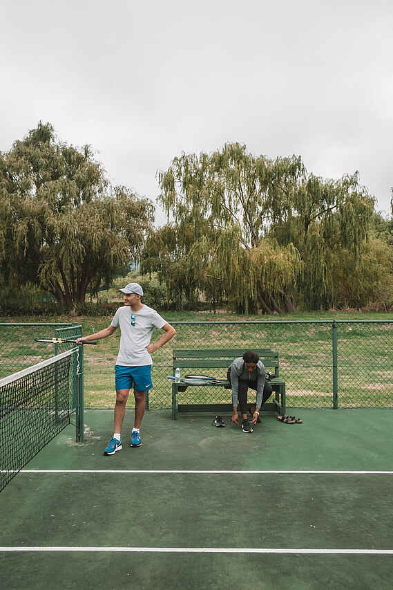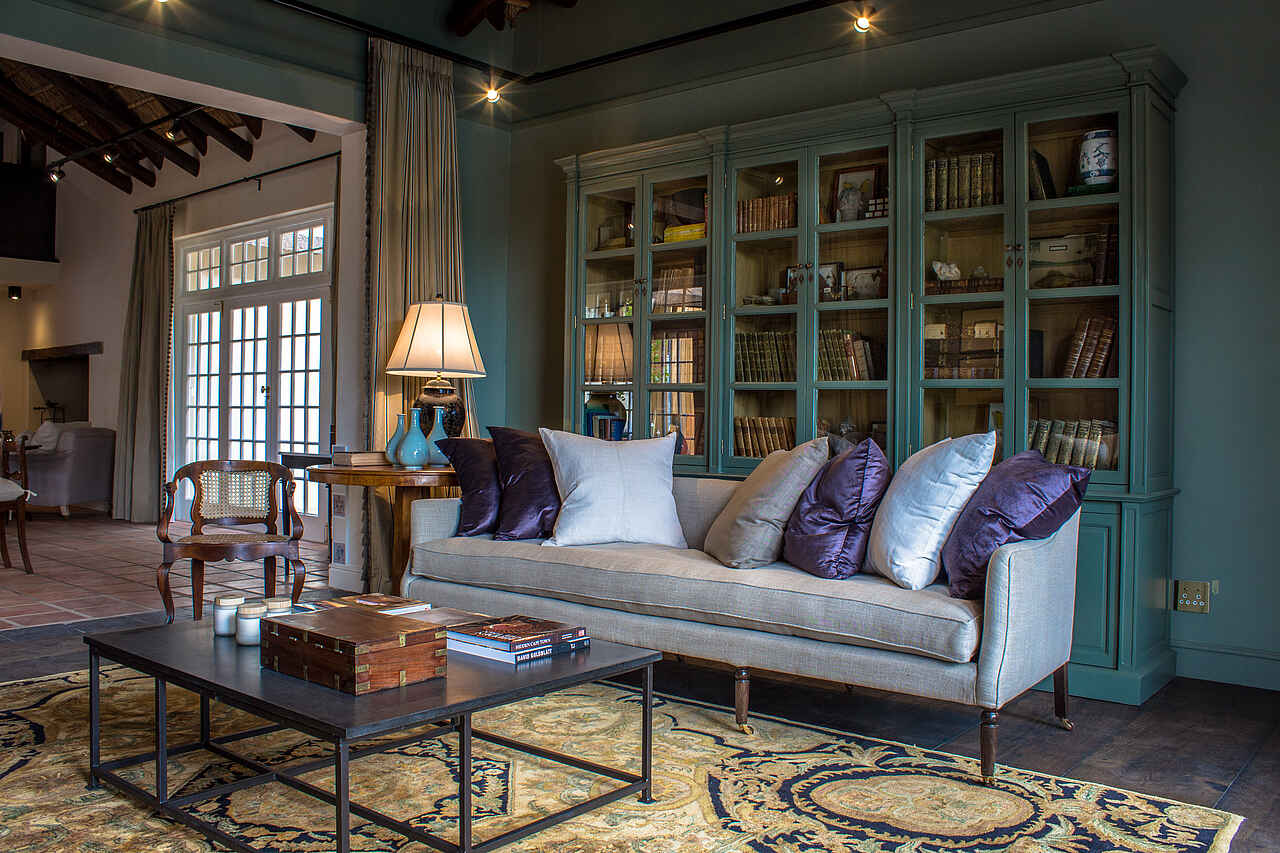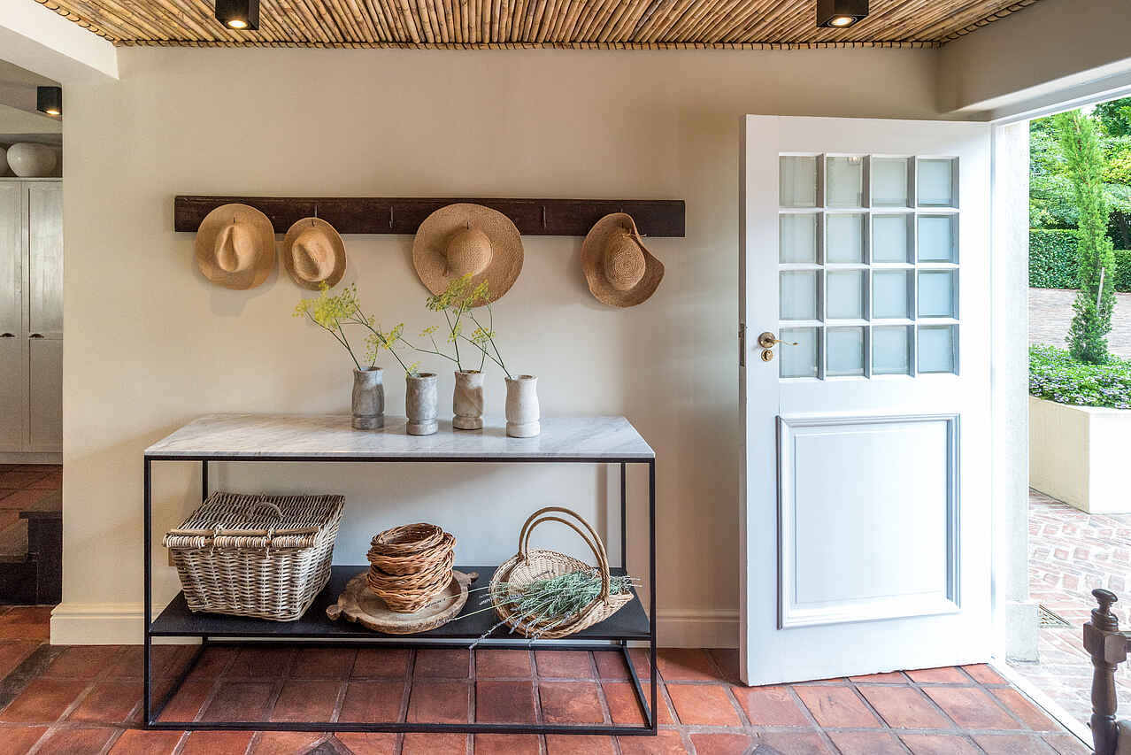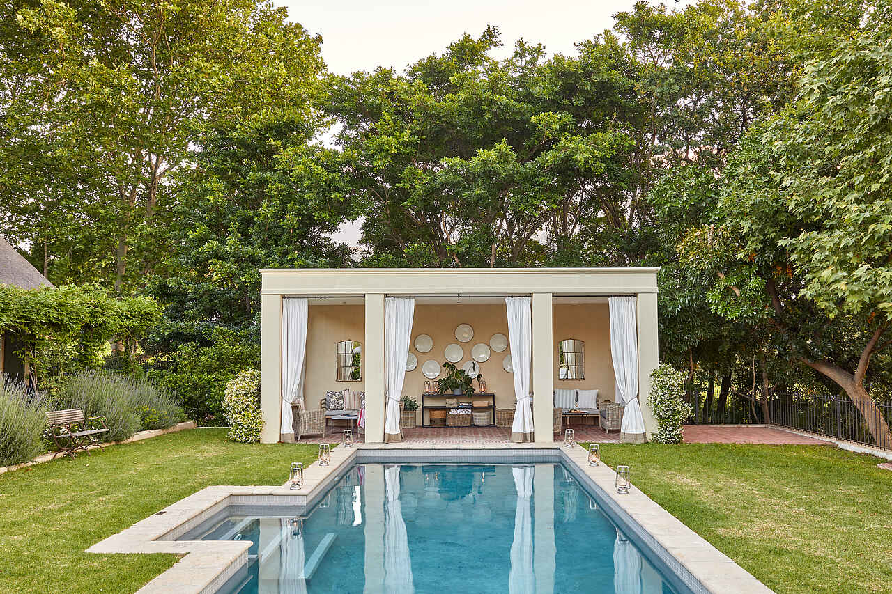 Die La Clé Lodge ist ein großzügiges, stilvoll gestaltetes Landhaus. Der zentrale Wohnbereich kombiniert ein gemütliches Wohnzimmer mit Kamin, bequemen Sofas und ausgesuchter Kunst mit einem offenen Esszimmer. Gleich daneben liegt die moderne Küche, die entweder von den Gästen selbst genutzt wird oder vom Team, das hier frische Gerichte zubereitet. Große Türen öffnen sich zur Terrasse mit Blick in den Garten. Draußen warten ein Pool mit Liegestühlen, eine Boulebahn und ein Tennisplatz. Wer es ruhiger mag, macht es sich mit einem Buch in der kleinen Bibliothek gemütlich oder genießt den Sonnenuntergang an der Feuerstelle im Freien.