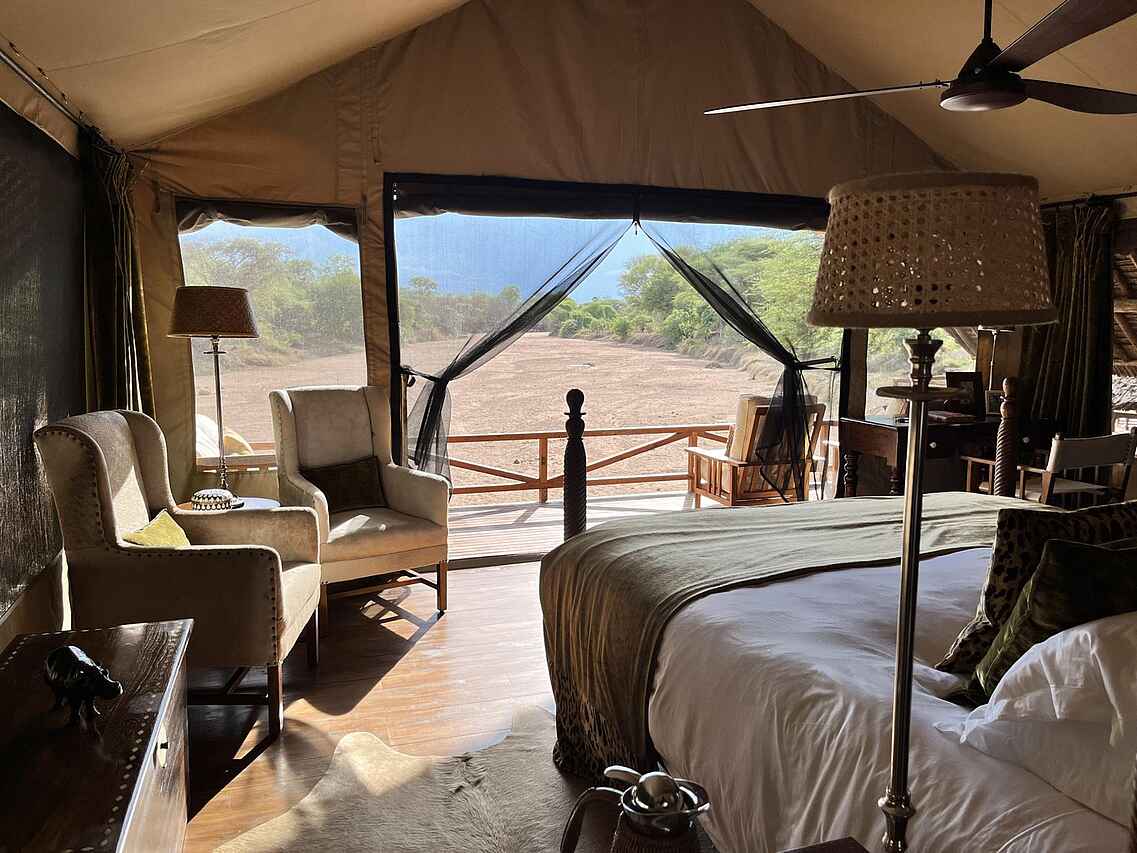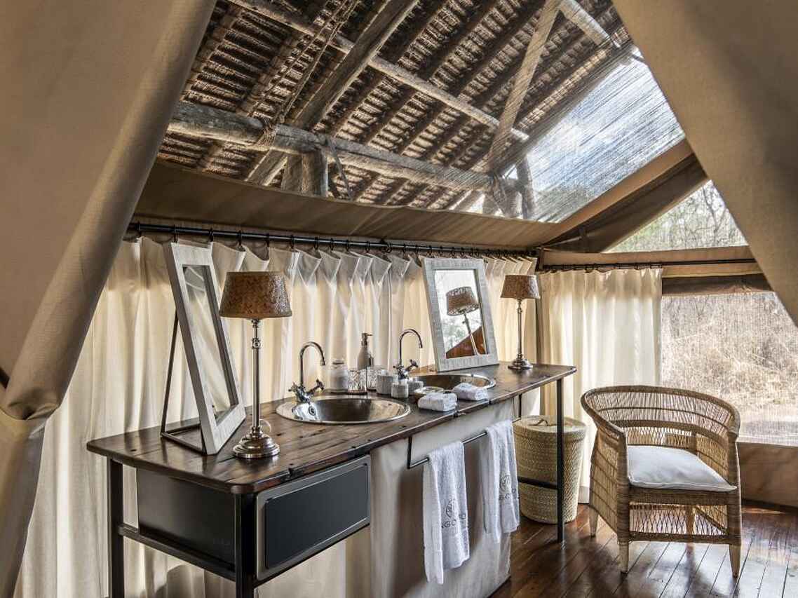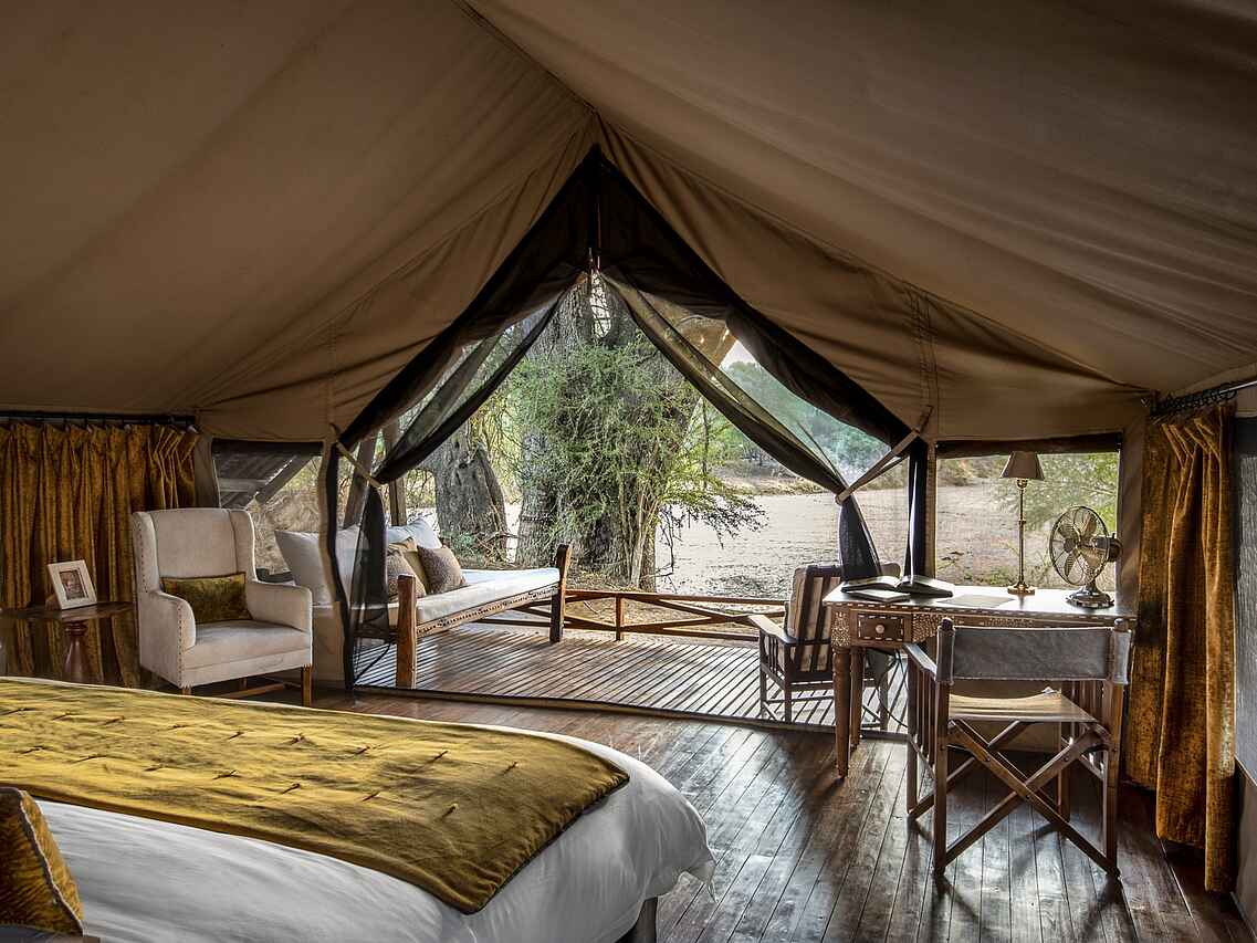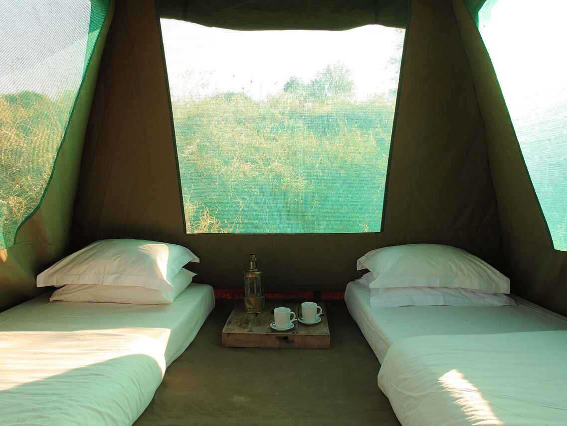 8 gehoben eingerichtete, auf erhöhten Holzplattformen erbaute Segeltuchzelten, die jeweils mit einem zusätzlichen Strohdach zusätzlichen Sonnenschutz bieten. Ausgestattet mit Holzmöbeln: Doppelbett, Nachtisch, Sekretär und Sessel. Eine private Veranda mit Sitz- und Liegegelegenheiten ist dem Schlafbereich vorgelagert. Direkt hinter dem Bett befindet sich ein großes en-suite Bad, das durch eine Segeltuchwand abgetrennt werden kann. Dies wartet mit einem Doppelwaschtisch, einer Spültoilette und einer großen Dusche auf; es stehen 24 Stunden Warm- und Kaltwasser sowie Elektrizität zur Beleuchtung zur Verfügung. Moskitonetze sind an den Seitenwänden als Fenster und als Türen vorhanden. Gängige Toilettenartikel und Wäscheservice, außer Damenunterwäsche, sind inbegriffen.