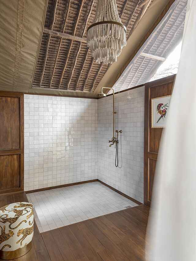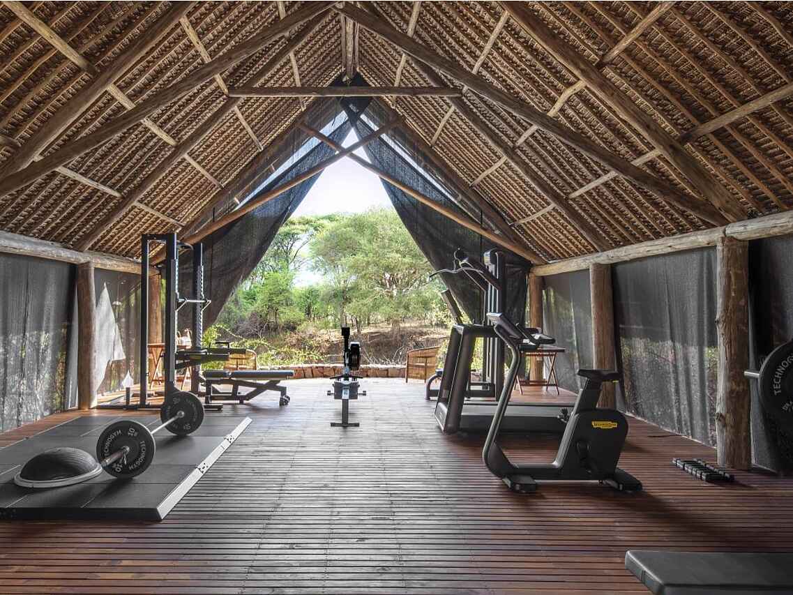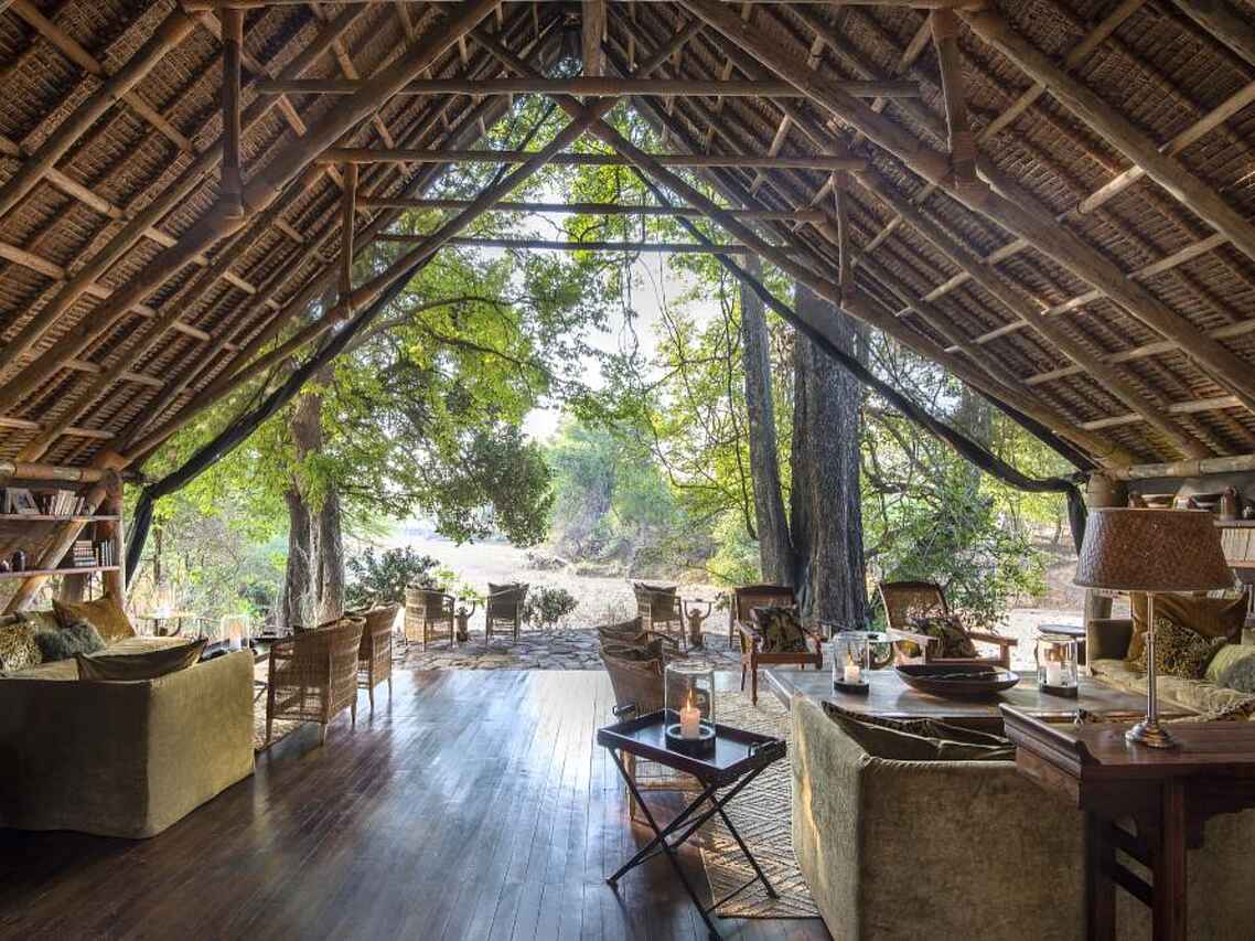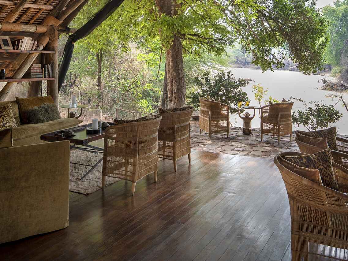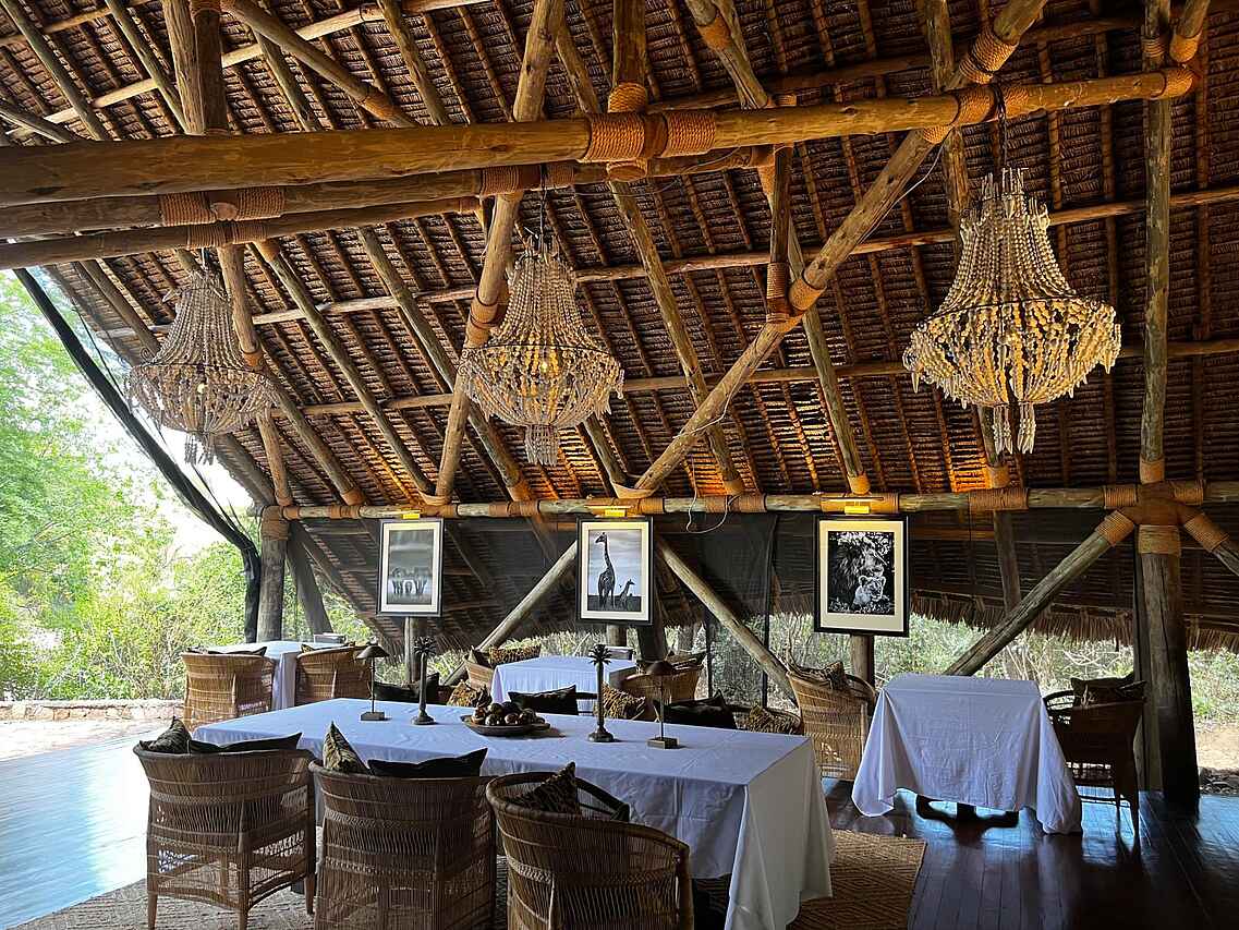 Luftiger Hauptbereich bestehend aus Lounge und Speiseraum, auf erhöhter Plattform mit Holzboden unter strohgedecktem Spitzdach. Der Loungebereich ist mit Sofas, Sesseln und Couchtischen ausgestattet. Hier befindet sich eine Bar sowie eine Bibliothek. Der Speisebereich ist durch einen Gang mit einem kleinen Souvenir- und Kuriositätenshop abgegrenzt. Die offenen Seitenwände sind mit Moskitonetzen bestückt. Darüber hinaus können sich Gäste am Pool, der auch in eine erhöhte Plattform eingelassen ist oder bei einer Massage im Spa entspannen. Steckdosen zum Laden für elektronische Geräte sind vorhanden, ebenso wie eine Internetverbindung.