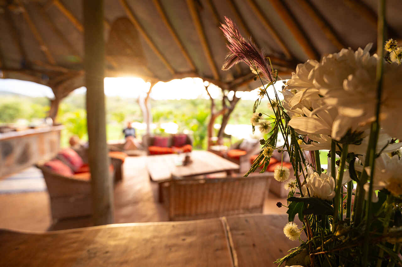 Im Herzen des Palm Camps befindet sich ein offener Gemeinschaftsbereich, der auf einer erhöhten Holzplattform erbaut wurde. Hier gehen Lounge, Bar und Speisebereich ineinander über und bieten durch die offene Bauweise einen weiten Blick auf das Wasser und die umgebende Natur. Bequeme Sitzmöbel laden zum Verweilen ein, während eine gepflegte Rasenfläche vor dem Hauptzelt als zusätzlicher Treffpunkt im Freien dient. WLAN ist über Starlink verfügbar und eine Solarstromanlage versorgt das Camp mit Energie. Abends können sich die Gäste am kleinen Lagerfeuer versammeln und dort den Tag in stimmungsvoller Atmosphäre ausklingen.