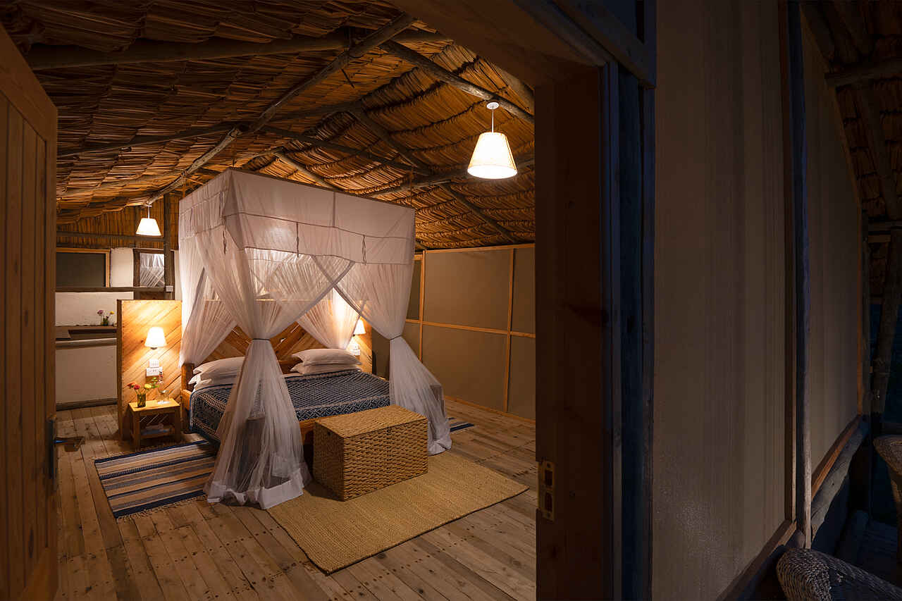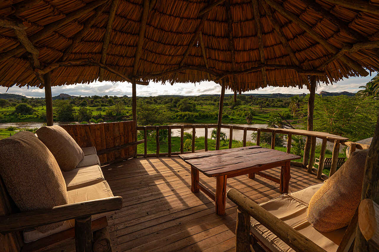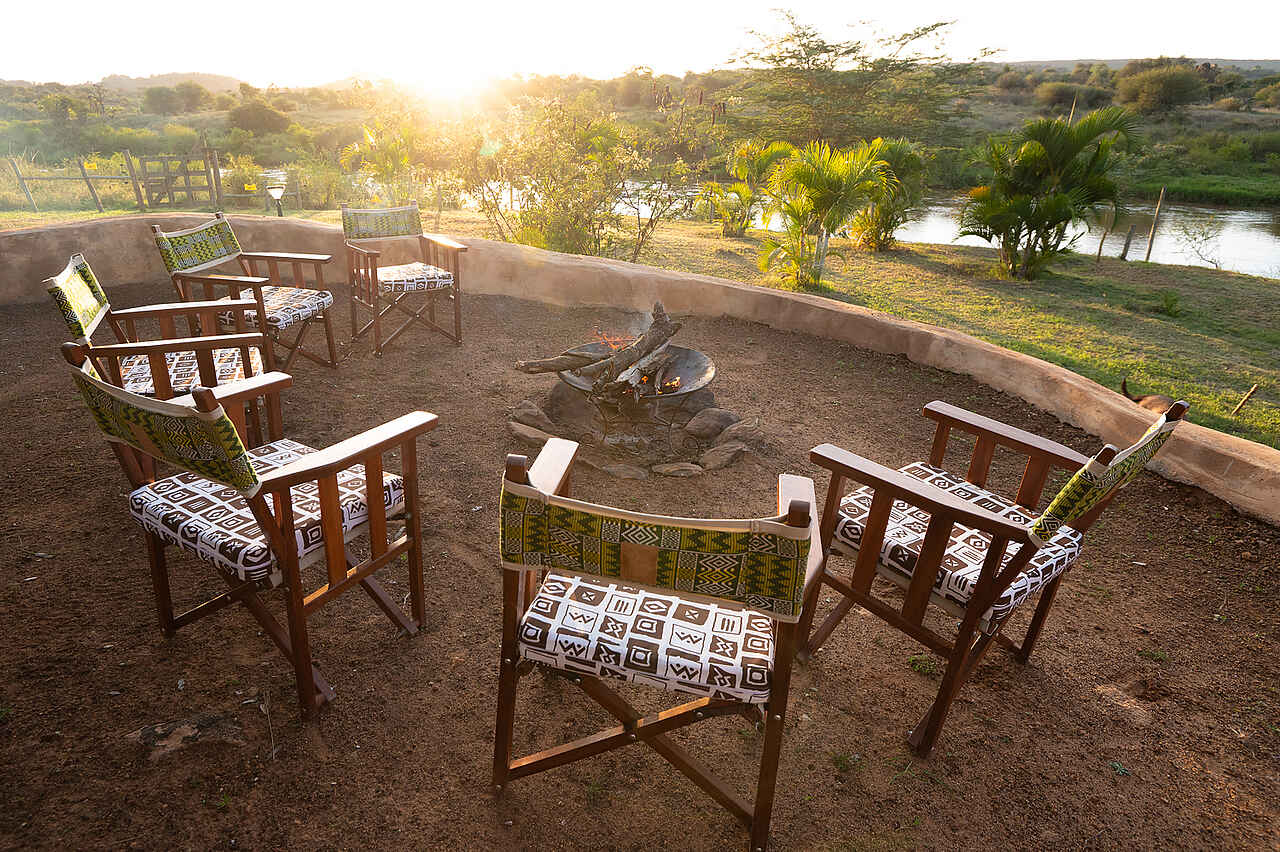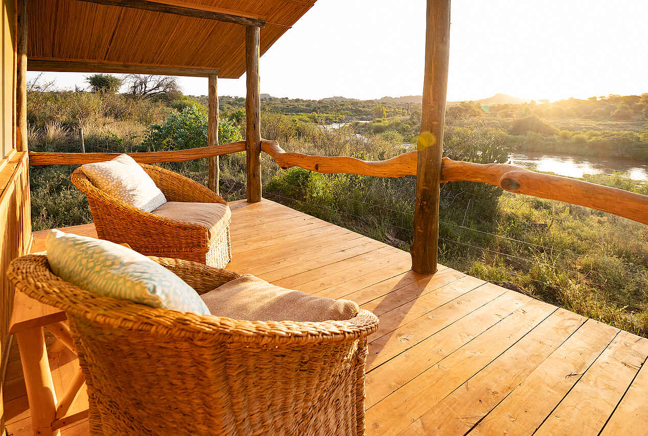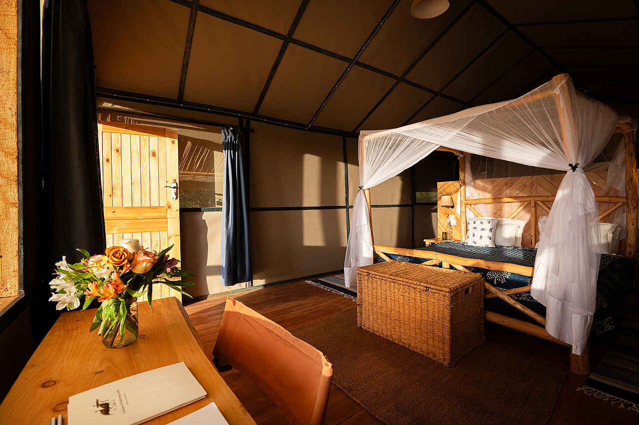 Die fünf Safarizelte stehen auf erhöhten Holzplattformen mit Blick auf den Fluss und bieten viel Platz sowie ein hohes Maß an Privatsphäre. Sie sind mit liebevoll ausgewählten Holzmöbeln ausgestattet, die eine warme Atmosphäre schaffen. Bequeme Betten mit Moskitonetzen und praktische Ablageflächen sorgen für Komfort. Das En-suite-Badezimmer in jedem Zelt verfügt über Dusche, Spültoilette und Waschbecken, fließendes Warm- und Kaltwasser ist selbstverständlich vorhanden. Handtücher und Pflegeprodukte liegen für die Gäste bereit. Dank der durchdachten Anordnung genießt jedes Zelt einen ungestörten Blick in die umliegende Natur.