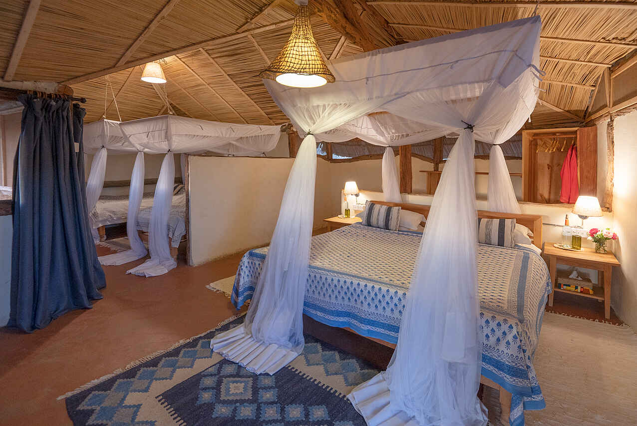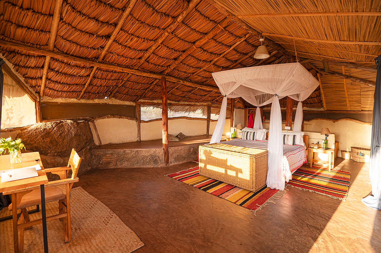 Die vier reetgedeckten Cottages des Laikipia Wilderness River Camp stehen auf Holzplattformen und bieten ein hohes Maß an Privatsphäre. Die Ausstattung ist bewusst schlicht gehalten, dabei komfortabel und funktional. Bequeme Doppel- oder Einzelbetten mit Moskitonetzen, rustikale Holzmöbel und farbenfrohe Stoffe prägen das zurückhaltend gestaltete Interieur. Zwei der Cottages sind ideal für Familien ausgelegt und verfügen über zusätzlichen Raum sowie flexible Schlafmöglichkeiten für Kinder. Alle Unterkünfte besitzen ein halboffenes Badezimmer mit Spültoilette, Waschbecken und einer heißen Dusche. Handtücher, nachhaltige Pflegeprodukte sowie weitere Annehmlichkeiten stehen bereit.