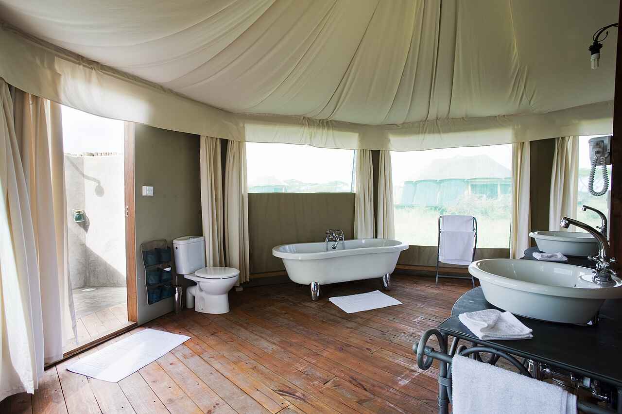20 Zelte mit Doppel- Twin- oder Dreibettbelegung. In einem offenen Holzkonstrukt auf Stelzen und mit Zeltleinwänden erbaut, verfügt jedes Zelt über eine Veranda mit Korbmöbeln sowie Schlafbereich mit Bett, Kommode und kleinem Schreibtisch. Die sanitären Anlagen befinden sich im hinteren Bereich. Hier gibt es Kalt- und Warmwasser, Spültoilette, Badewanne, zwei Waschbecken, Schrank und Außendusche.