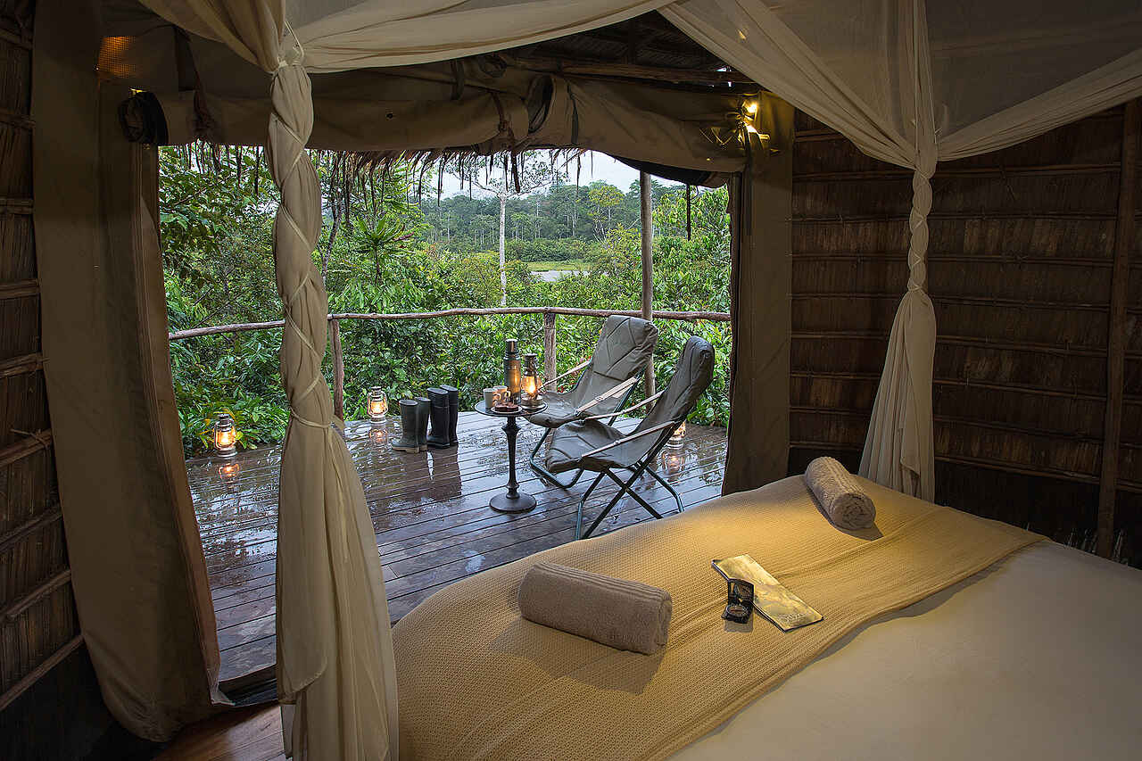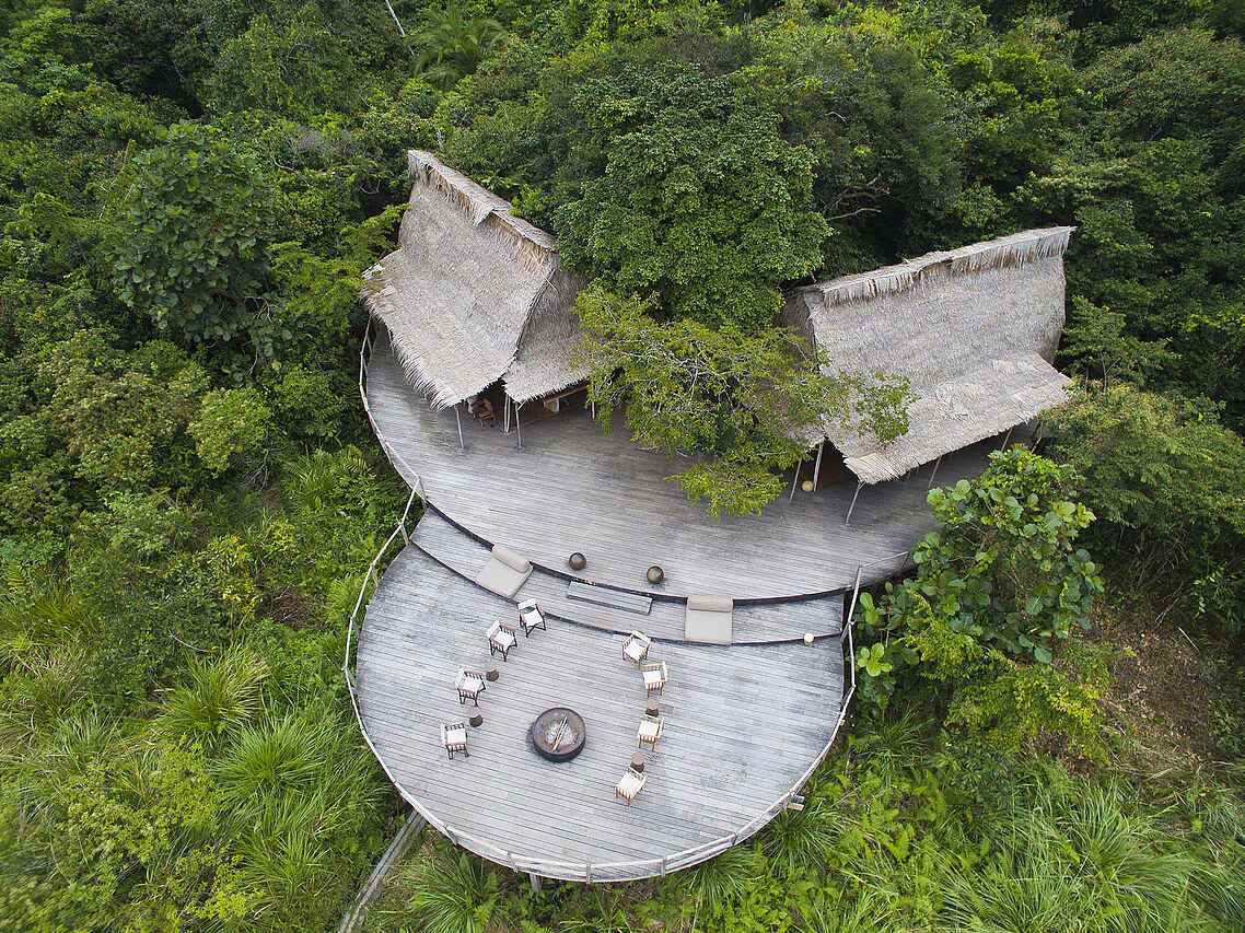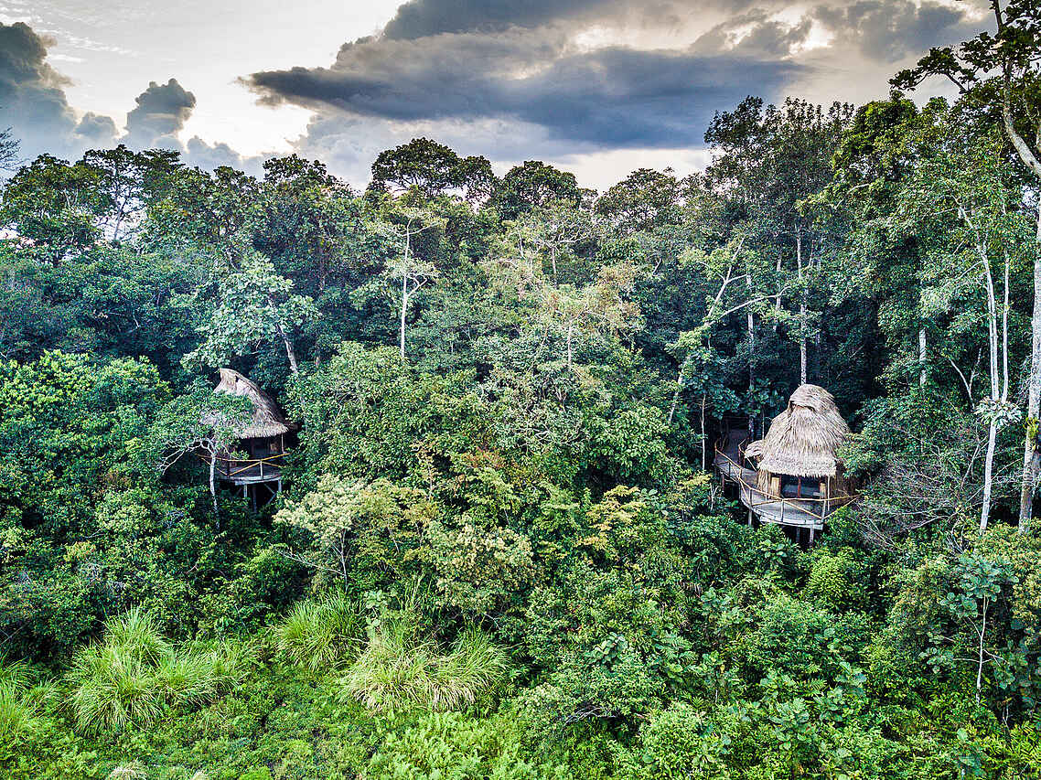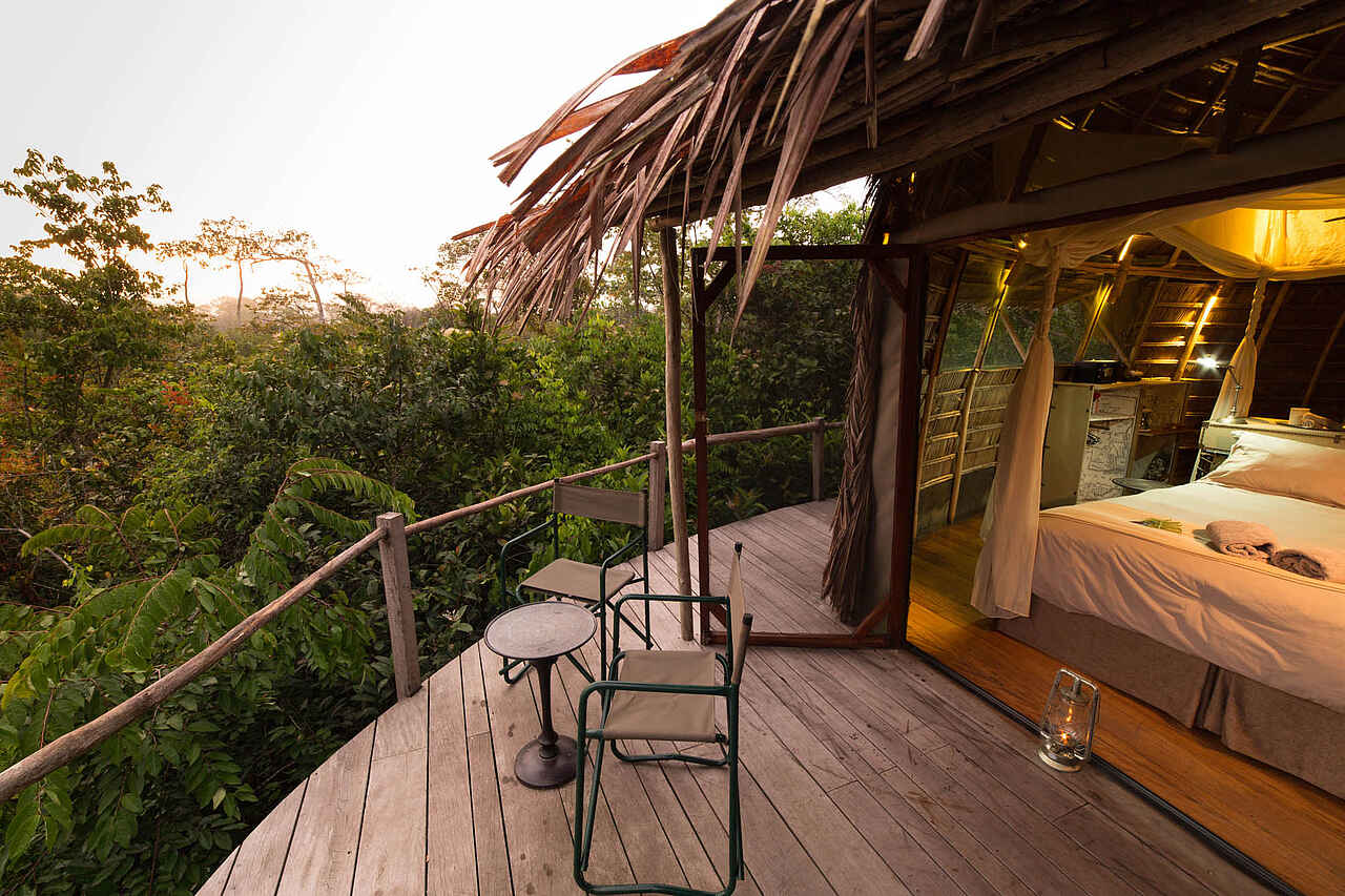6 Baumhäuser sind von der Hauptlodge via Stegen zu erreichen. Sie liegen ca. 40 Meter auseinander und stehen ebenfalls erhoben auf Plattformen etwas unterhalb der Baumkronen. Sie sind ebenfalls in regionaltypischer Bauweise mit natürlichen Materialien gefertigt. Ein Rahmen aus Rundhölzern wird mit dem charakteristischen Flechtwerk aus Bambuspalmwedeln gedeckt. Die Hütten sind konusförmig mit einer großen Glastüre als, die vom Bett aus direkte Sicht auf die kleine Veranda und darüber hinaus auf die Lagune gibt. Die Inneneinrichtung wird von einem Queensize Bett unter Ventilator und Moskitonetz dominiert. Dahinter befindet sich der Waschbereich mit Waschbecken und hinter einem Sichtschutz die Dusche mit Toilette. Auf der privaten Veranda gibt es zwei Faltstühle und ein Kaffeetischen. Strom wie in den zentralen Einrichtungen vorhanden. Fließend Warm- und Kaltwasser.