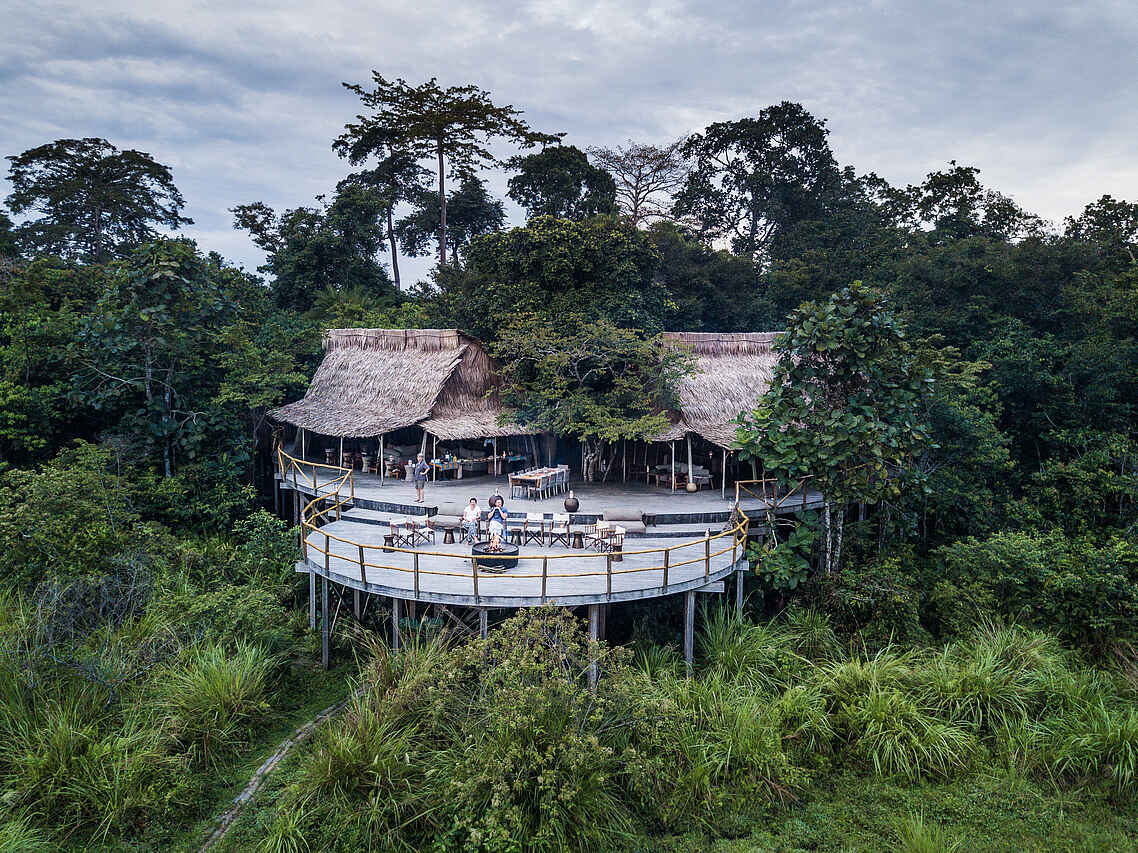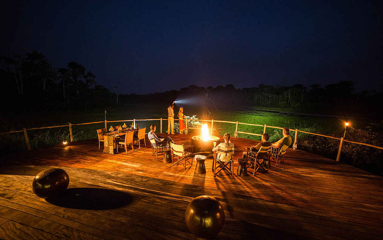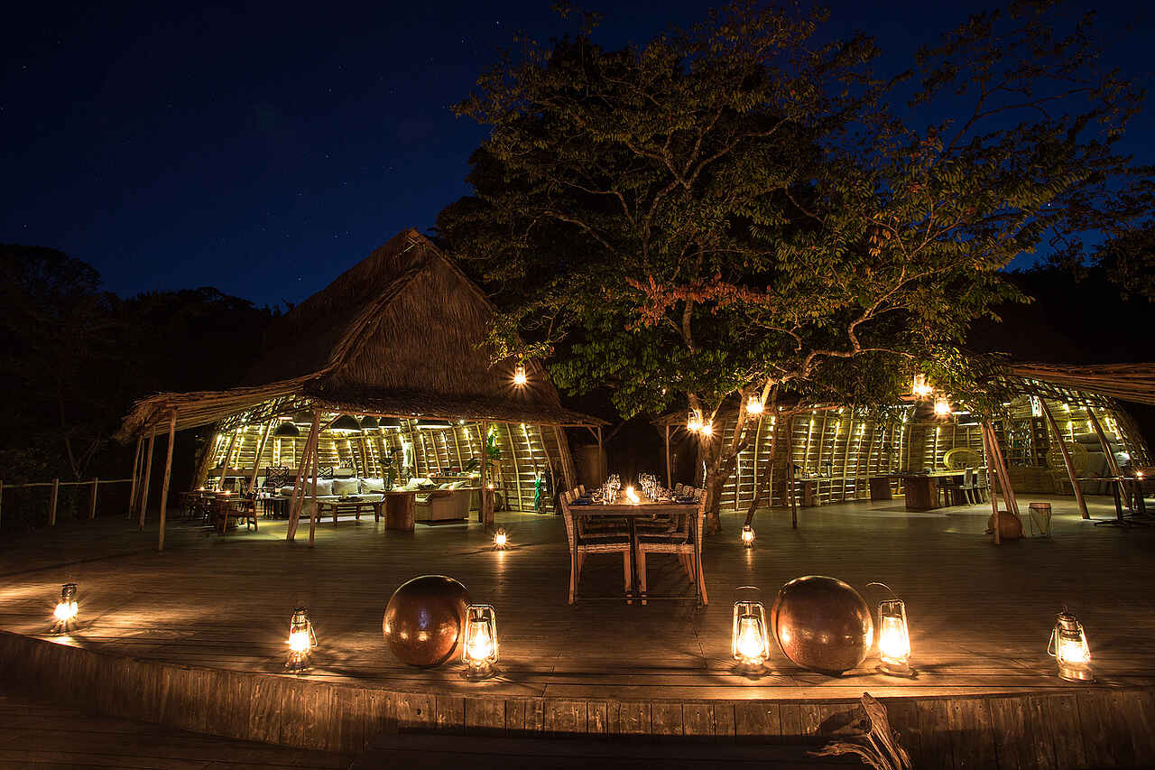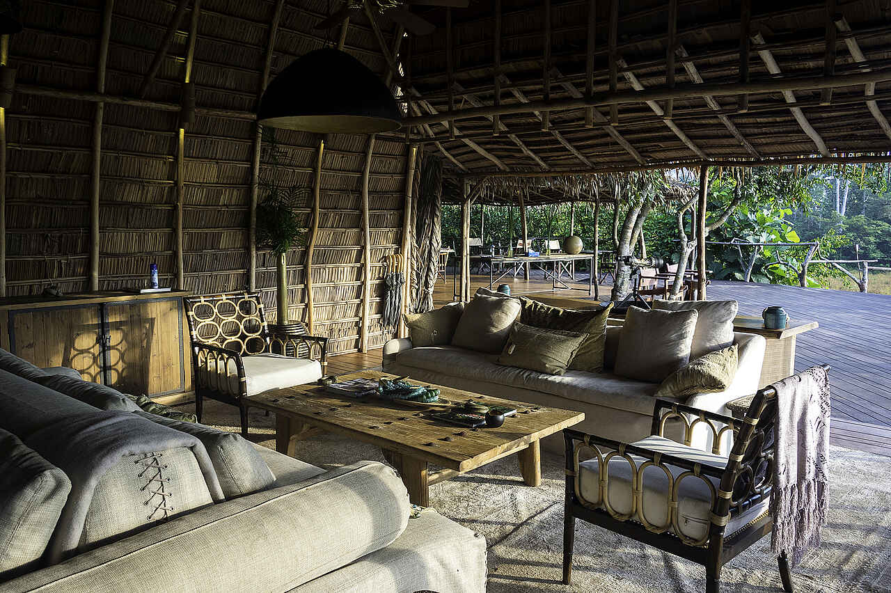 Zwei hohe Langhütten mit offener Fassade beherbergen die Lounge, Speisesaal und Bar. Sie wurden nach ortstypisch Bauweise errichtet: ein Rahmen aus Rundhölzern trägt dabei dichtes Flecht- und Palmwerk. Beide Hütten stehen ca. 4 Meter erhoben auf einer soliden Plattform mit direktem Übergang zur Terrasse bzw. dem Viewing Deck, wo sich auch die Feuerstelle befindet. Markant ist der direkte Blick auf die Lango Bai. Die Lounge ist mit mehrere Sitzgruppen bestehend aus Sofas, Lehnstühlen und Cocktailtischen ausgestattet. Materialien sind heller Canvas und Holz. Auf der Terrasse befinden sich mehrere Segeltuchlehnstühle. Hier kann Abends auch zum Dinner gedeckt werden. Ein Steg führt zum Fluss. Dort befindet sich eine kleine Plattform, die für Sundowners genutzt wird. Elektrischer Strom mit 220V DC, afrikanische Stecker mit europäischen Adaptern. WiFi und Safe im Büro des Managements. Wäscheservice als Handwäsche mit Lufttrocknung.