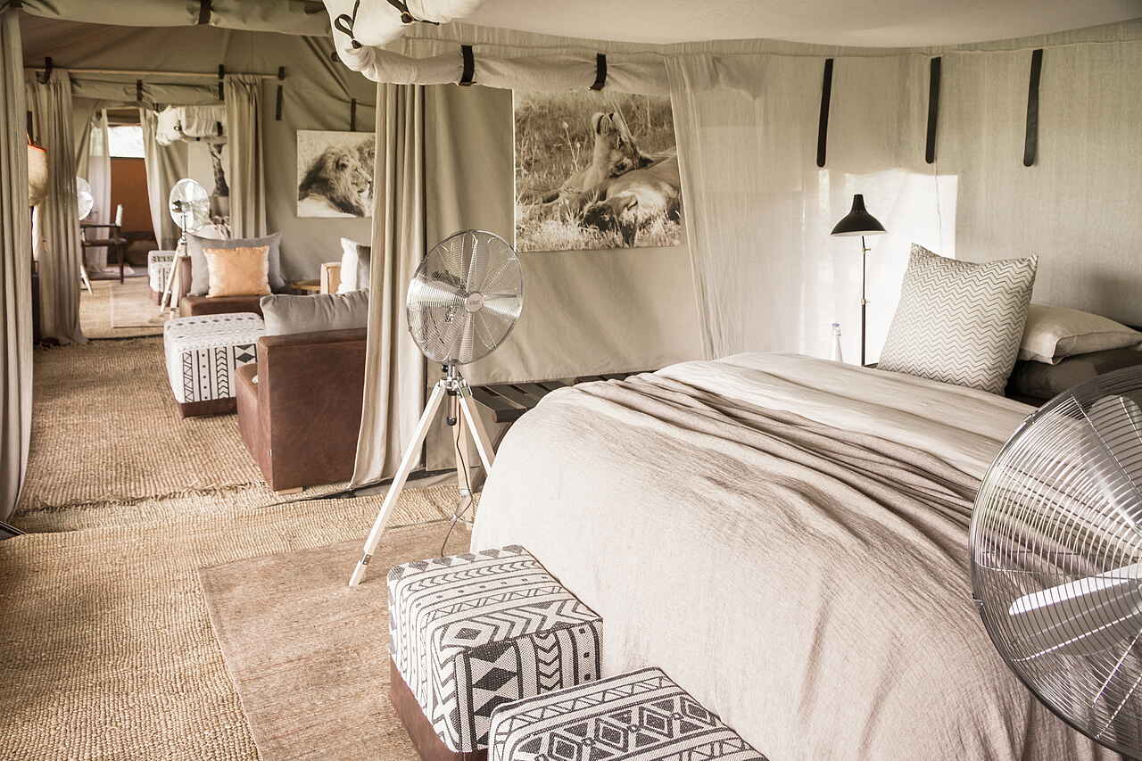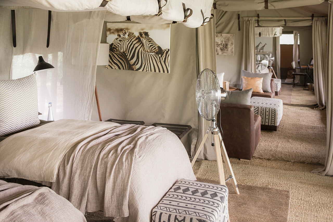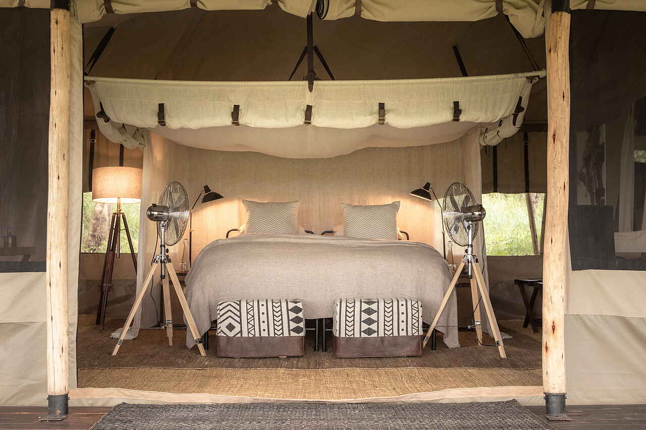 Die Gäste schlafen in einem der 5 elegant und im Safaristil designten Leinwandzelte oder im Familienzelt. Die Farben in den Zelten sind hell und natürlich, Weiß und Braun dominieren. Die Böden sind mit großen Bastteppichen ausgelegt. Über den Doppelbetten sind Moskitonetze ausgespannt, zur weiteren Ausstattung gehören Ventilator, Terrasse, Safe und Haartrockner. Die Badezimmer verfügen über zwei Waschbecken, eine moderne Toilette und eine Dusche.