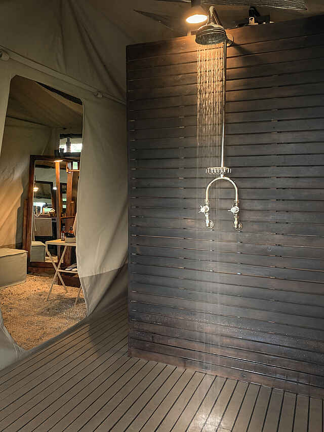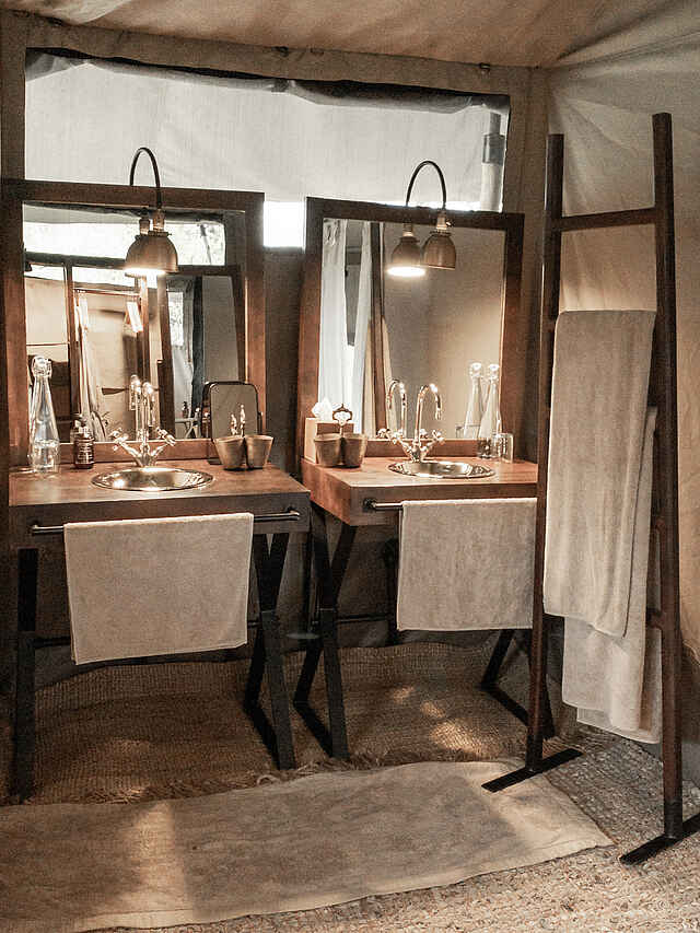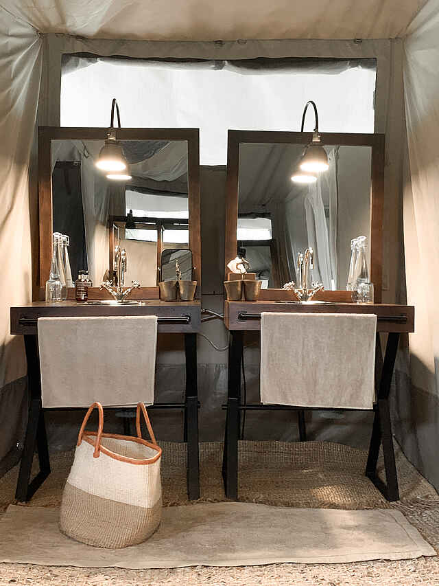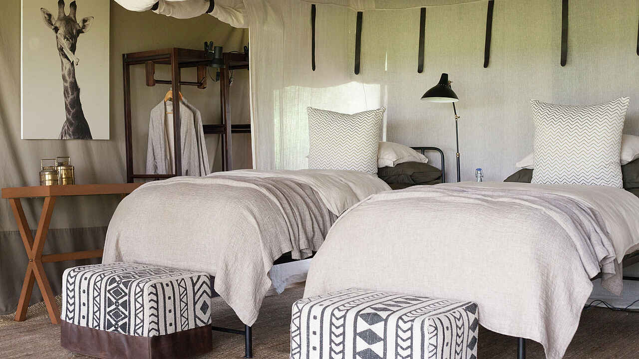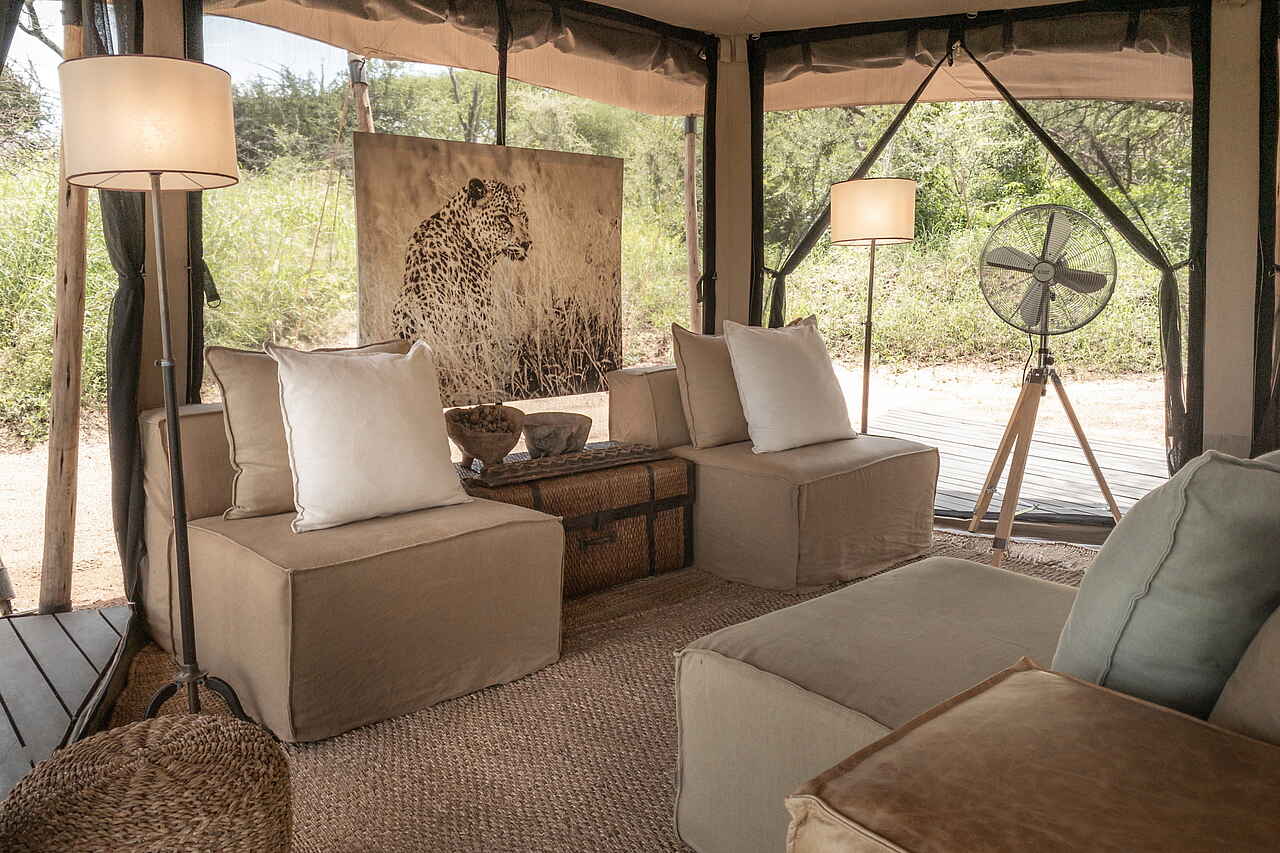 Die Gäste schlafen in einem der 5 elegant und im Safaristil designten Leinwandzelte oder im Familienzelt. Die Farben in den Zelten sind hell und natürlich, Weiß und Braun dominieren. Die Böden sind mit großen Bastteppichen ausgelegt. Über den Doppelbetten sind Moskitonetze ausgespannt, zur weiteren Ausstattung gehören Ventilator, Terrasse, Safe und Haartrockner. Die Badezimmer verfügen über zwei Waschbecken, eine moderne Toilette und eine Dusche.