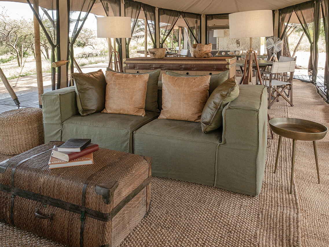 Das Familienzelt bietet zwei Schlafzimmer mit jeweils eigenem Bad sowie eine gemeinsame, dazwischen gelegene Lounge mit gemütlichen Sofas und Sesseln.