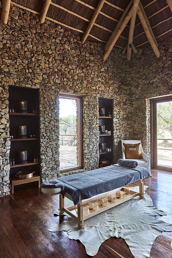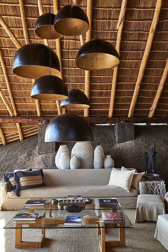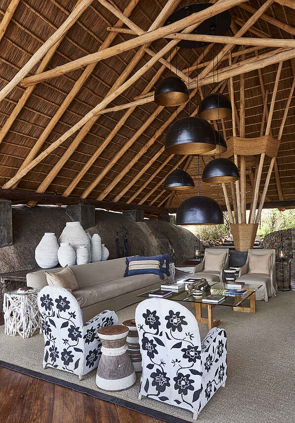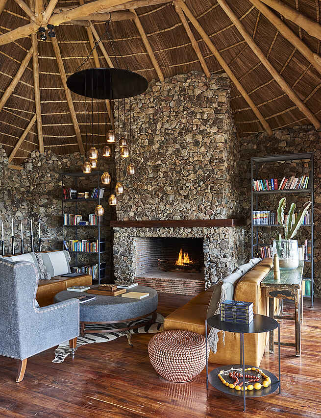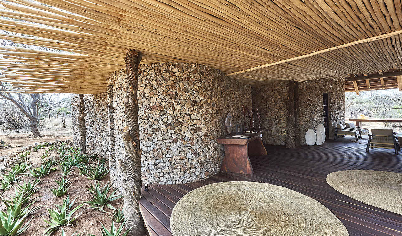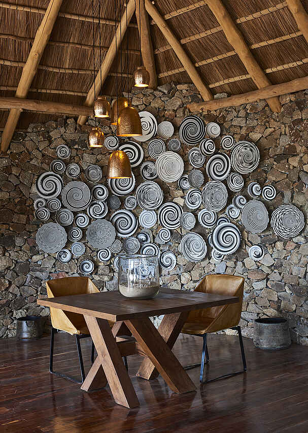 Das dominierende, architektonische Gestaltungsmitte sind Mauern aus hellen Natursteinen. Man findet sie in den Lounges, beim Kamin, in den Durchgänge, an der Bar und einfach als Außenmauer der Gebäude. Hier und da werden aber auch die Felsen der Umgebung in die Konstruktion der Lodge einbezogen.
