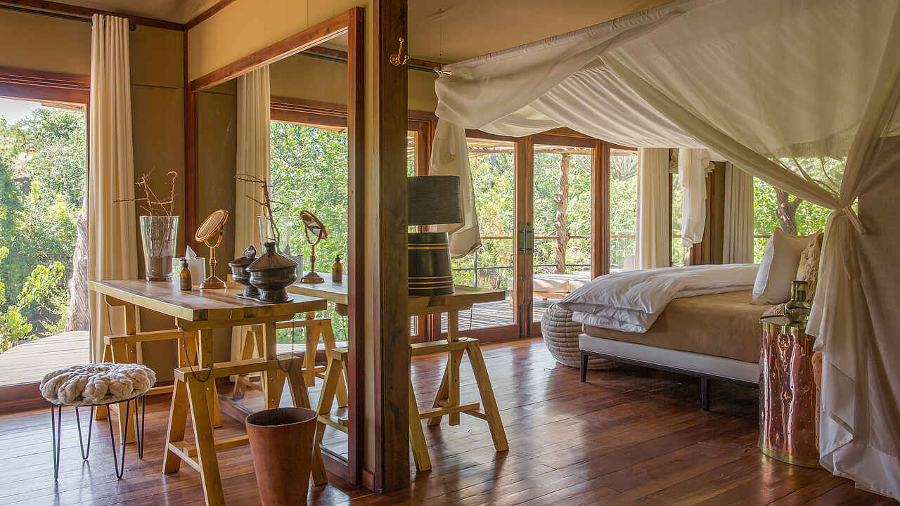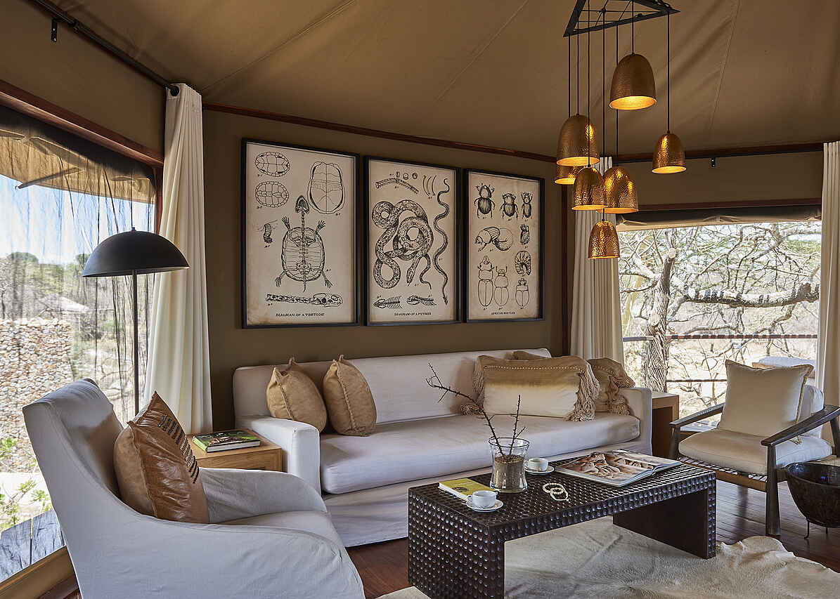 Es gibt 10 Zeltsuiten für jeweils 2 erwachsene Personen. Legendary Mwiba Lodge verfügt über 4 Zustellbetten, sodass auf Anfrage auch Dreibettzimmer angeboten werden. Zwei Suiten-Paare sind untereinander verbunden, können aber ohne Beeinträchtigung der Privatsphäre getrennt gebucht werden. Man wählt zwischen Doppel- oder Einzelbetten. Die Betten stehen unter großen Moskitonetzen auf Holzfußböden. In den Zeltsuiten bilden Sofas und Sessel Sitzgruppen wie für ein privates Wohnzimmer. In der Inneneinrichtung dominieren helle und warme Töne. Große Glastüren öffnen sich zu einem privaten Deck mit bequemen Liegesesseln. Die Veranda wird weitausladend überdacht.
