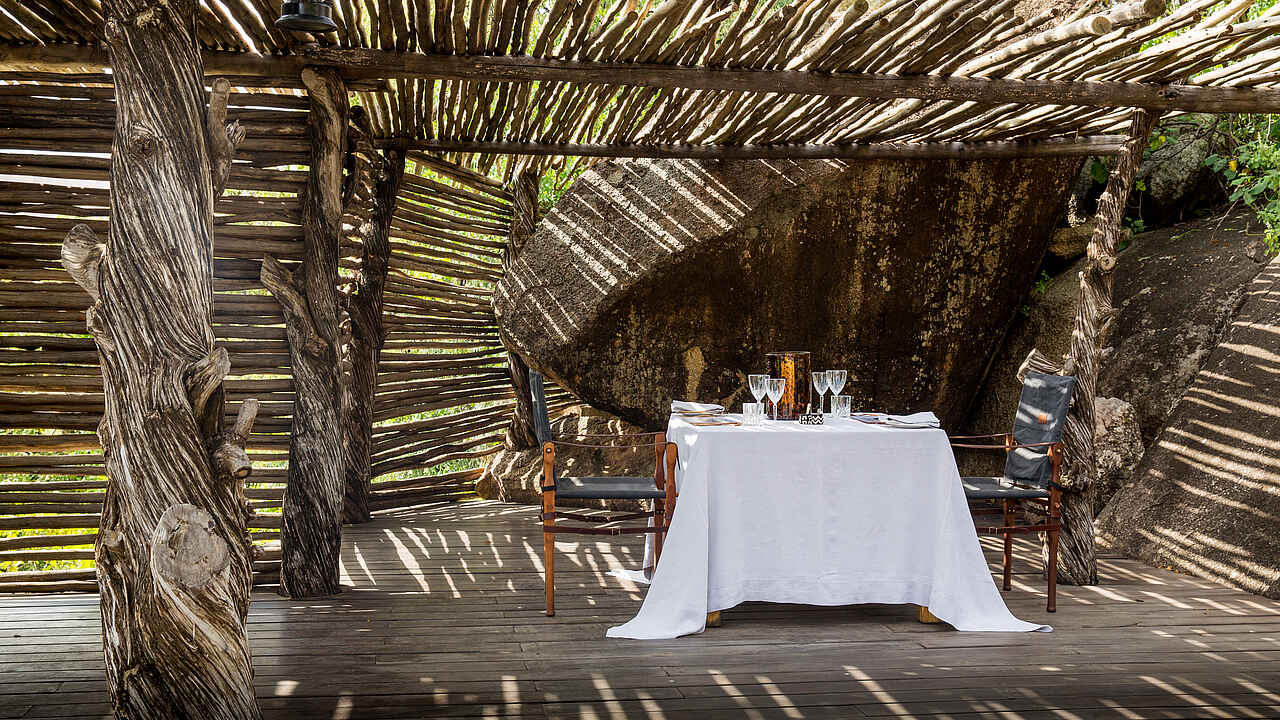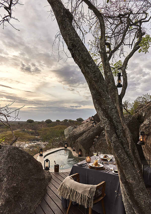Etwas versteckt zwischen Felsen und oberhalb des Flussbettes gibt es einen Jacuzzi, den man sozusagen privat nutzt, der aber überwiegend als Ort für private Dinner genutzt und darum mit Laternen ausgeleuchtet wird.